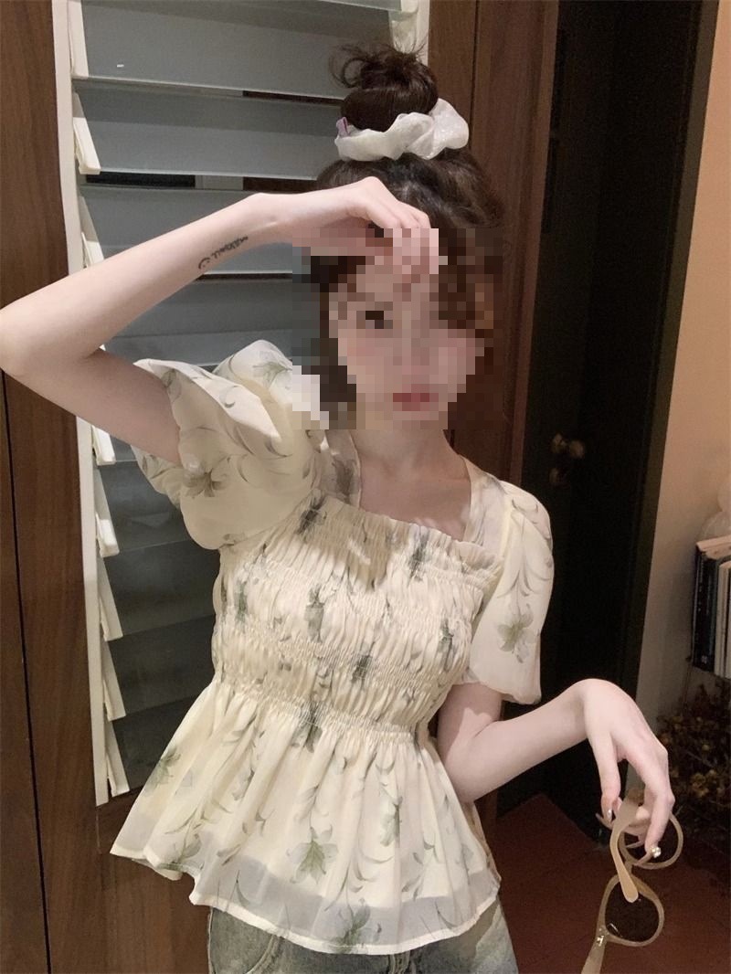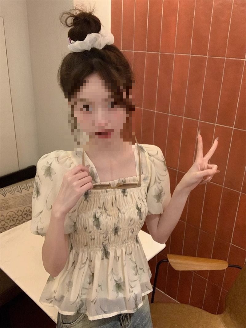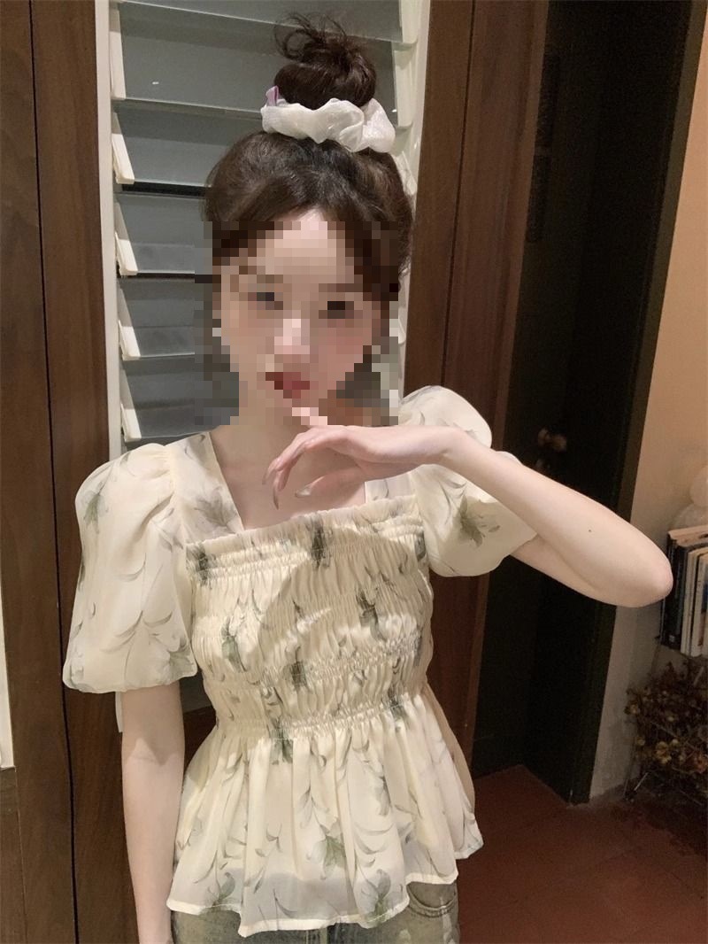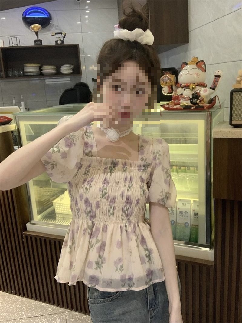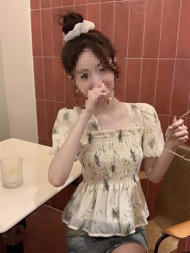 한국 스타일 달콤한 꽃 쉬폰 탑 여름 느슨한 스퀘어 칼라 퍼프 슬리브 디자인 틈새 선 스크린 셔츠 여성용스토어 가기