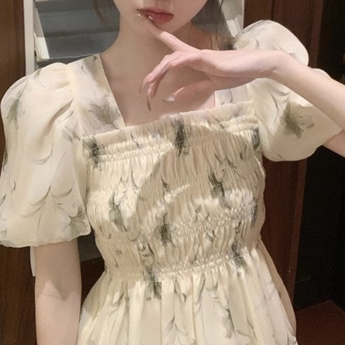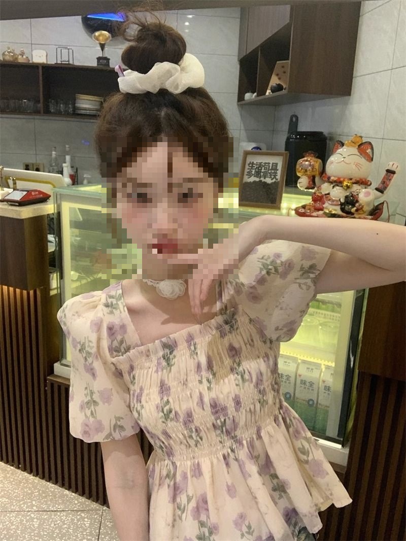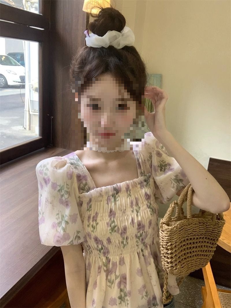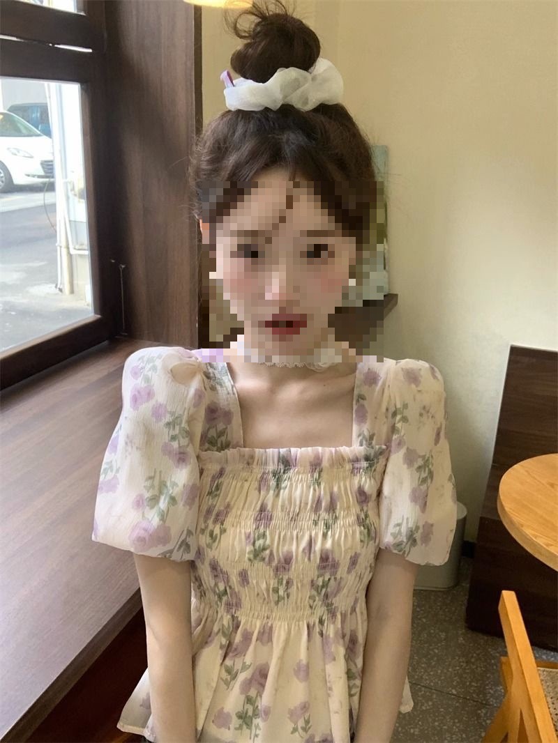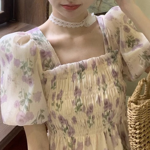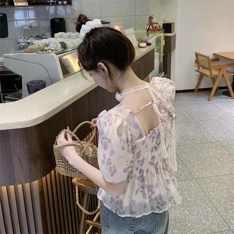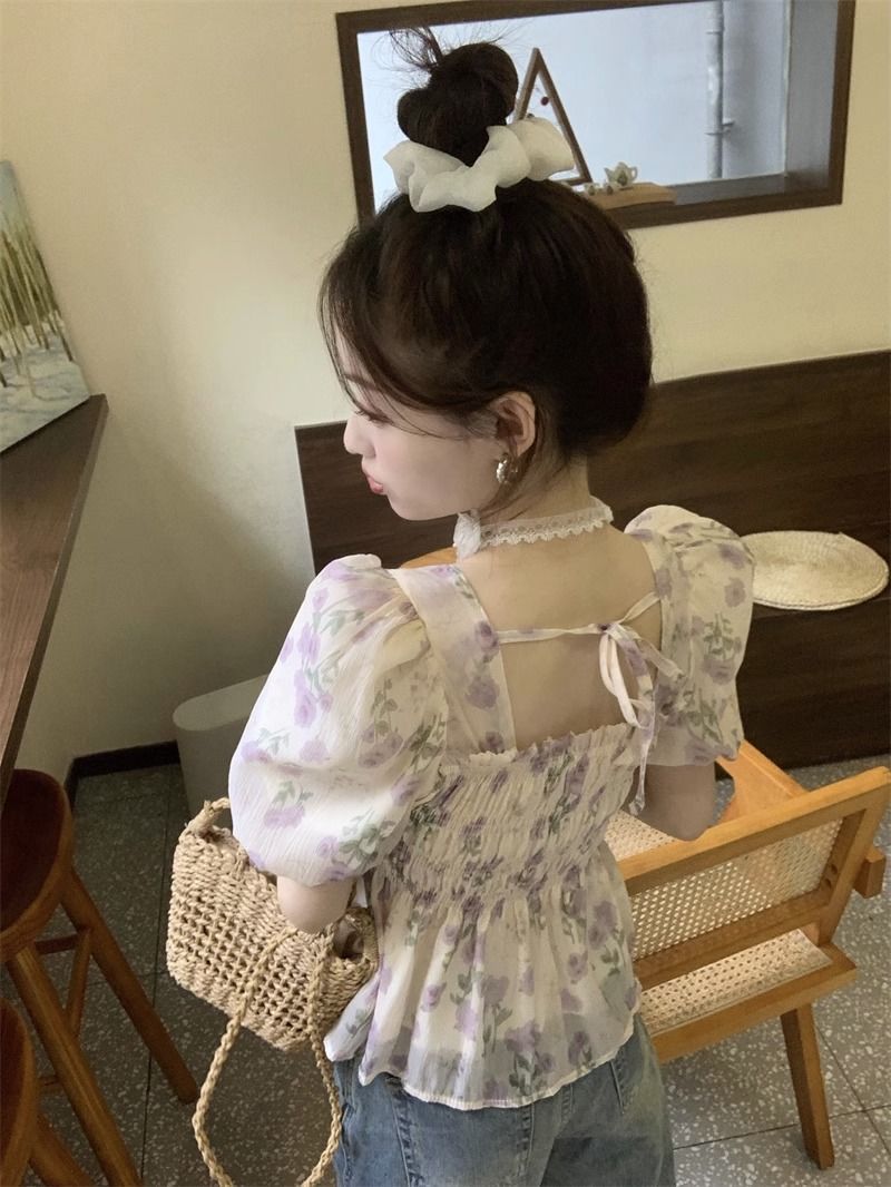 한국 스타일 달콤한 꽃 쉬폰 탑 여름 느슨한 스퀘어 칼라 퍼프 슬리브 디자인 틈새 선 스크린 셔츠 여성용스토어 가기