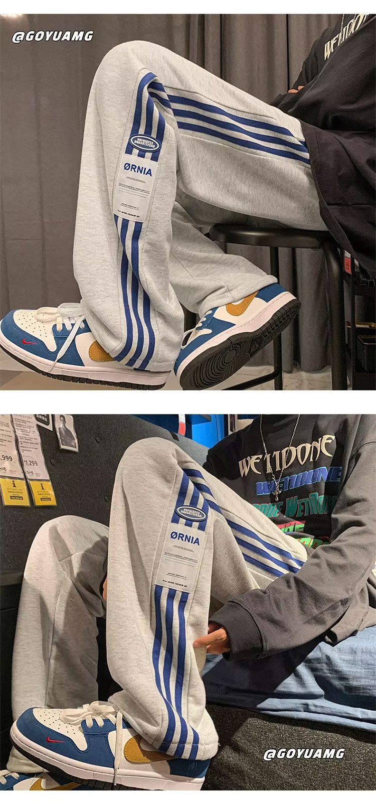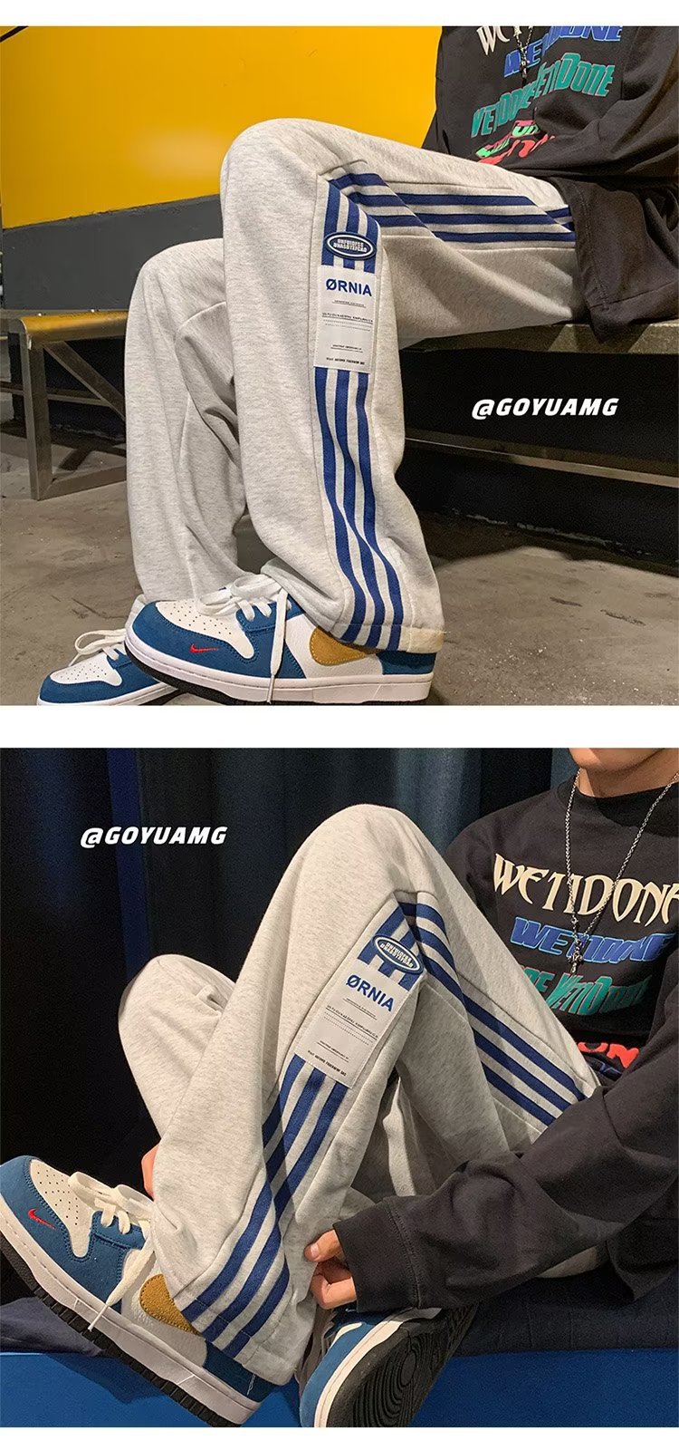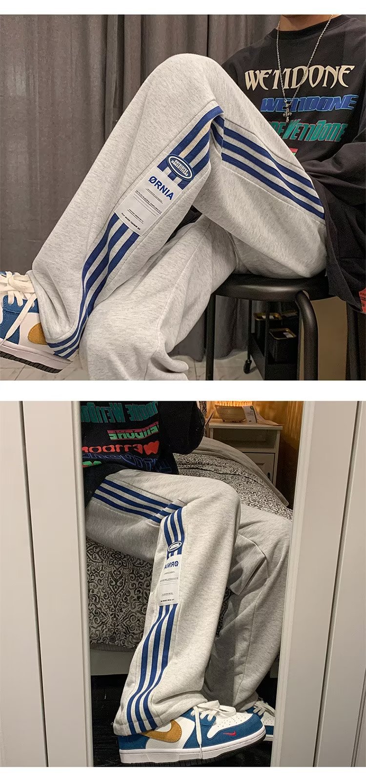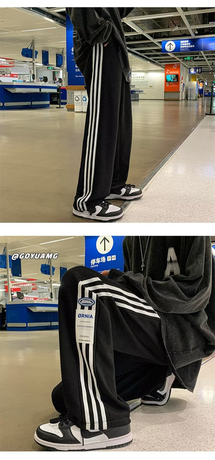 트렌디 브랜드 스트라이프 캐주얼 바지 남자의 봄과 가을 무거운 기모 와이드 레그 스트레이트 팬츠 홍콩 스타일 플러스 사이즈 느슨한 스포츠 바지스토어 가기