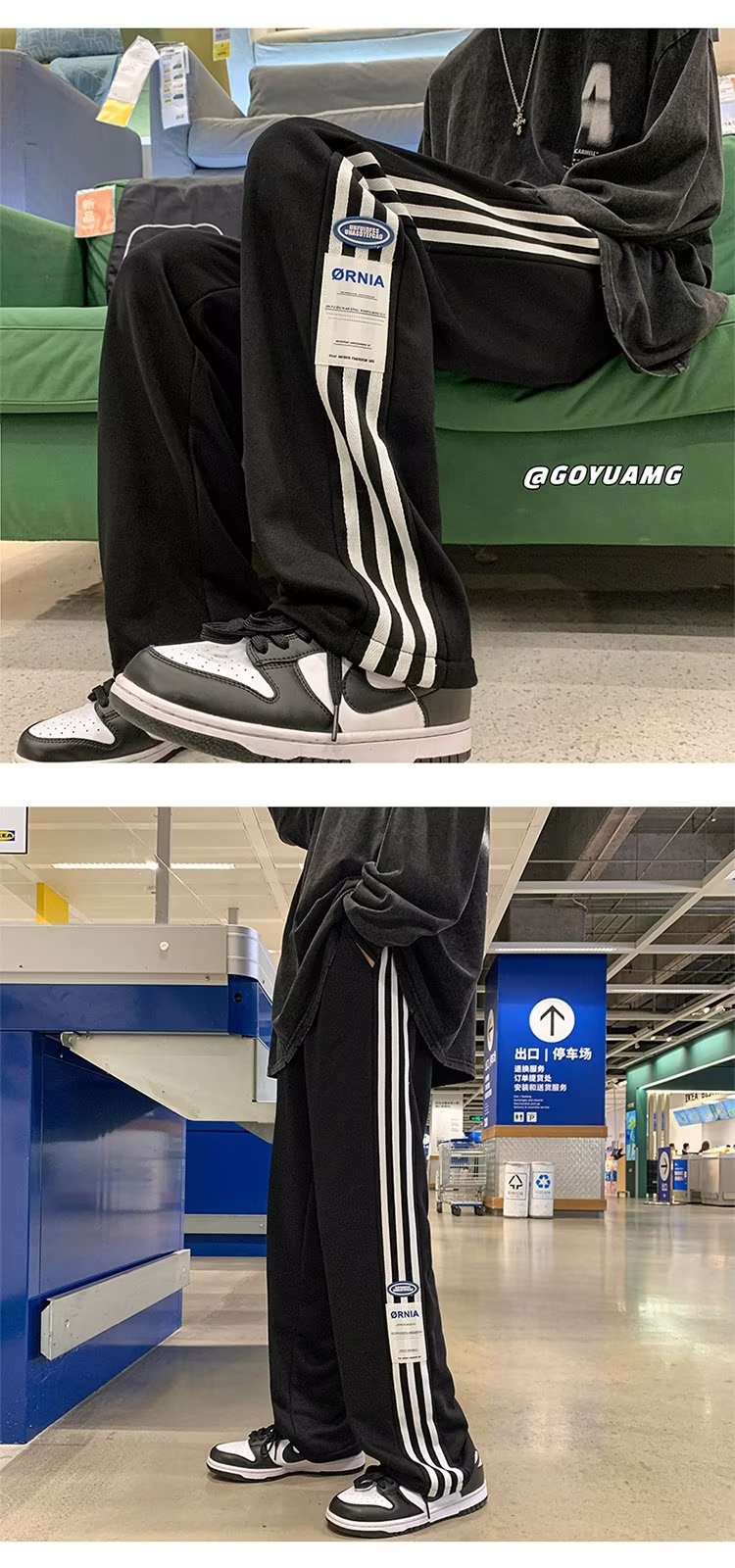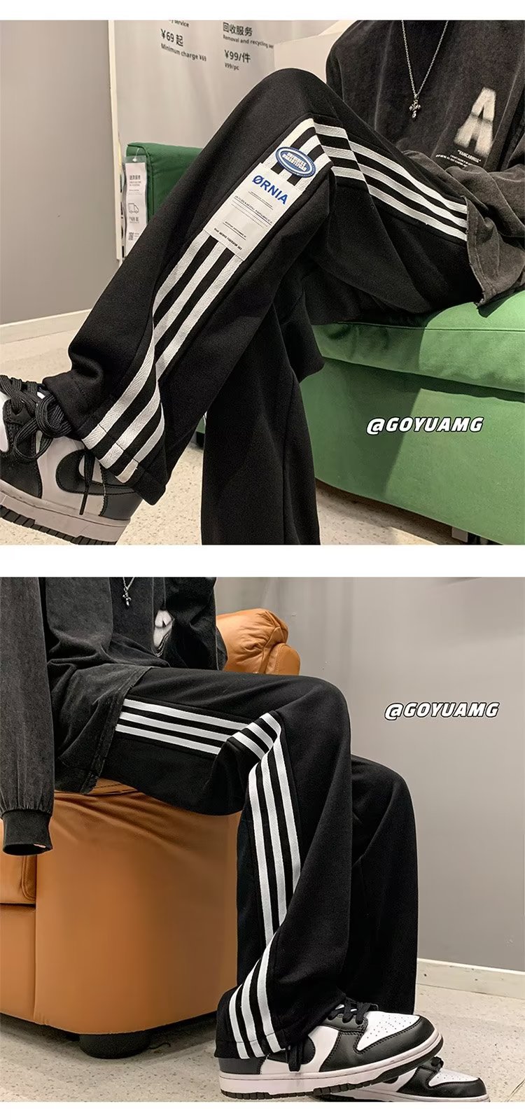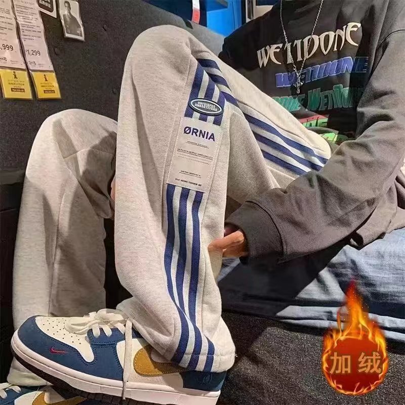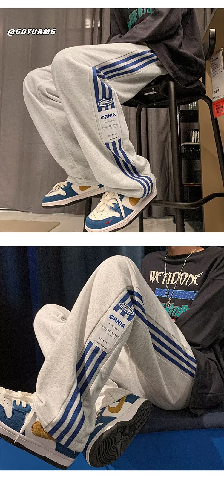 트렌디 브랜드 스트라이프 캐주얼 바지 남자의 봄과 가을 무거운 기모 와이드 레그 스트레이트 팬츠 홍콩 스타일 플러스 사이즈 느슨한 스포츠 바지스토어 가기