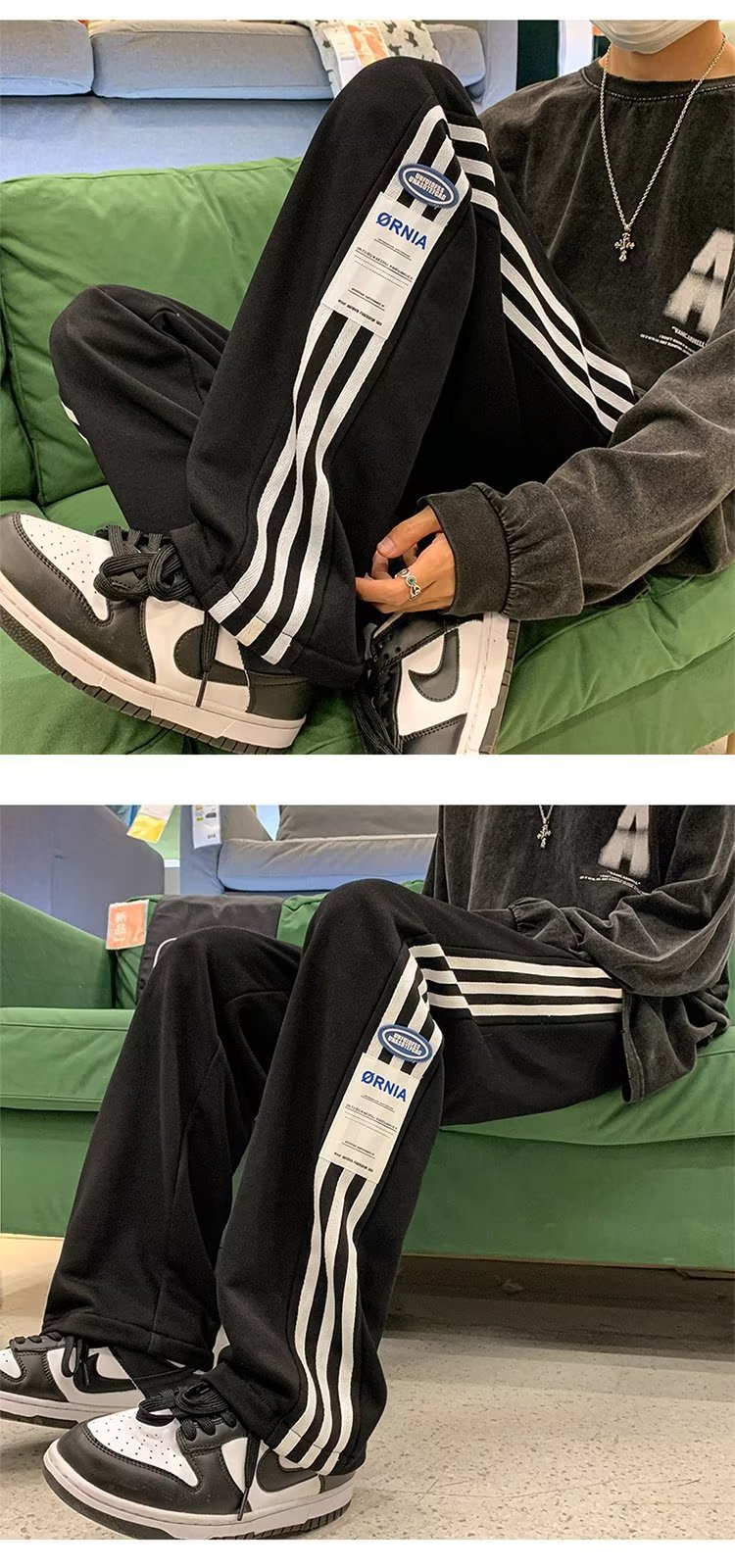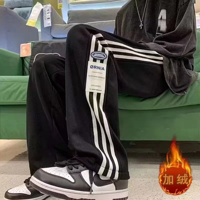 트렌디 브랜드 스트라이프 캐주얼 바지 남자의 봄과 가을 무거운 기모 와이드 레그 스트레이트 팬츠 홍콩 스타일 플러스 사이즈 느슨한 스포츠 바지