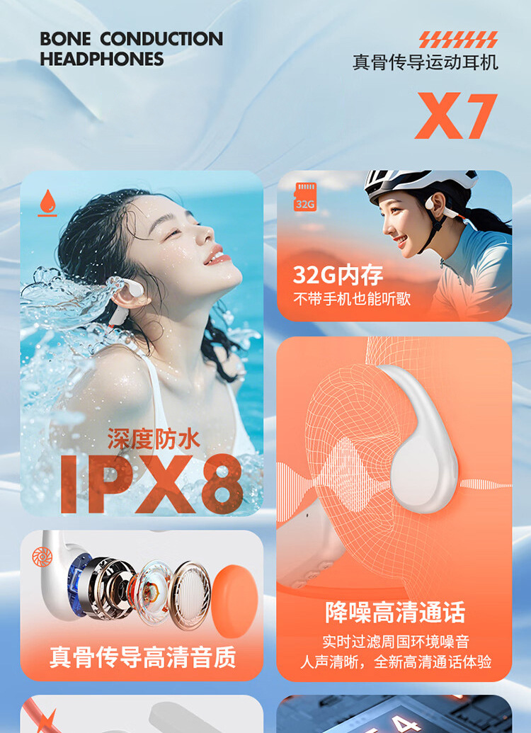 음악 듣기용 x7s 수영 헤드폰, 32g 메모리 무선 골전도 블루투스 헤드폰 도매 OEM 국경 간 전용 공급스토어 가기