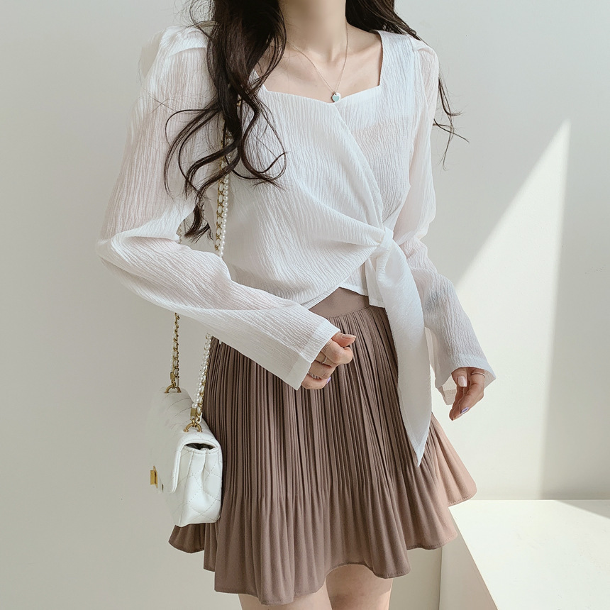 봄과 가을 탑 디자인 센스 패션 2023 한국식 스퀘어 칼라 셔츠 버블 긴팔 스트랩 슬림 우아한 셔츠 여성용