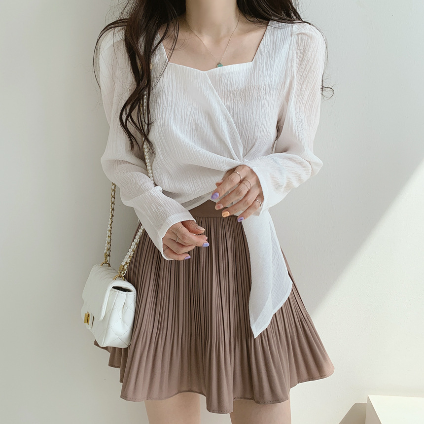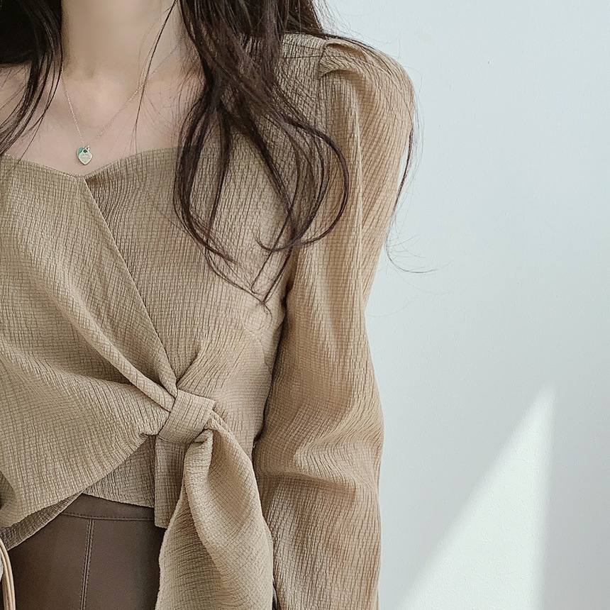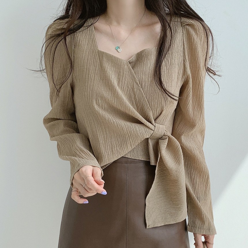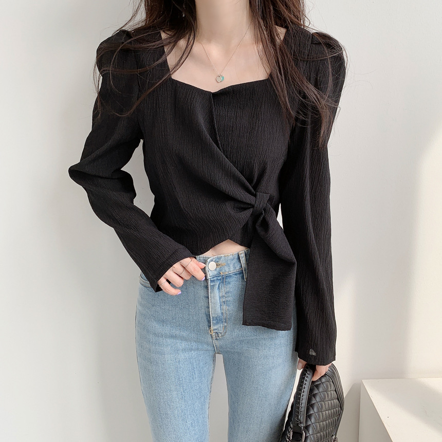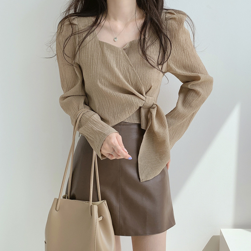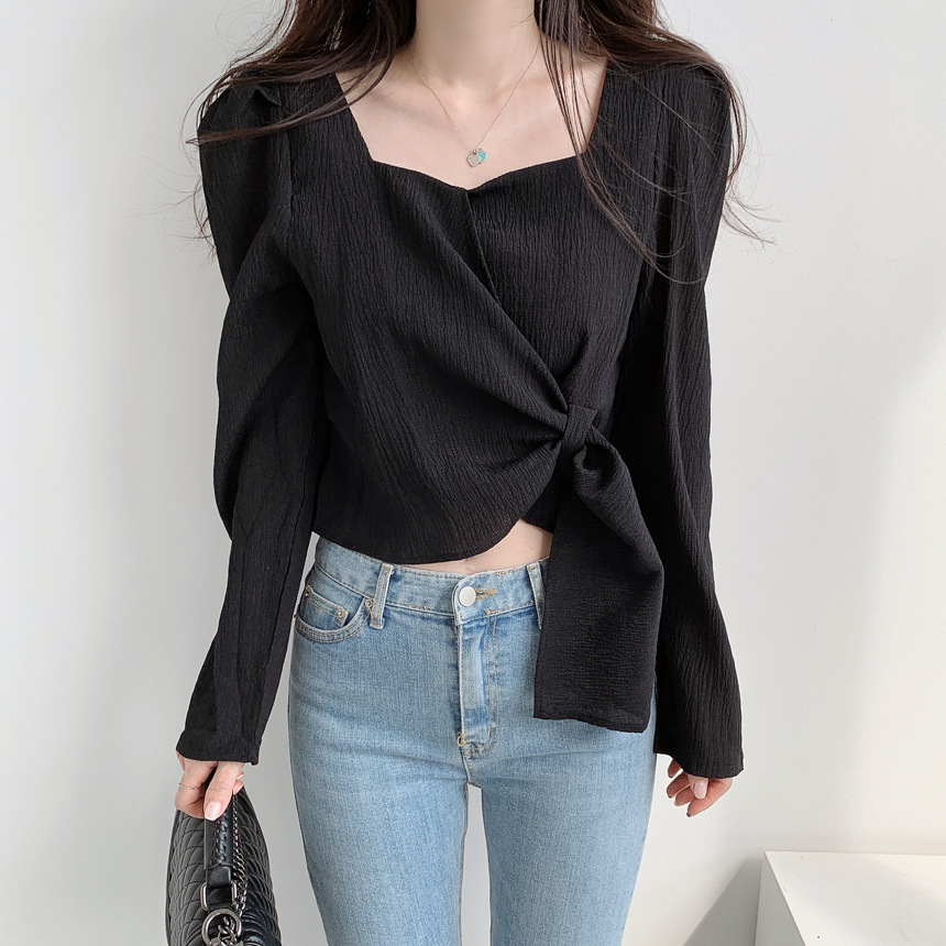 봄과 가을 탑 디자인 센스 패션 2023 한국식 스퀘어 칼라 셔츠 버블 긴팔 스트랩 슬림 우아한 셔츠 여성용스토어 가기
