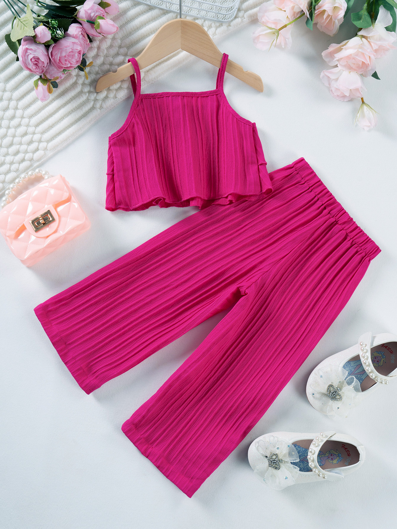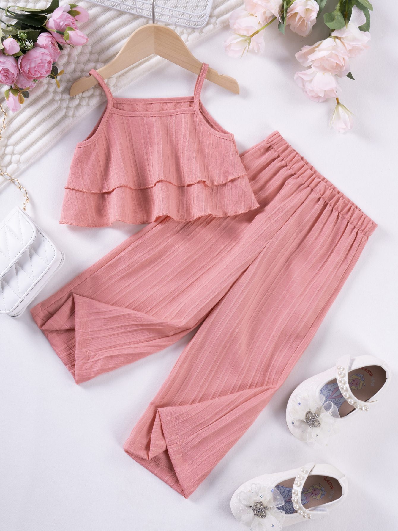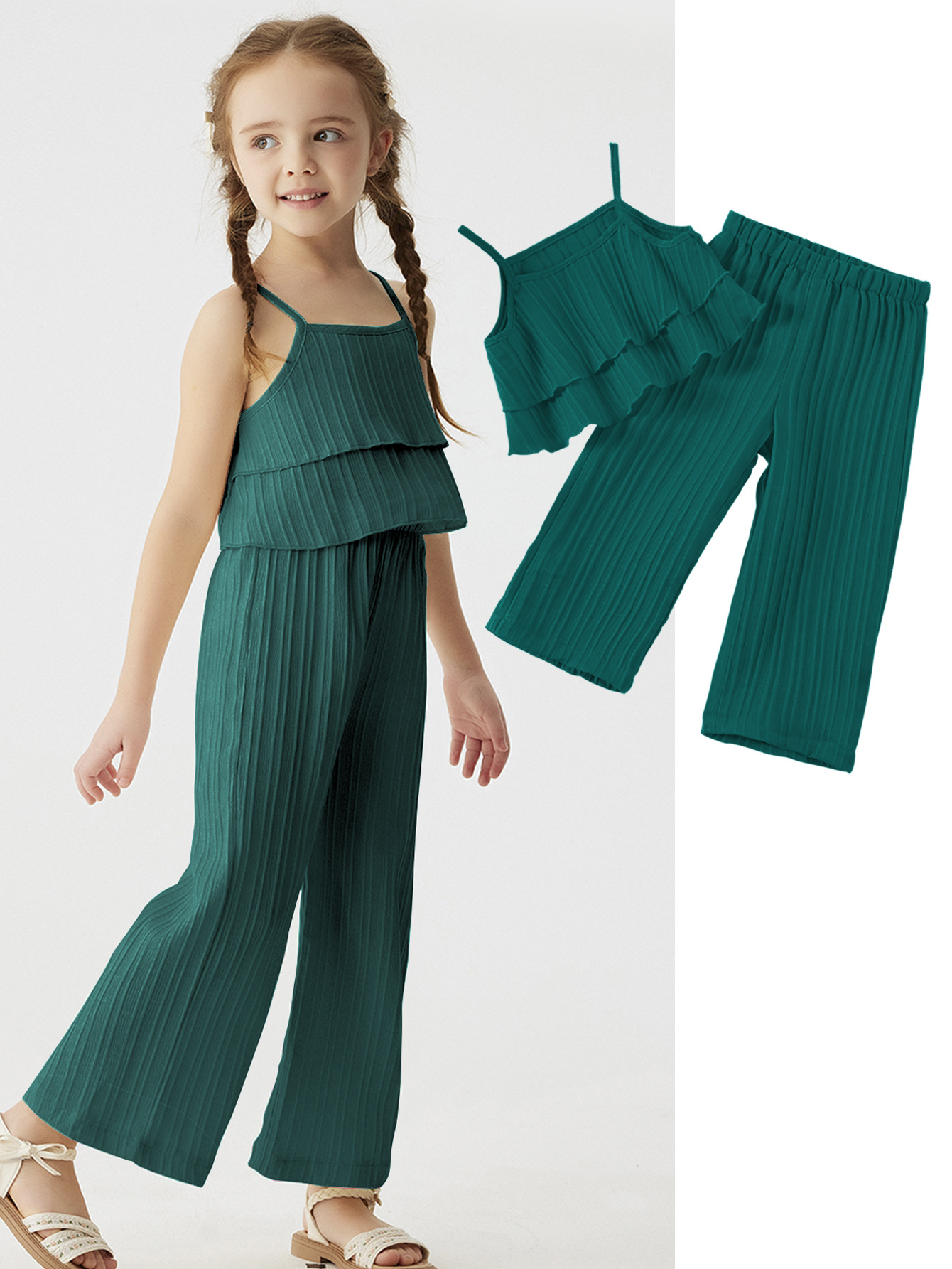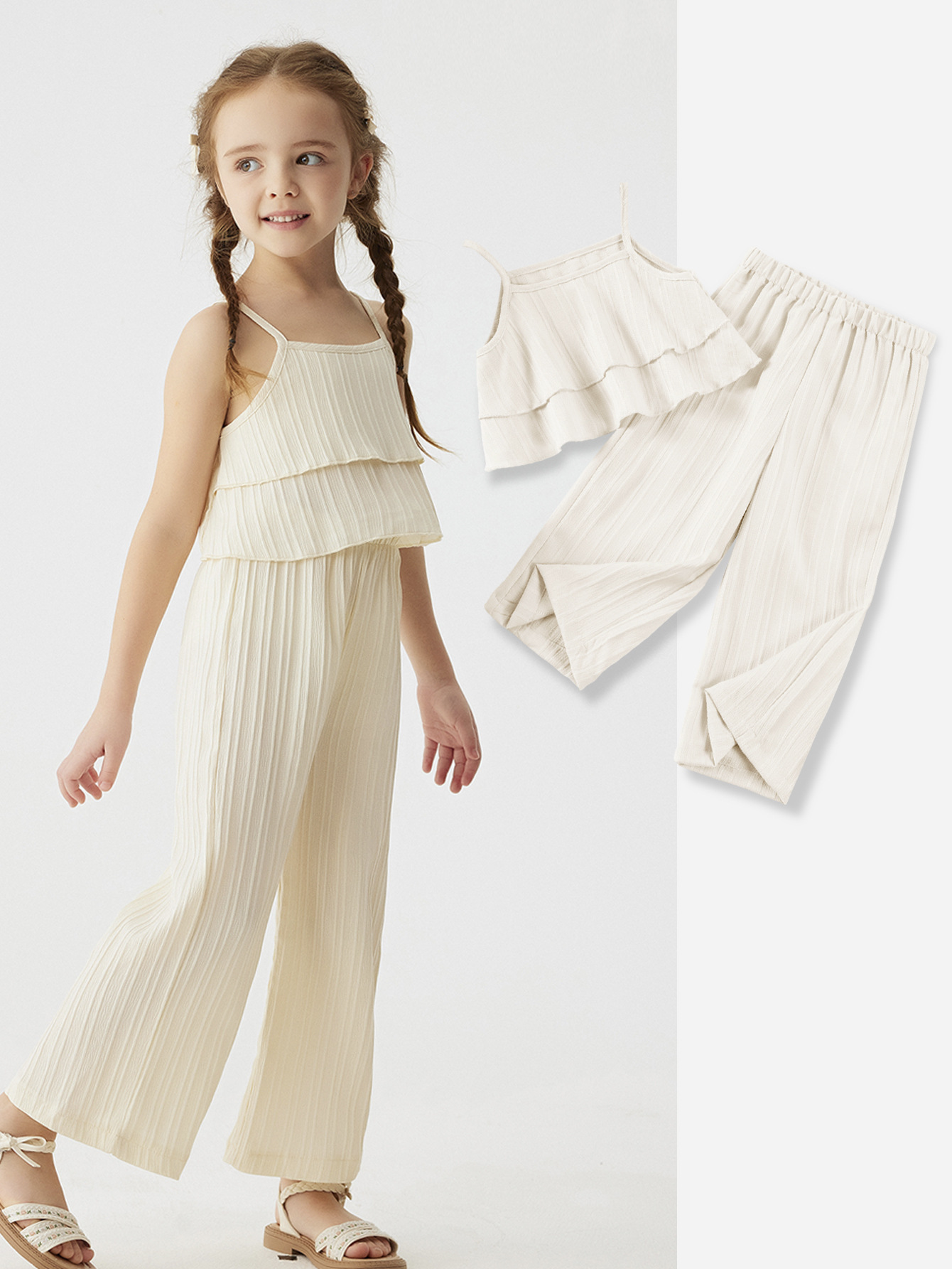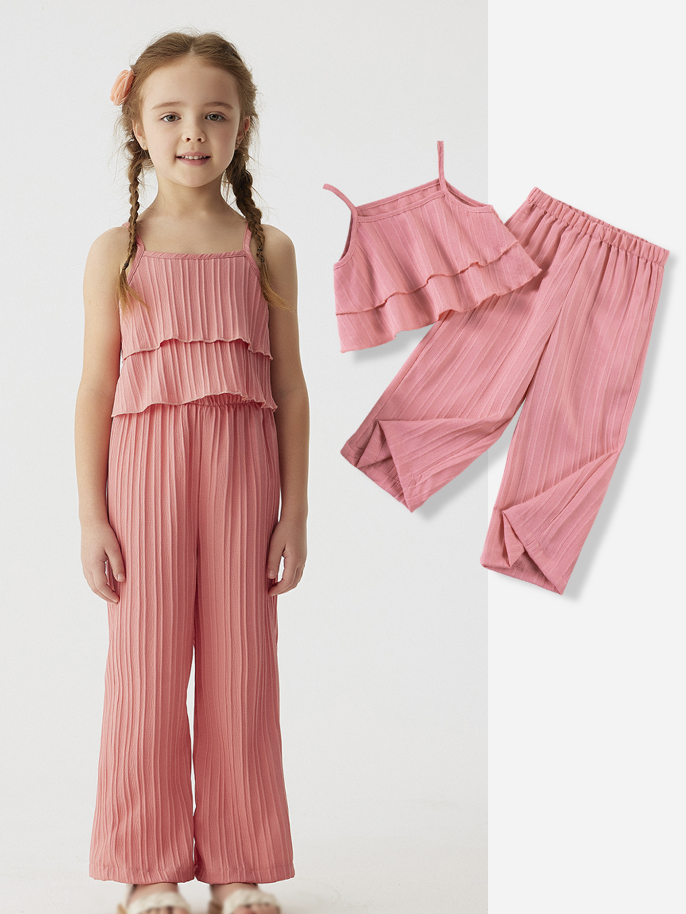2025 여아 여름 단색 멜빵 세트, 러플 장식, 인스 스타일, 일자 바지, 캐주얼, 물결무늬 원단, 유아용
