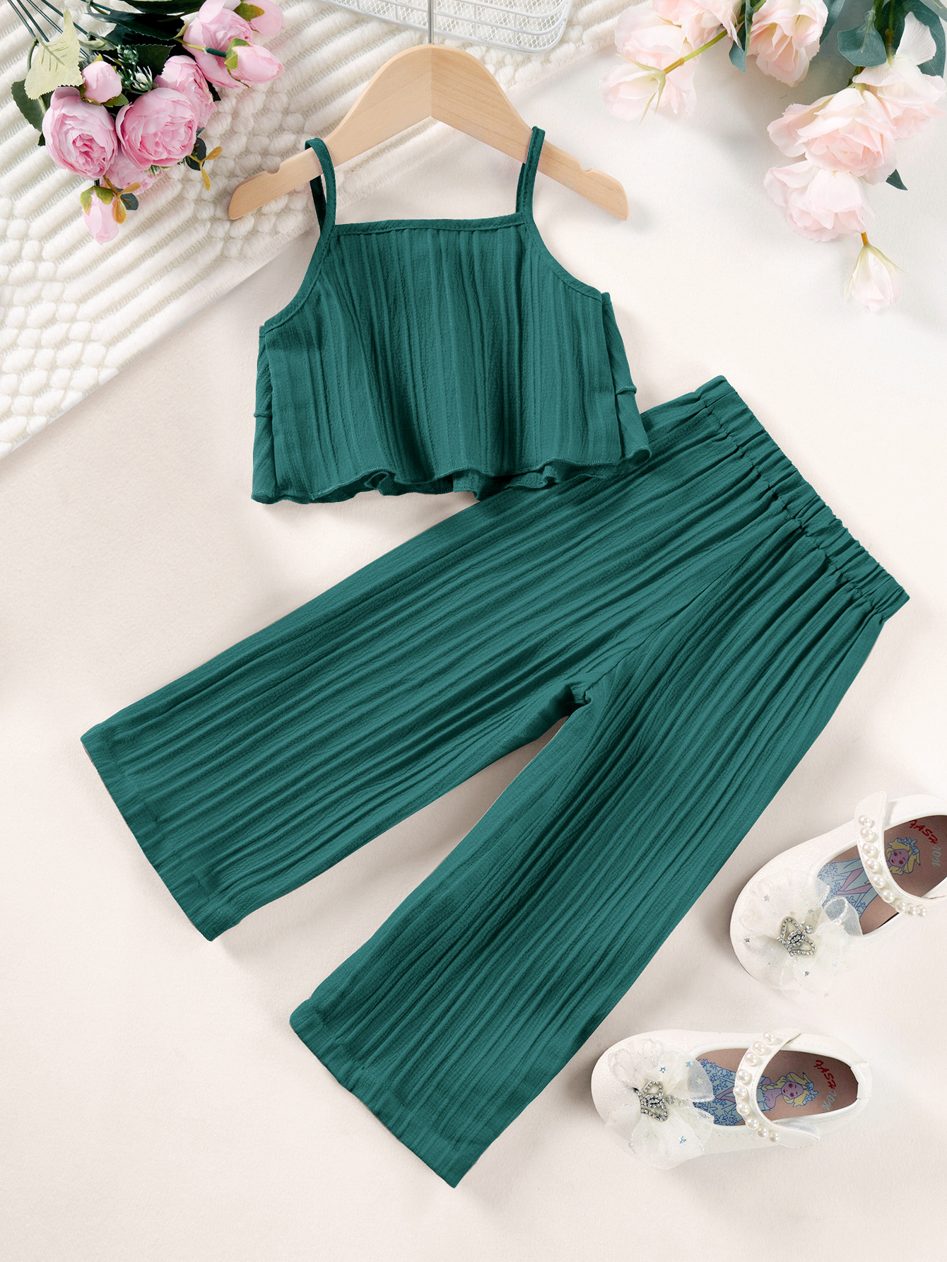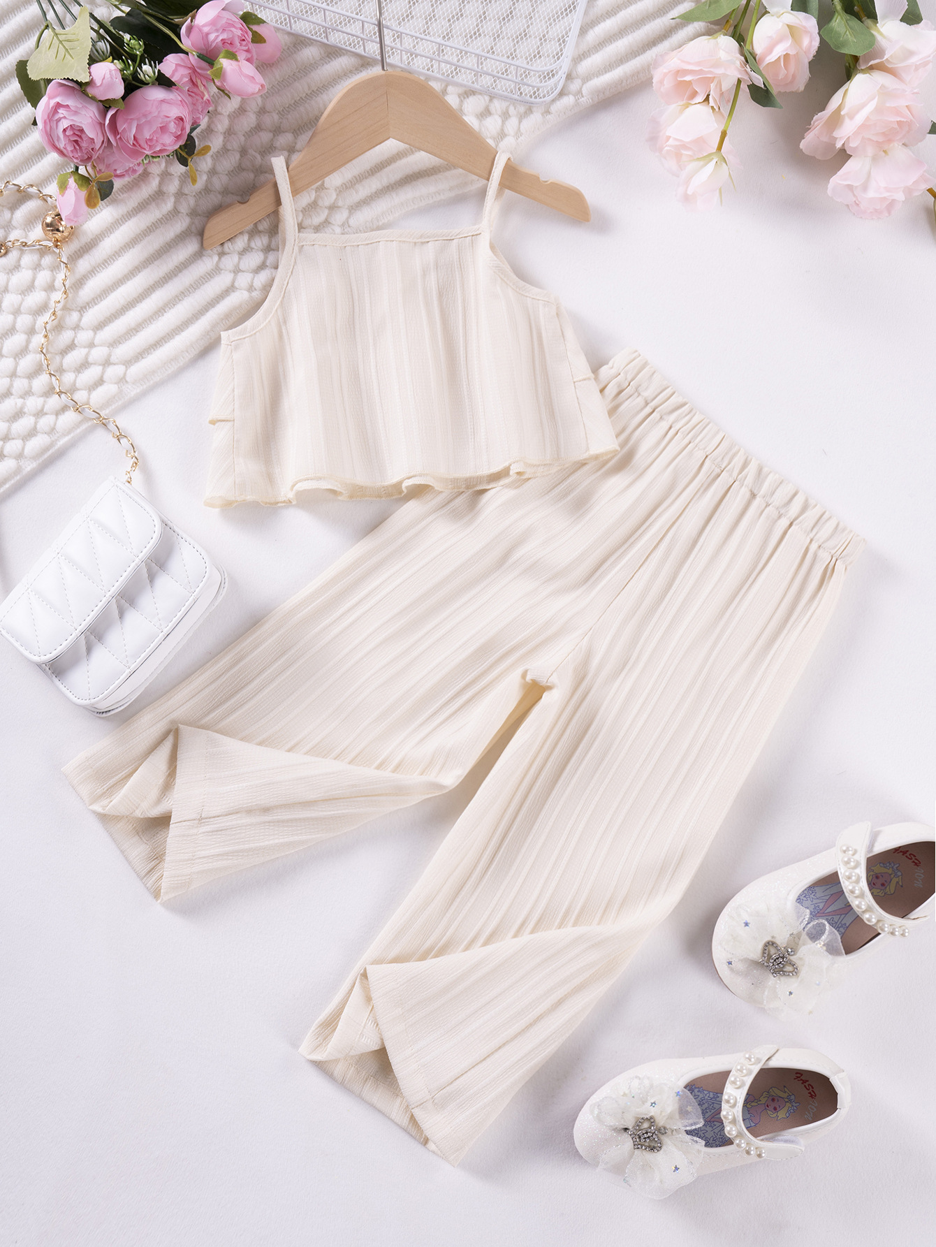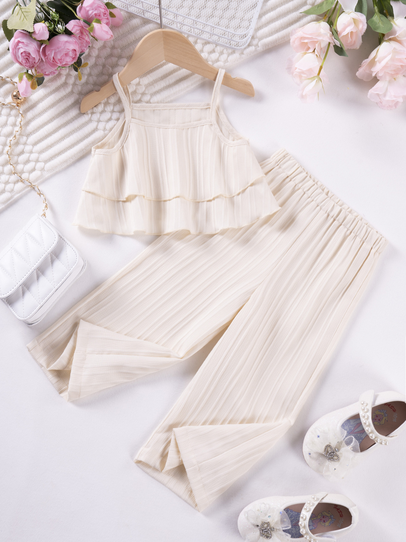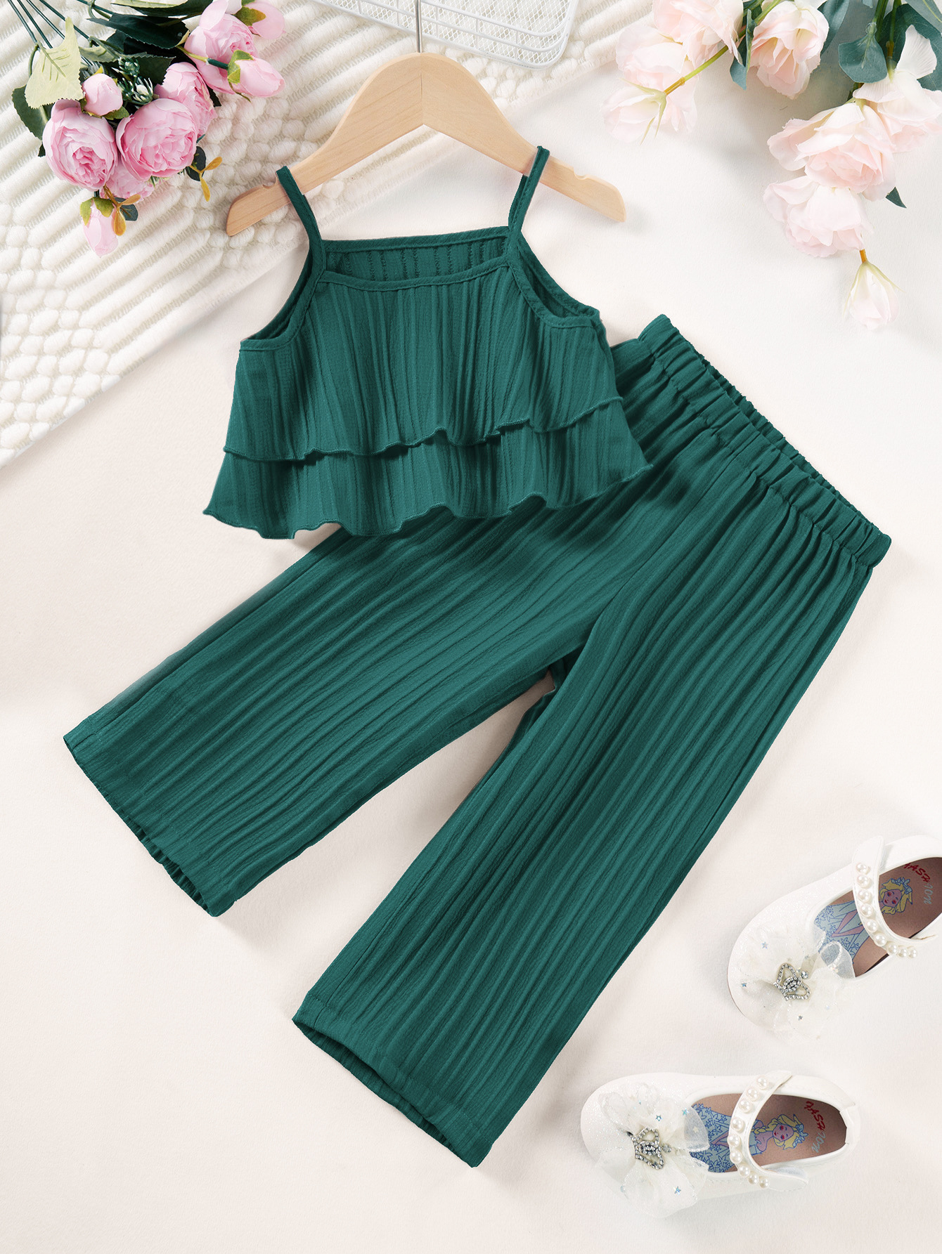 2025 여아 여름 단색 멜빵 세트, 러플 장식, 인스 스타일, 일자 바지, 캐주얼, 물결무늬 원단, 유아용