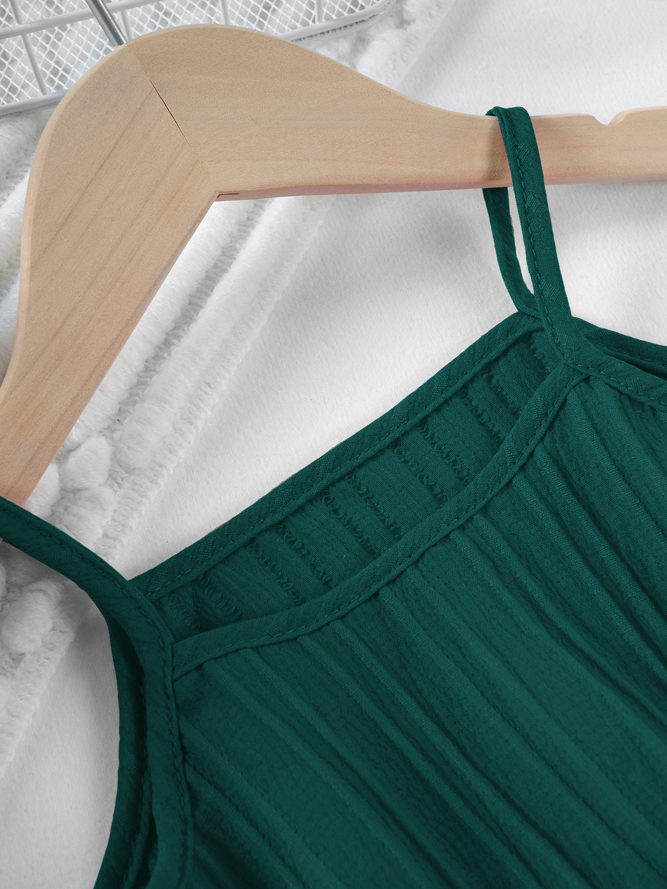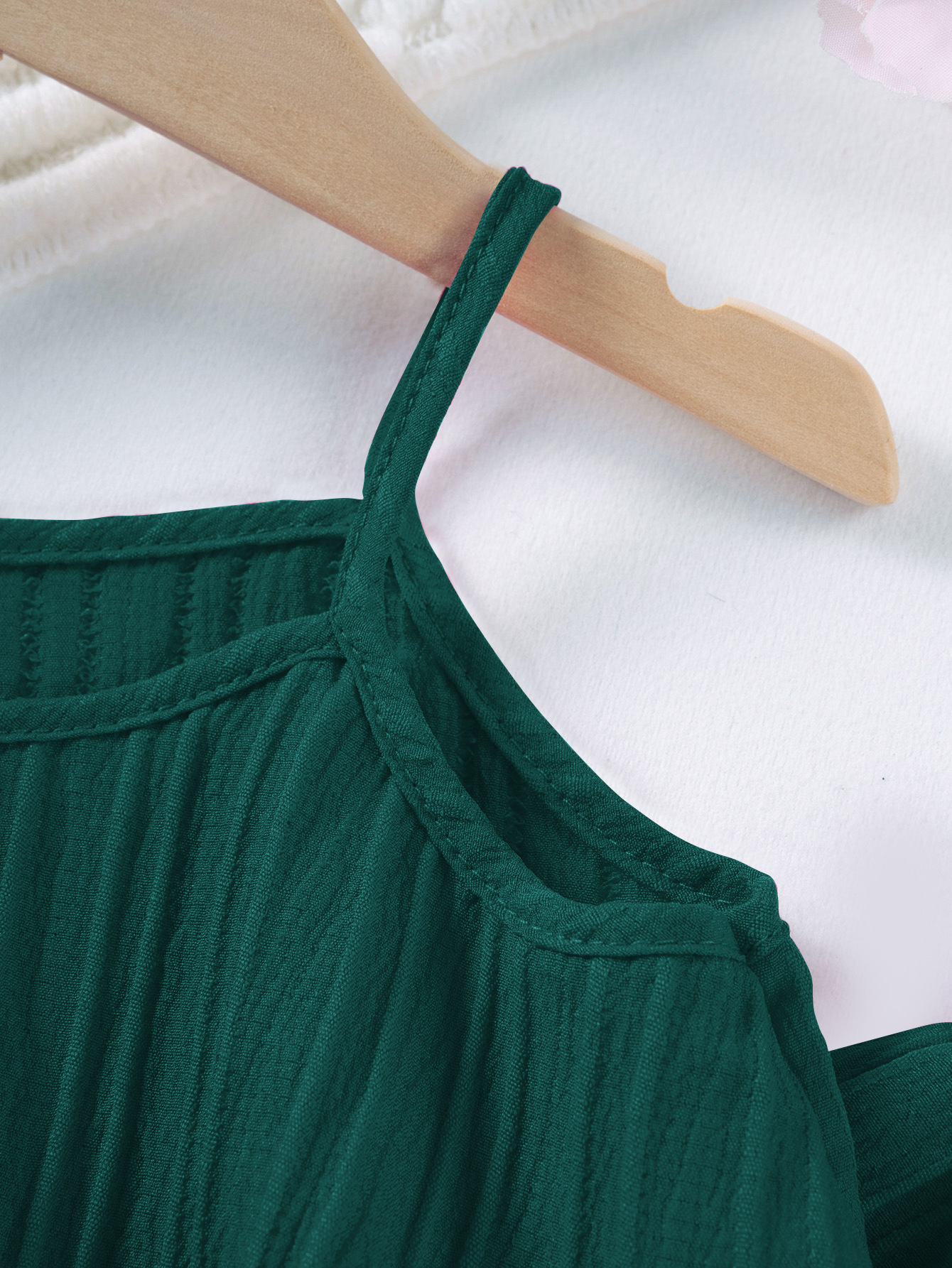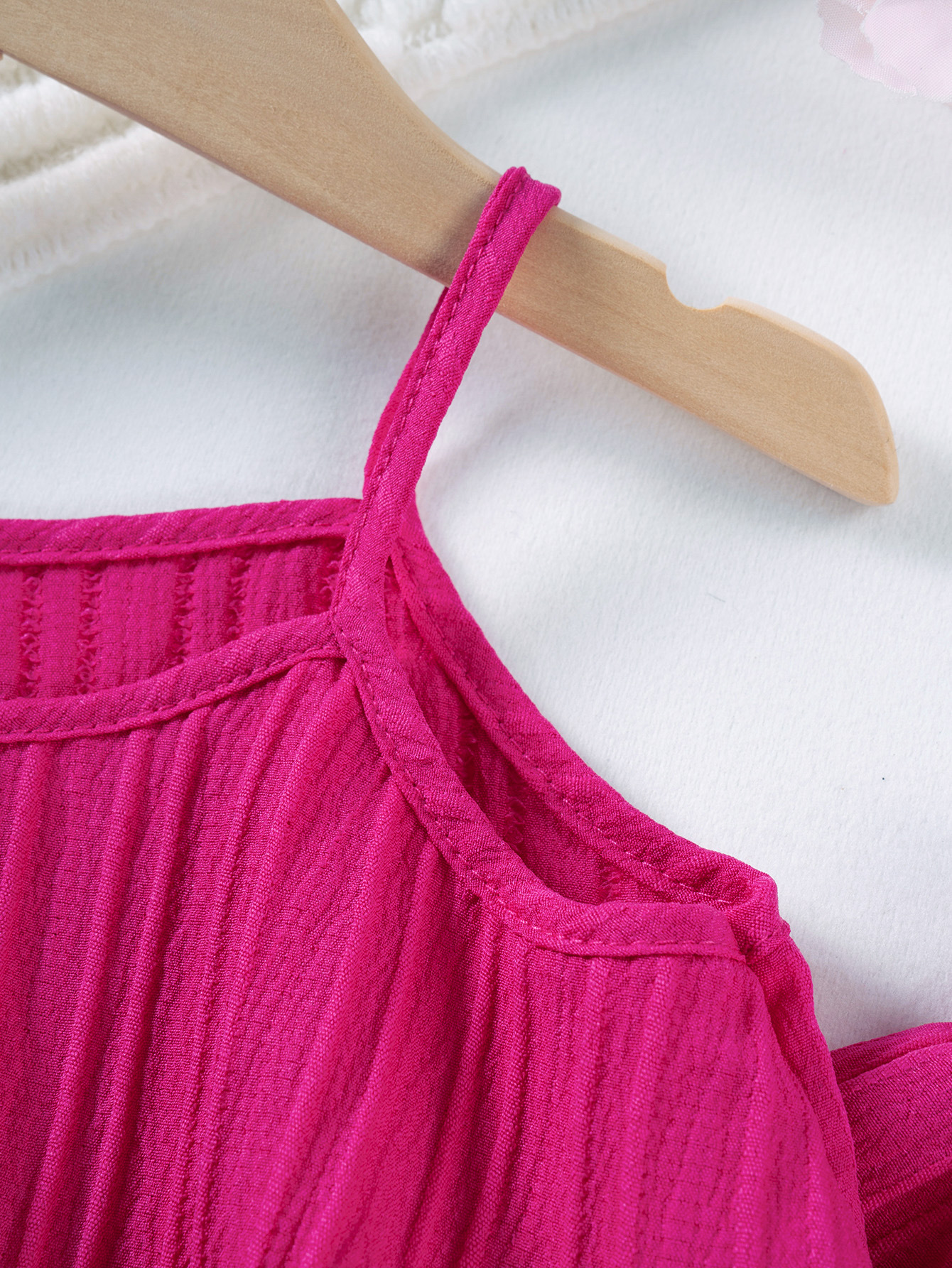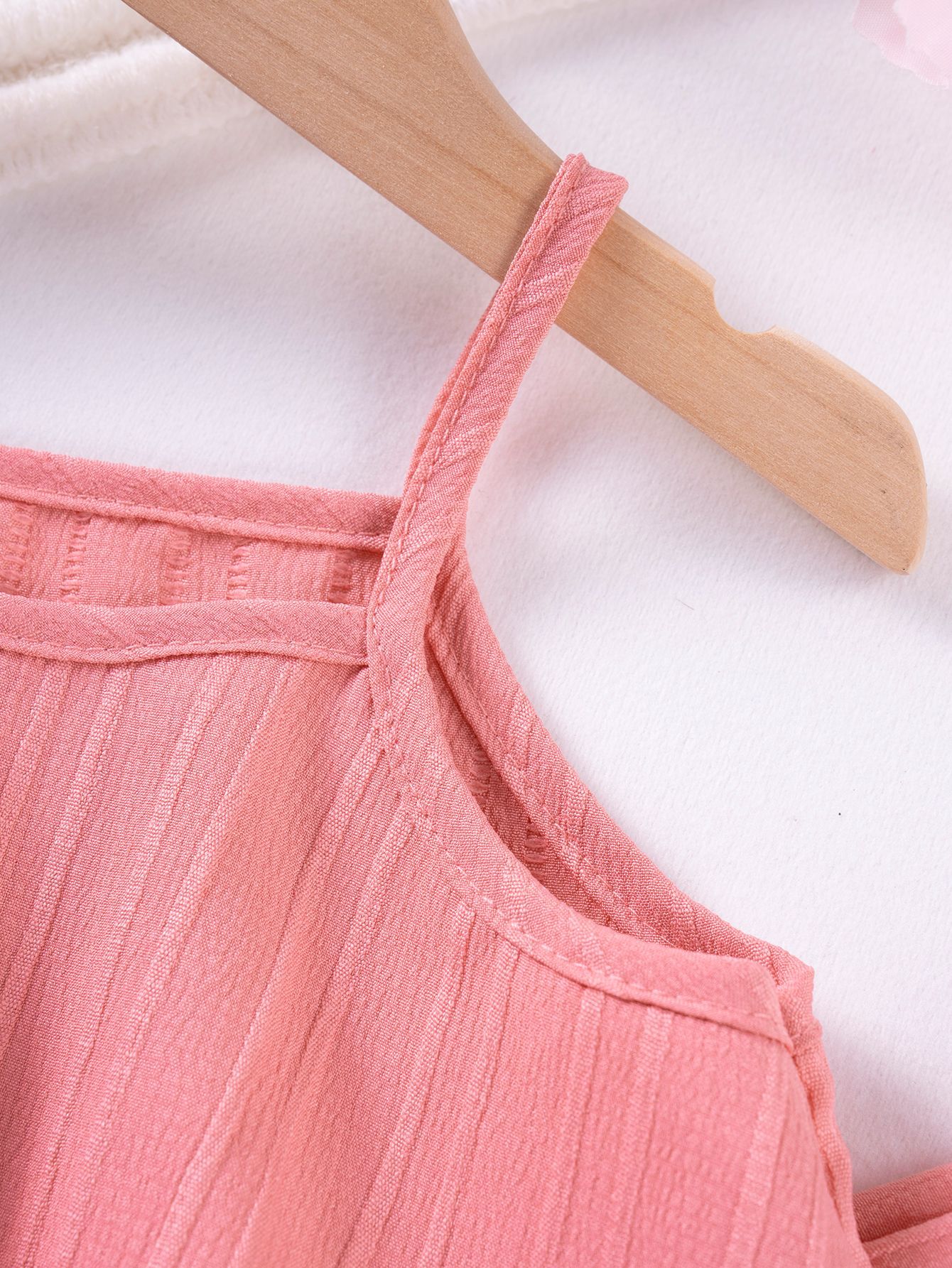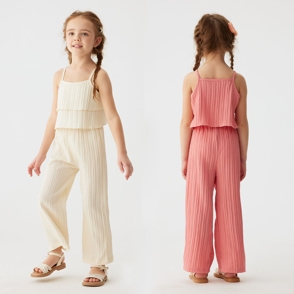 2025 여아 여름 단색 멜빵 세트, 러플 장식, 인스 스타일, 일자 바지, 캐주얼, 물결무늬 원단, 유아용스토어 가기