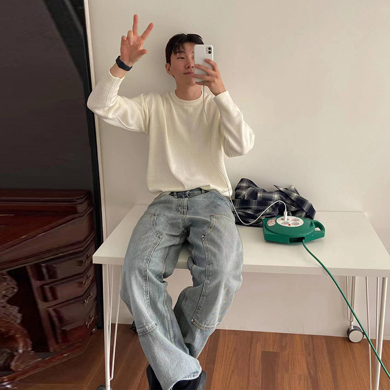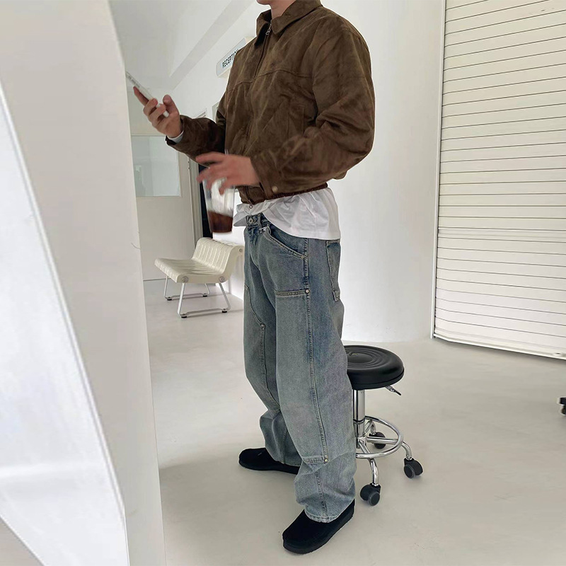 아메리칸 스타일 레트로 블루 워싱 클린핏 툴링 청바지 남성용 유럽 및 미국 하이 스트리트 무릎 로깅 바이브 팬츠
