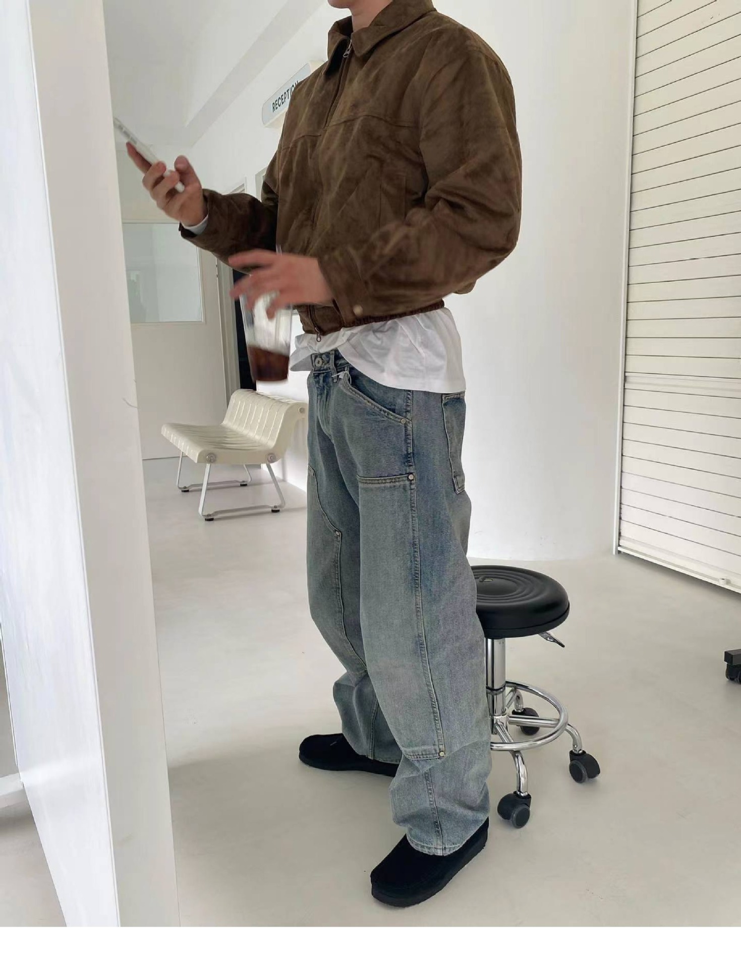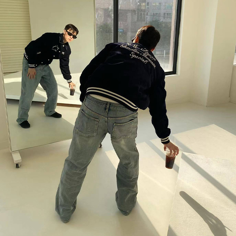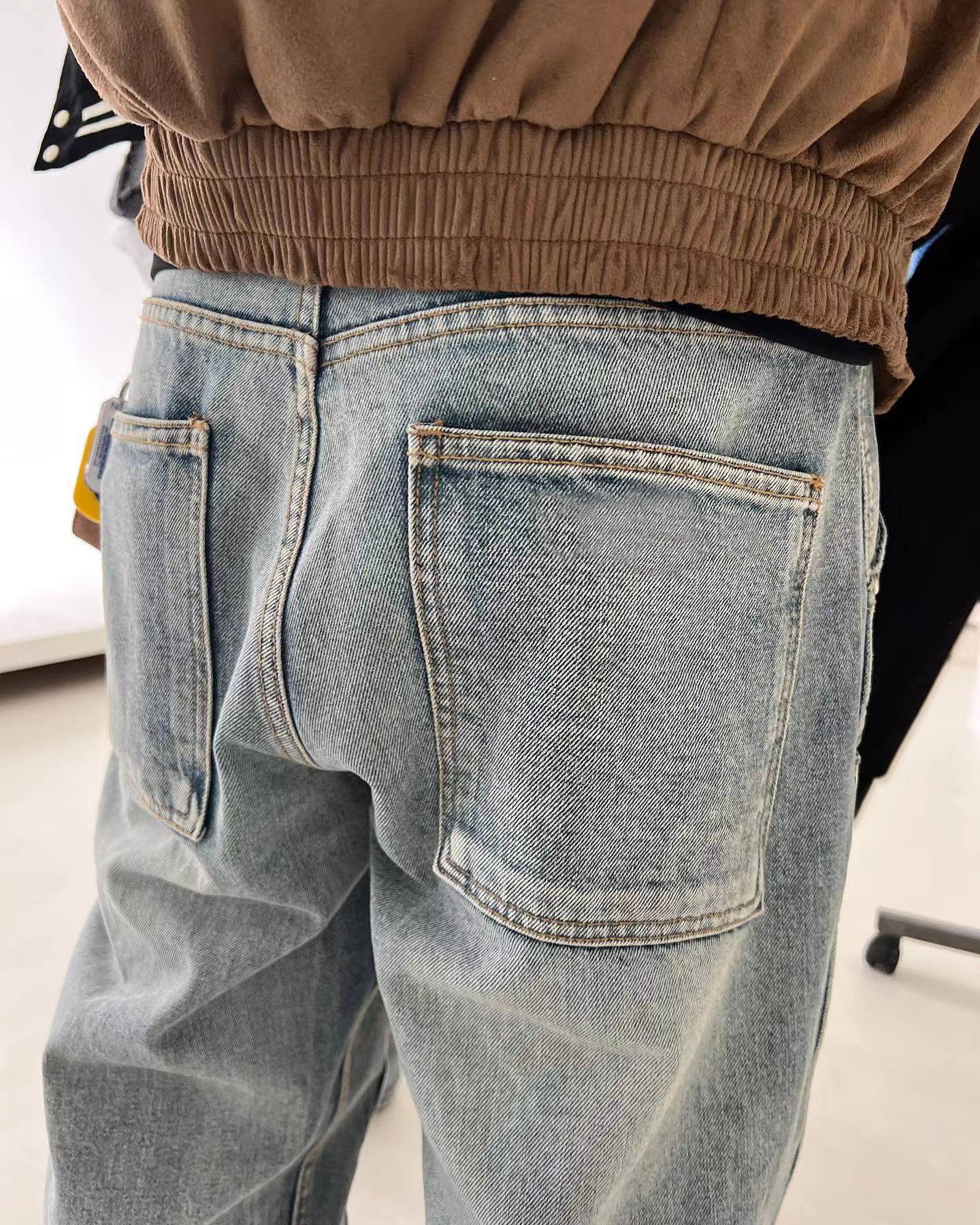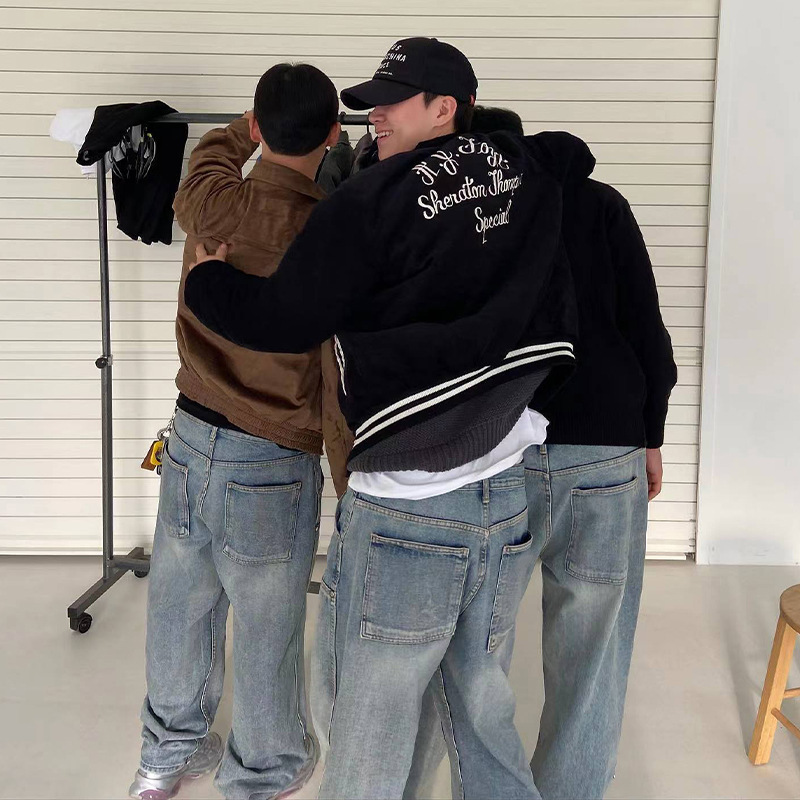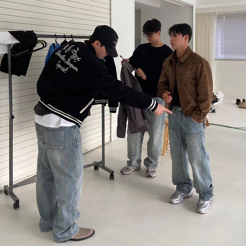 아메리칸 스타일 레트로 블루 워싱 클린핏 툴링 청바지 남성용 유럽 및 미국 하이 스트리트 무릎 로깅 바이브 팬츠스토어 가기