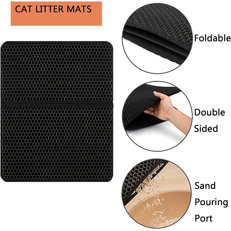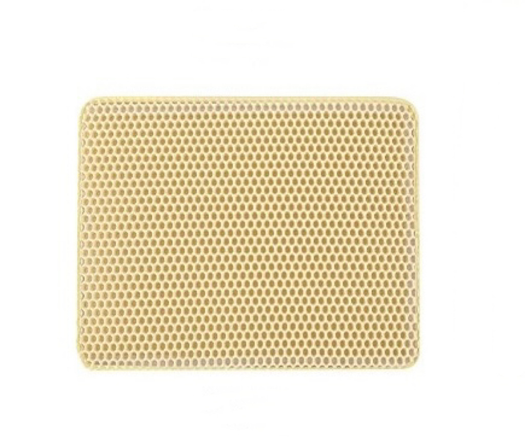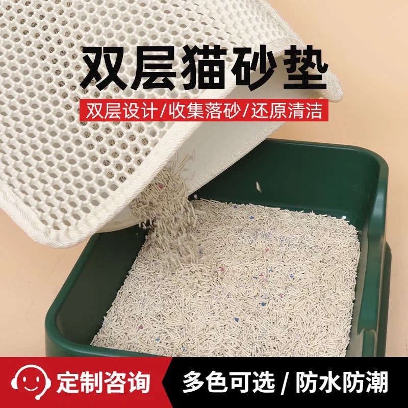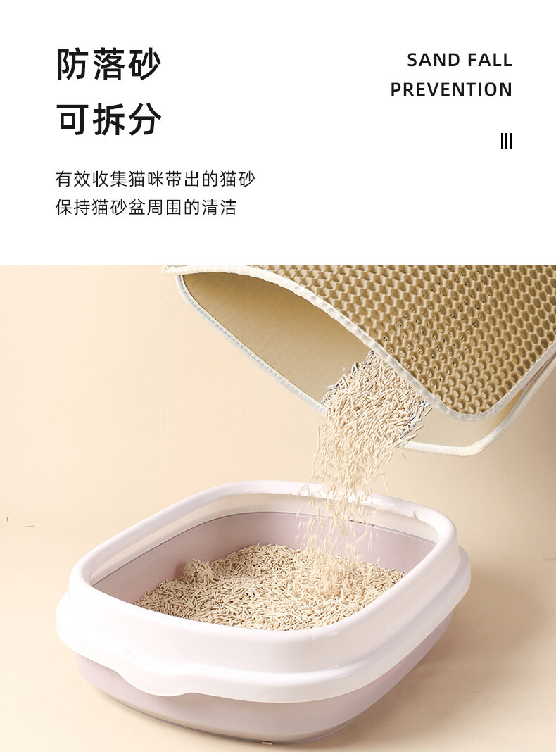 产品功能:适用95%以上种类的猫砂,上层通孔材料,猫砂可轻易通过,下层防水材质,猫砂、小便等脏物可聚集于此。猫砂垫为上下双层设计:上层采用六角形的洞孔凹凸设计,除了让猫砂落入后不再溅出外,圆球型的柔滑触感也可以避免猫咪抓坏,下层垫密封专门存放猫砂,底部设计成规则性的圆孔,有效防滑避免横冲直撞的猫咪滑到受伤。