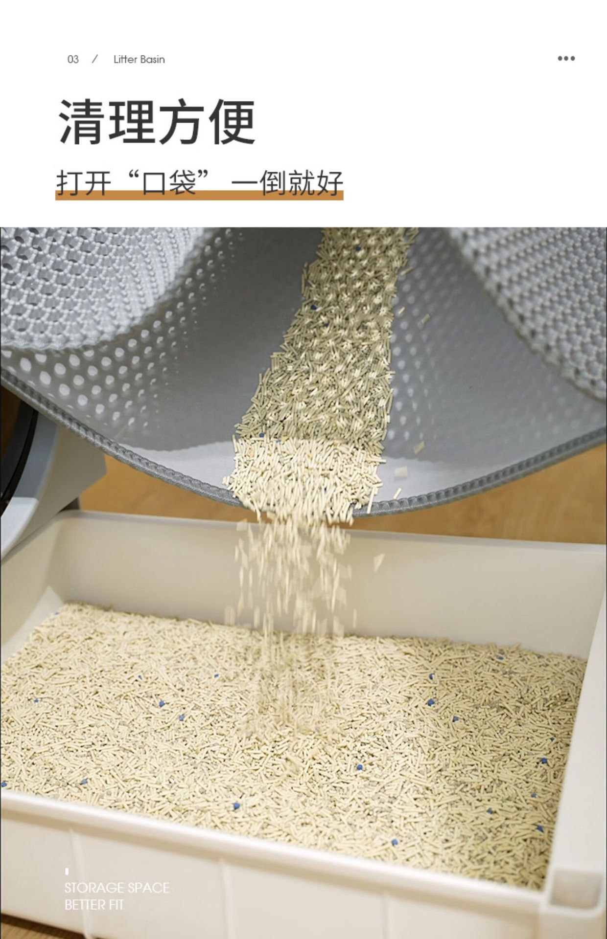 前后两边采用开口设计,能轻松倒出猫砂,完全不麻烦,更不会手忙脚乱,更棒的是猫砂再利用,清洁的同时又省钱。