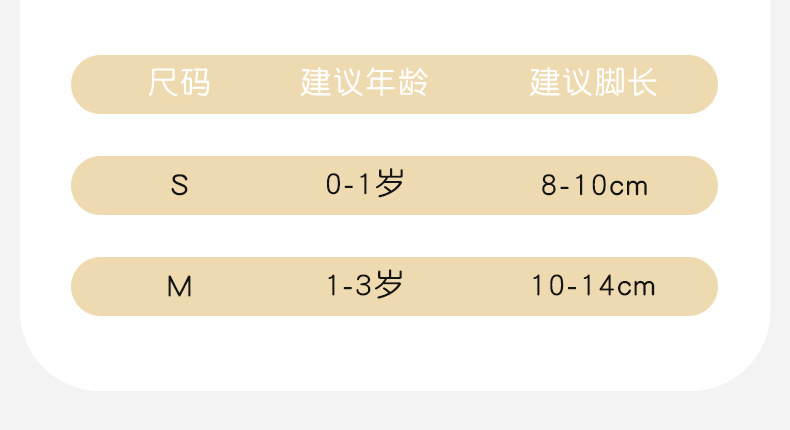 • S (권장 0-12 개월, 권장 발 길이 8-10cm)