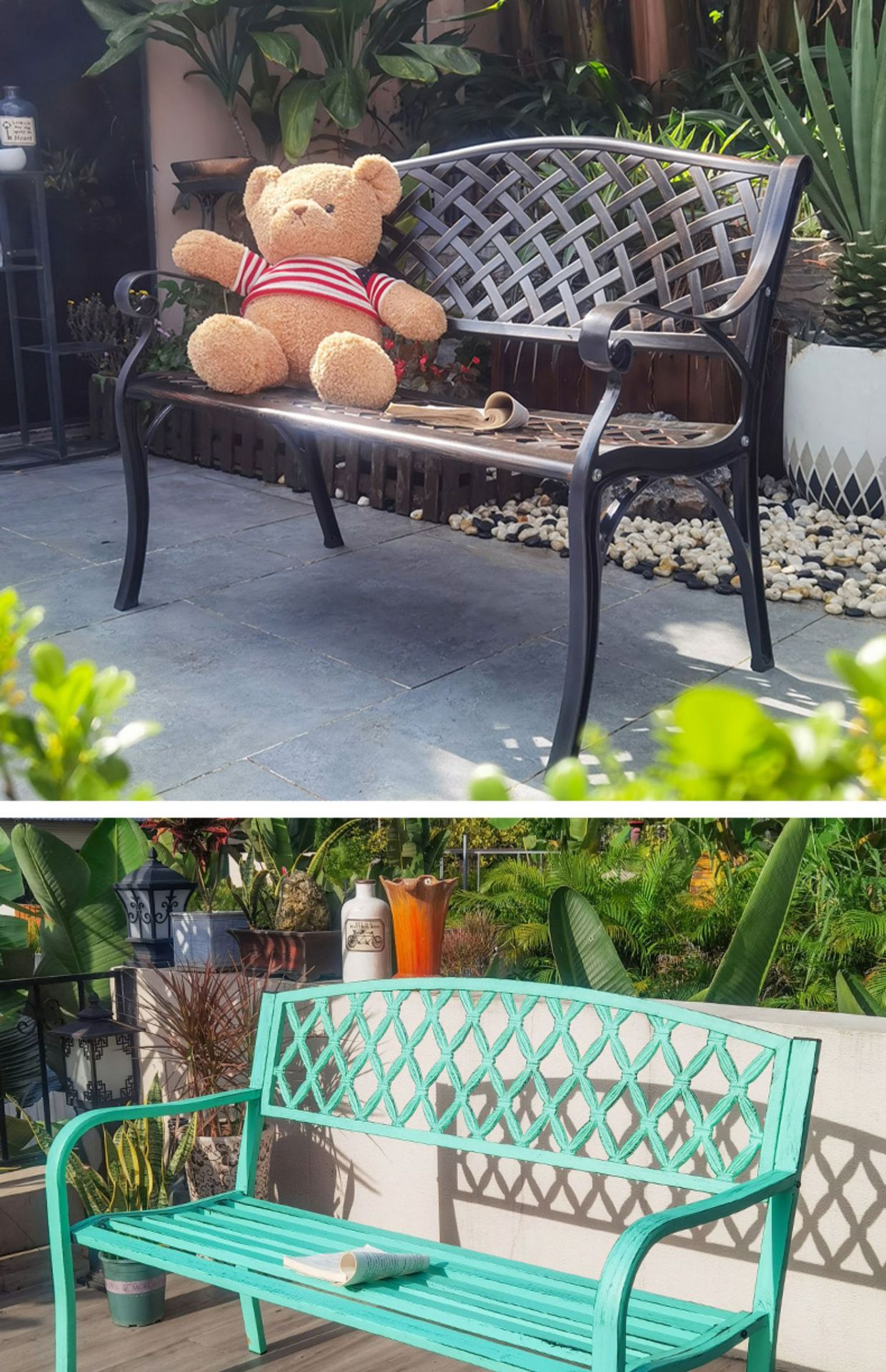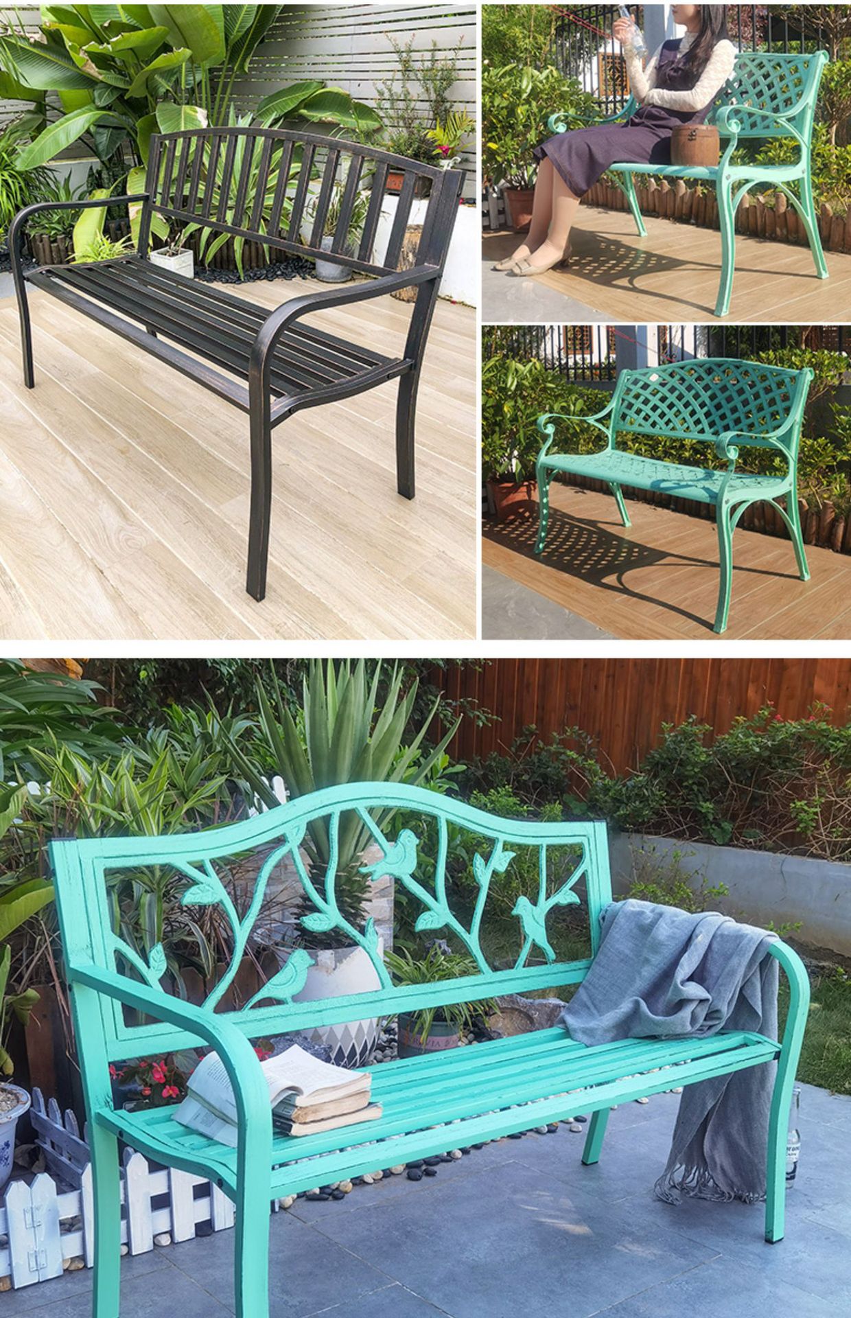 공원 의자, 야외 벤치, 야외 벤치, 안뜰 레저용 의자, 플라스틱 목재 및 철제 등받이 야외 가구스토어 가기