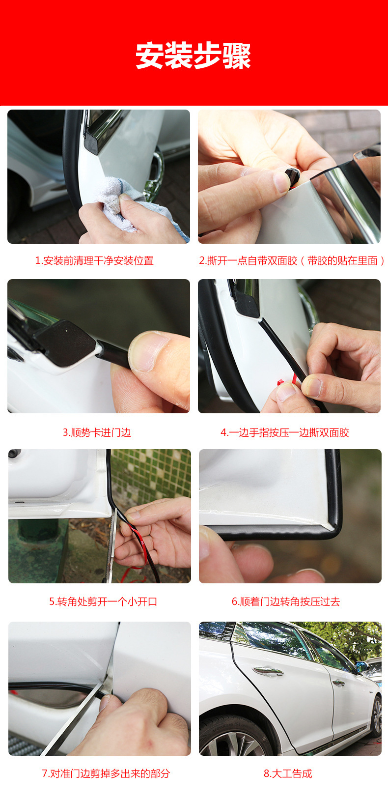轿车:一车4门竖边安装长度为5m; 一车4门竖边+底部横边安装长度为8m;一车4门竖边+底部横边+后备箱底边安装长度为13m;一车4门全包+后备箱+引擎盖长度为20m