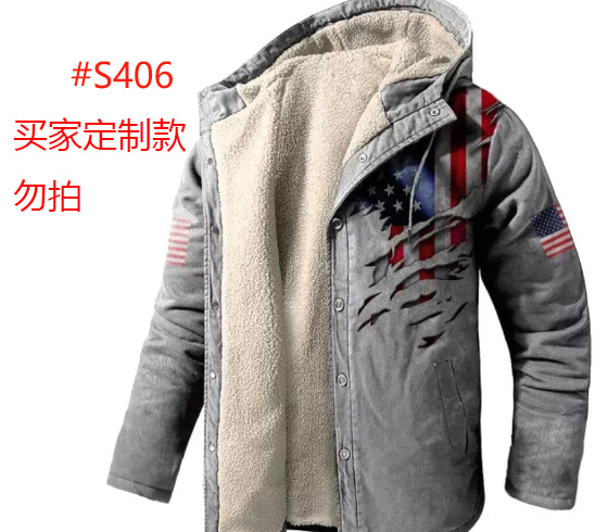 외국 무역 독립 웹사이트 남성복 유럽 및 미국 가을 겨울 두꺼운 면 코트 체크무늬 긴팔 루즈핏 후드 재킷 회색 모피