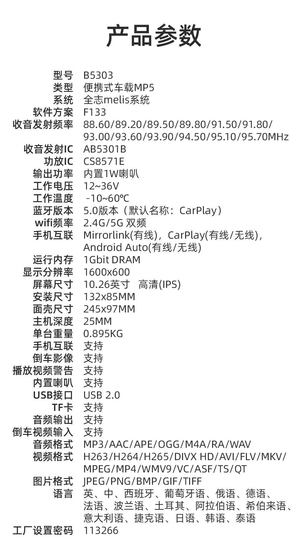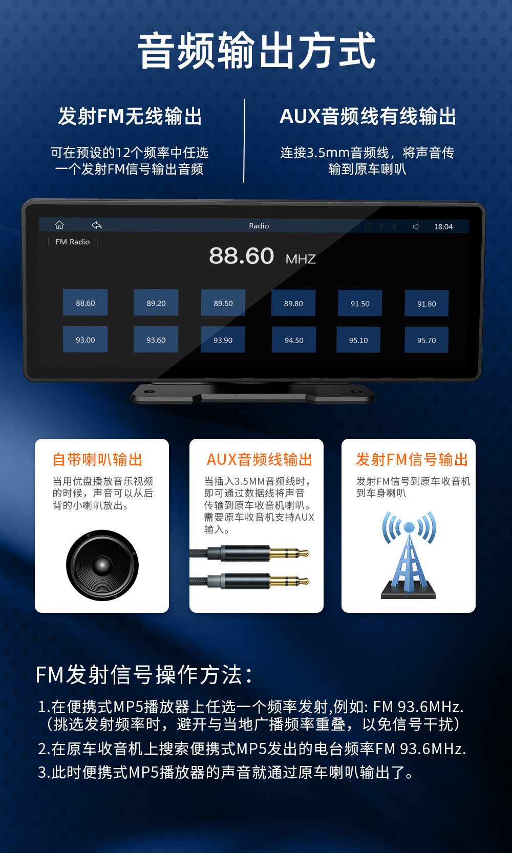 B5303 10.26寸carplay便携屏车载MP5导航 倒车互联车载蓝牙播放器