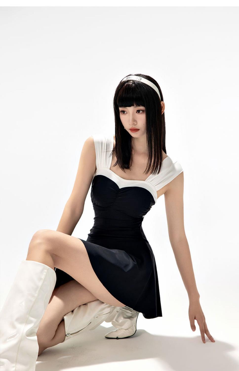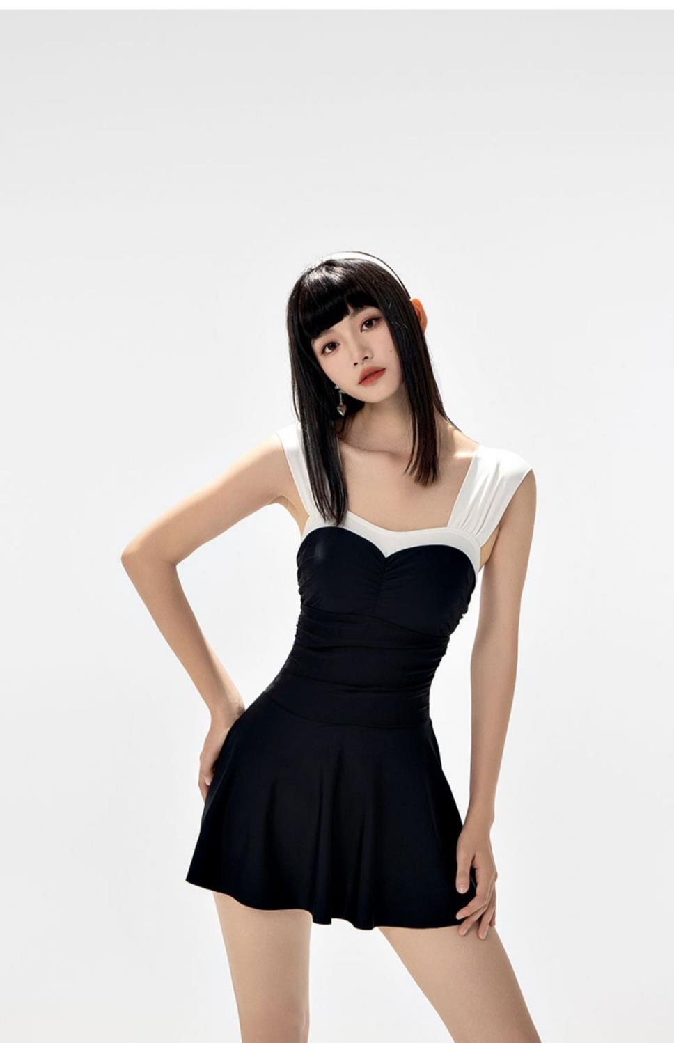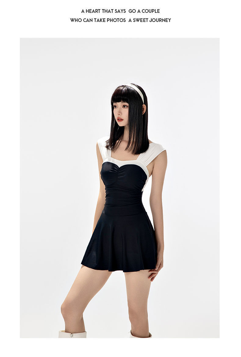 Funhancouple 흑백 대비 색상 간단한 스트랩 백리스 슬리밍 수영복 여성 배꼽 커버 보수적 인 온천 수영복