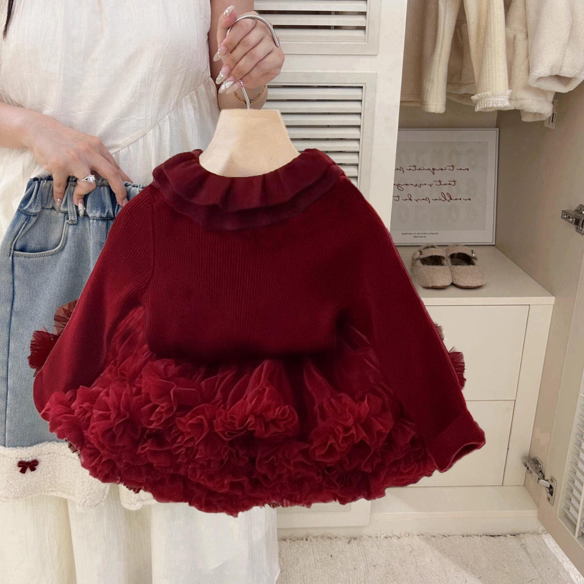 가을과 겨울 아동복 새로운 여아 레드 스웨터 니트 작은 체리 니트 셔츠 아기 투투 스커트스토어 가기