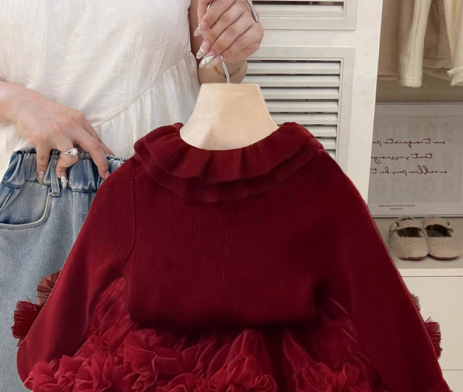 • 빨간 숄 스트랩 가디건과 풍성한 튜튜 스커트