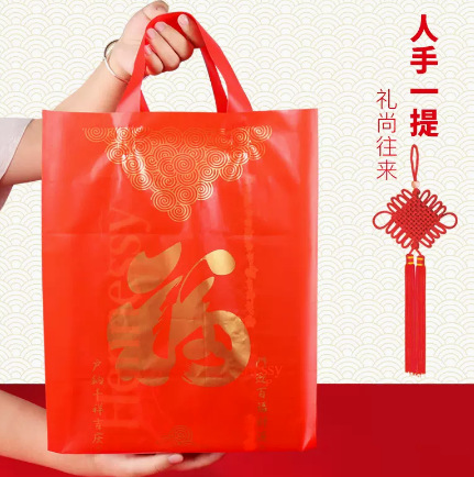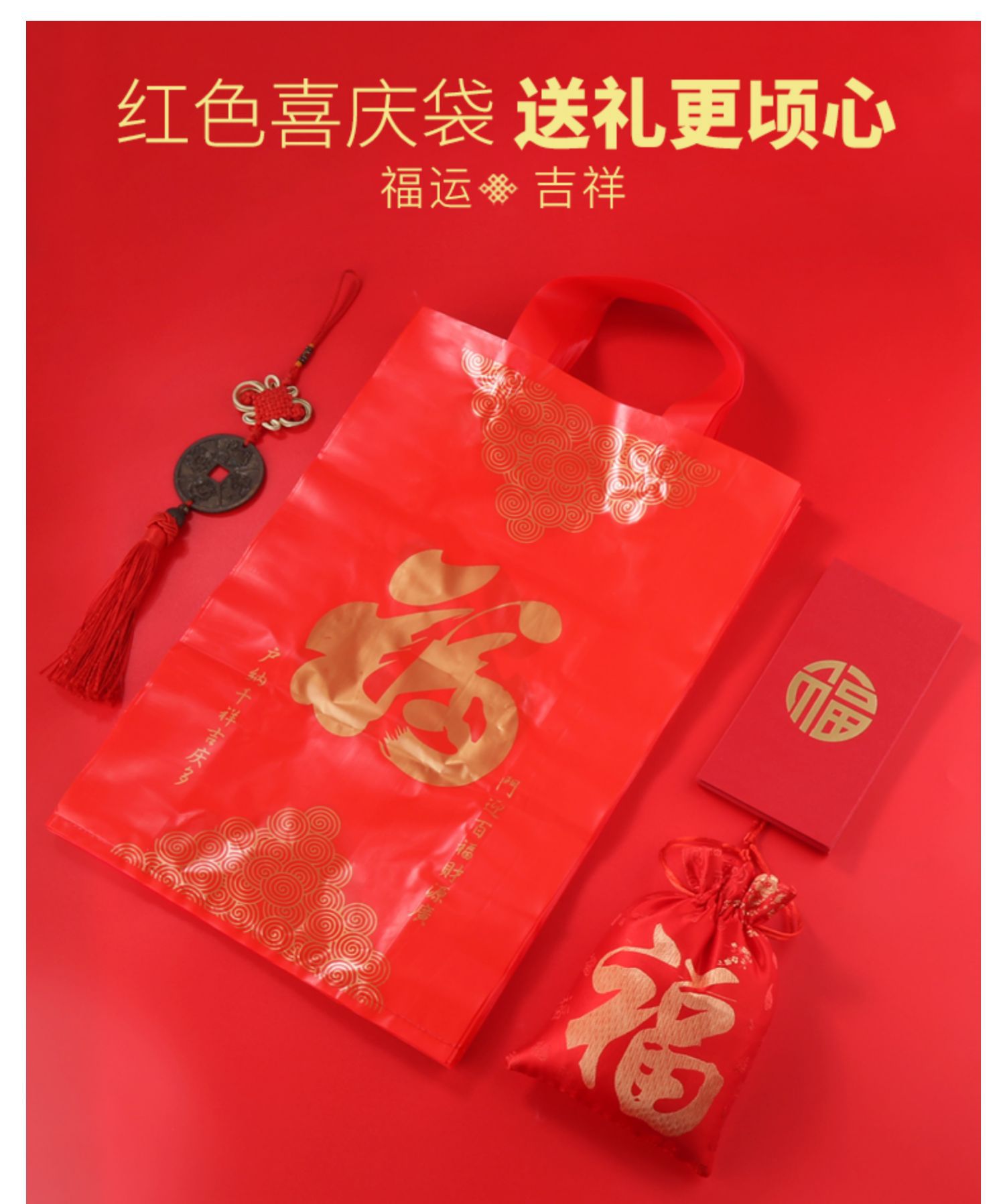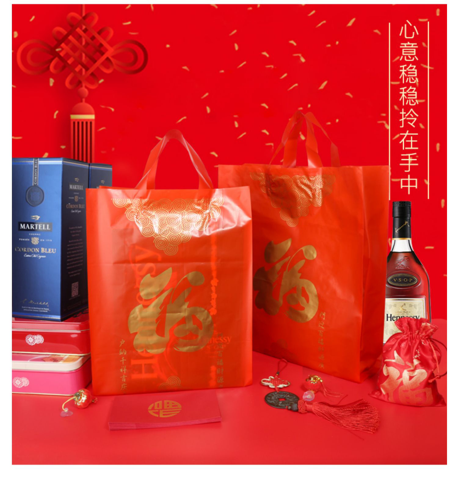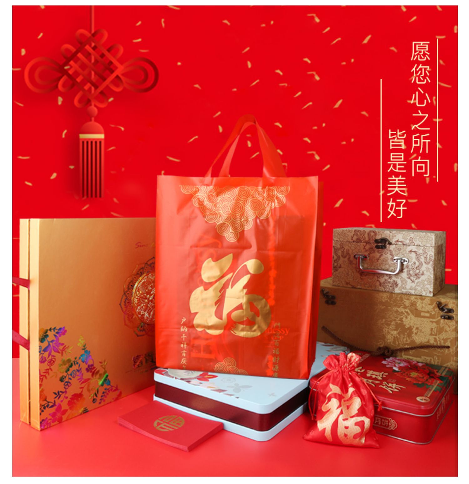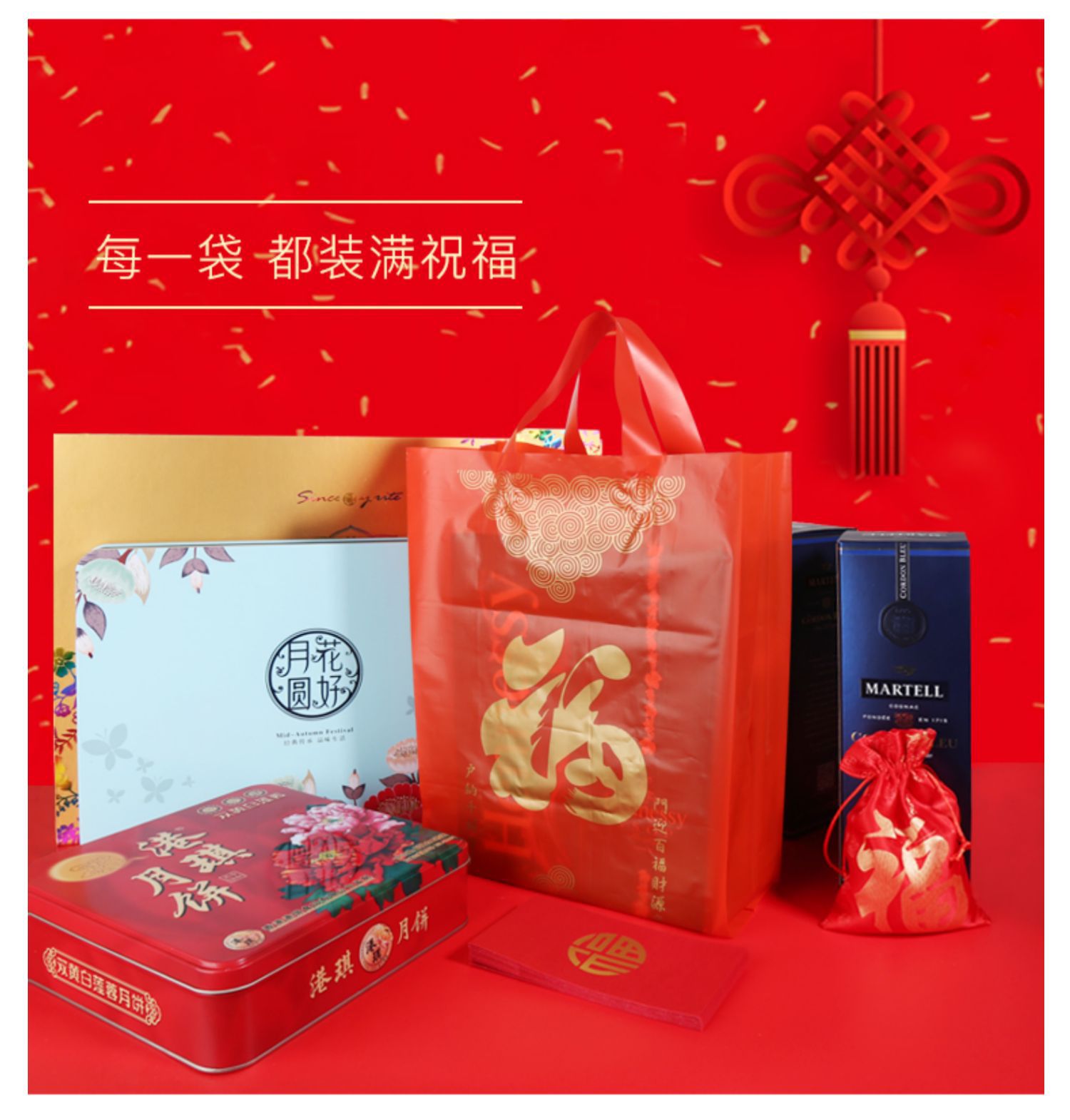 중국 스타일의 붉은색 축제 행운의 단어가 새겨진 명절 선물 가방, 슈퍼마켓 담배, 와인, 설탕 및 차 포장, 기념품 플라스틱 핸드백스토어 가기