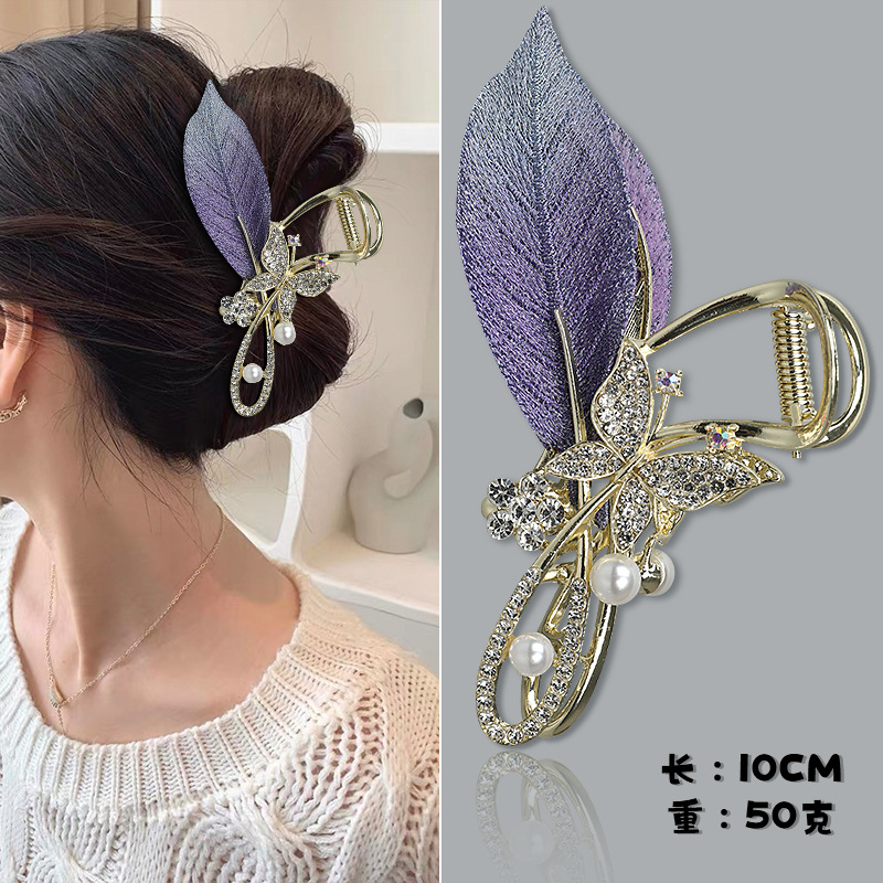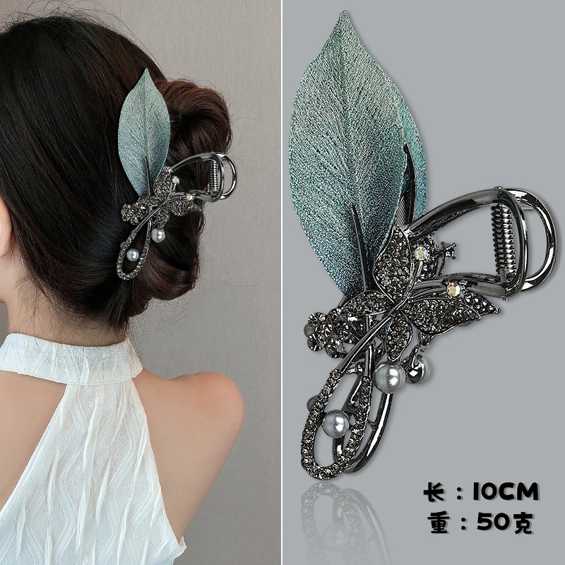 자수 잎 대형 클립, 고급 새로운 중국 스타일 다이아몬드가 박힌 진주 잎 머리핀, 여성용 머리핀, 상어 클립 헤어 액세서리