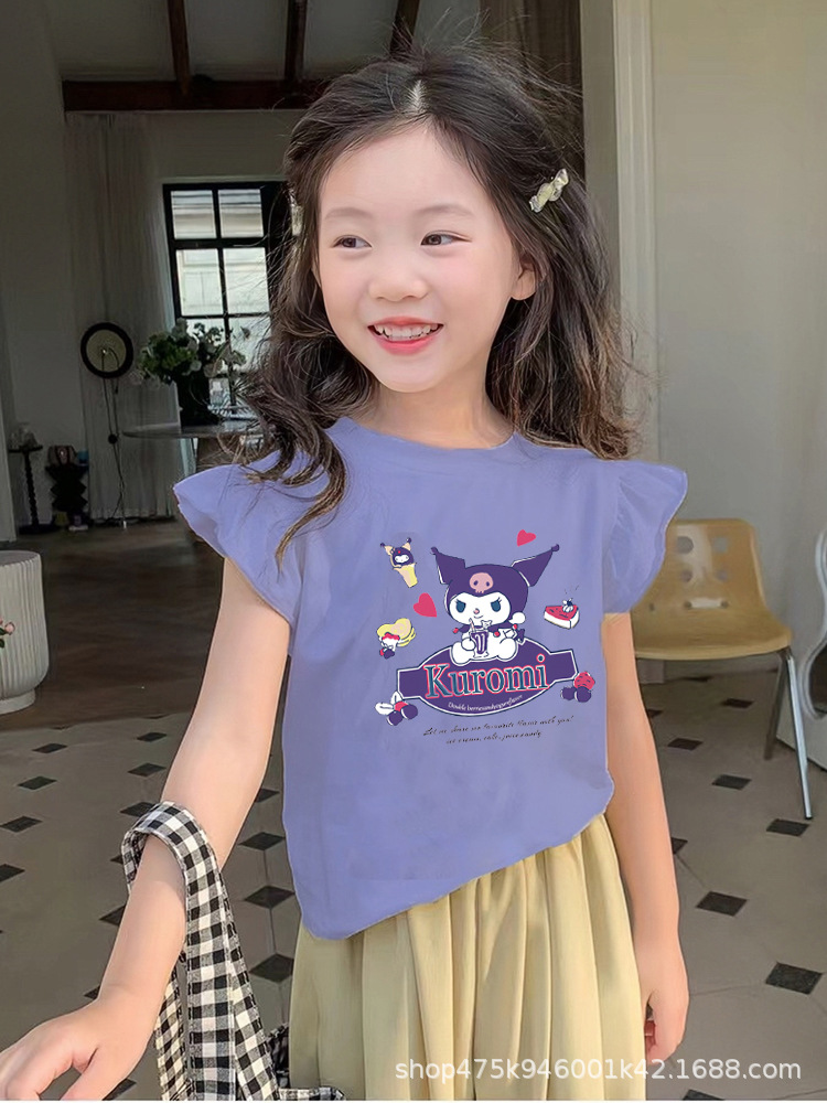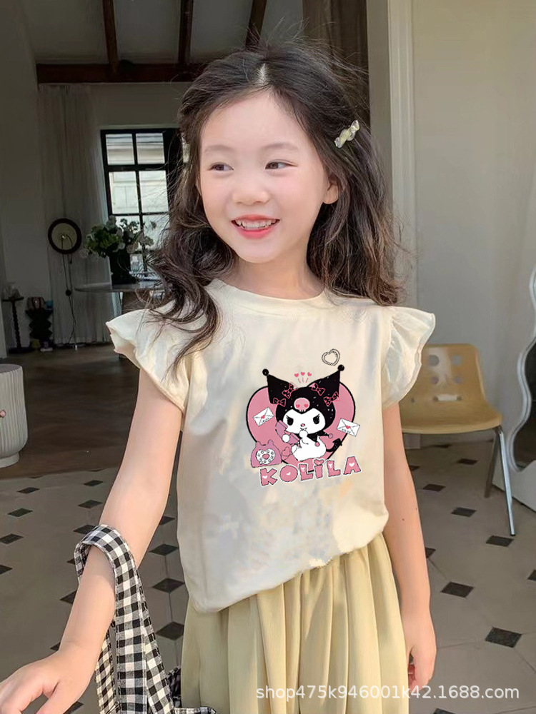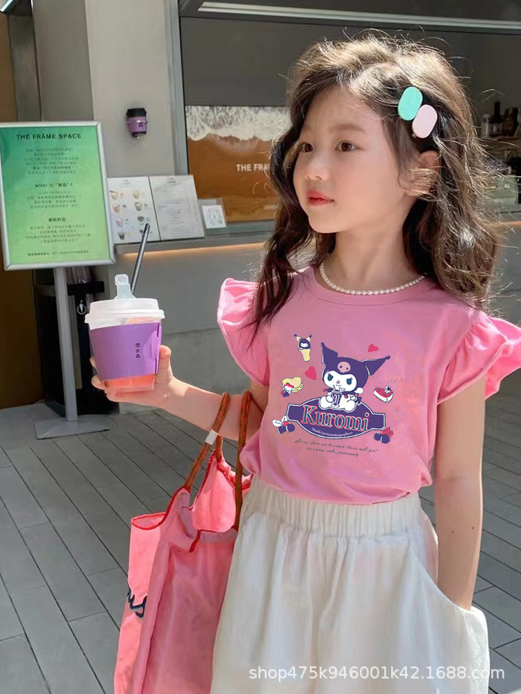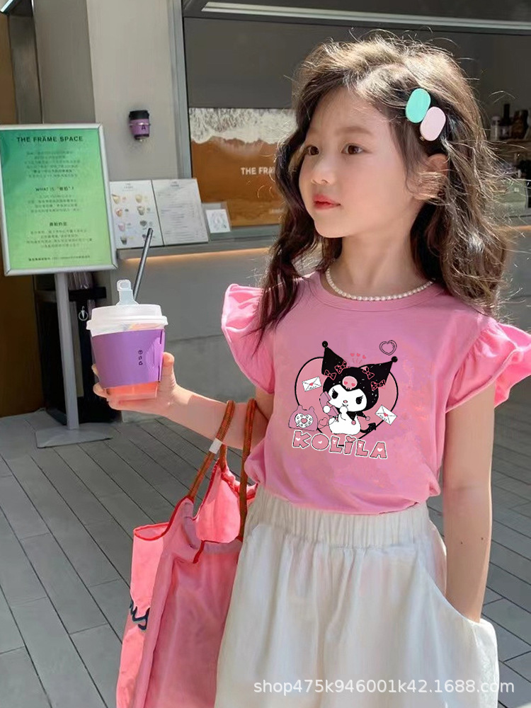 크로스 보더 새우 스킨 여아 비행 소매 한국 만화 Kulomi 티셔츠 여름 면 서양 스타일 반팔 어린이 탑