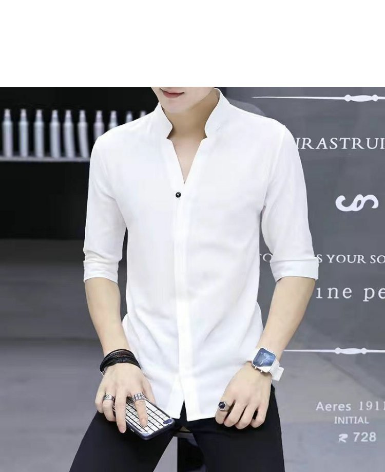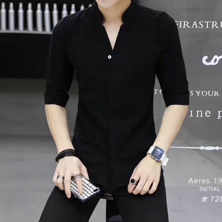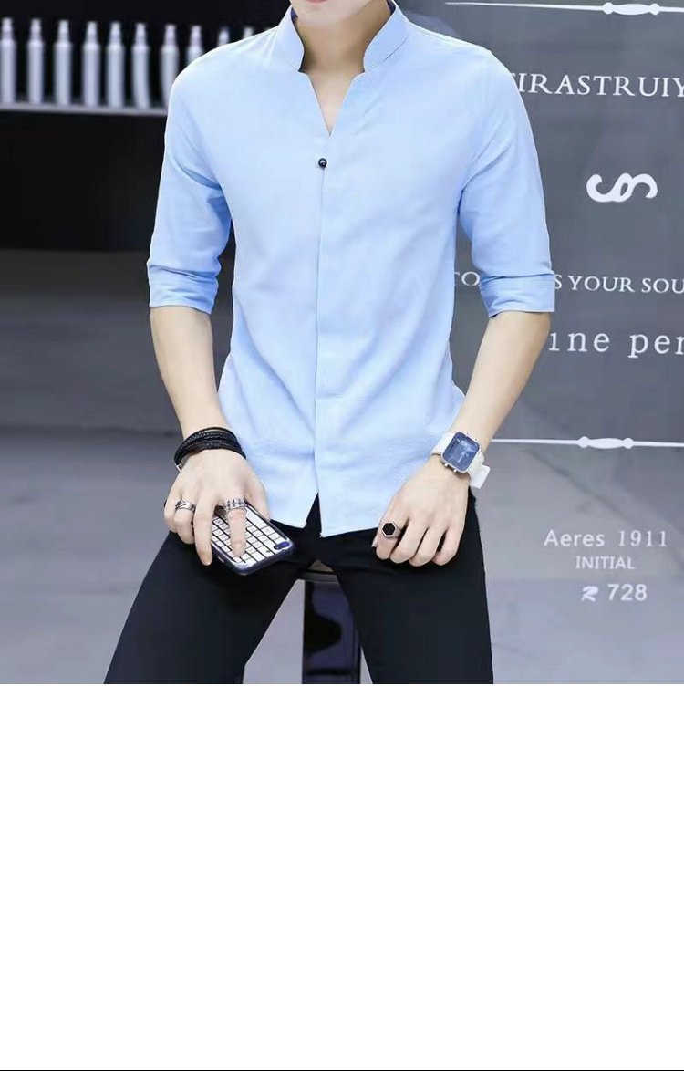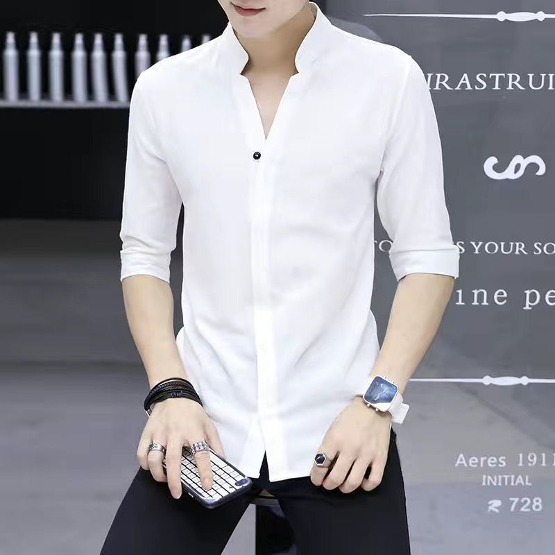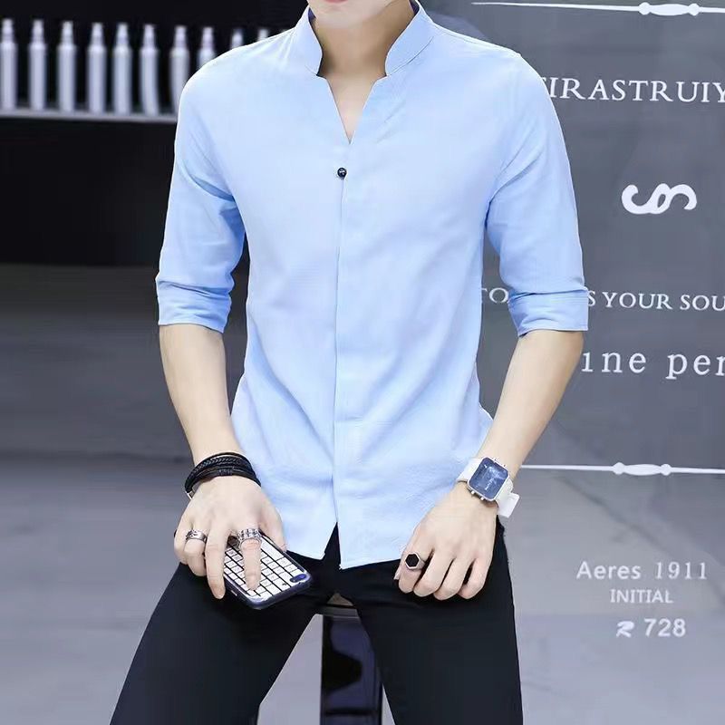 여름 얇은 남성 7부 소매 셔츠 한국 스타일 슬림 솔리드 컬러 다목적 통기성 셔츠 스탠드 칼라 미드 슬리브 트렌디스토어 가기