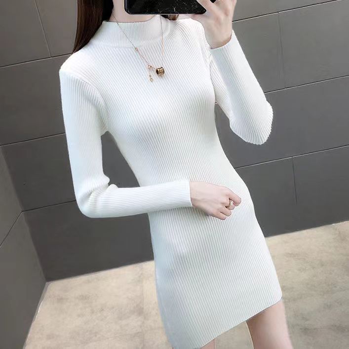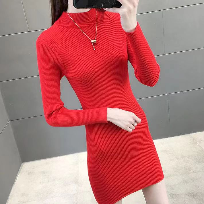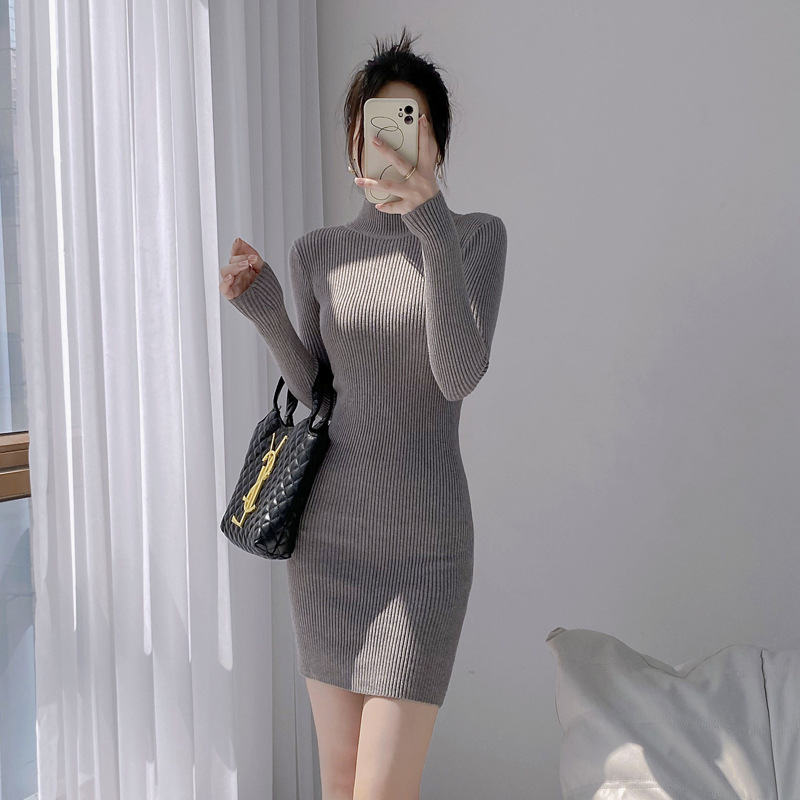 코어스판 원단 하프 터틀넥 니트 원피스 여성용 2025 가을 겨울 힙을 감싸는 스웨터 풀오버 니트 짧은 치마