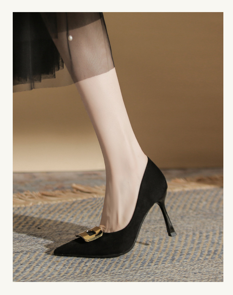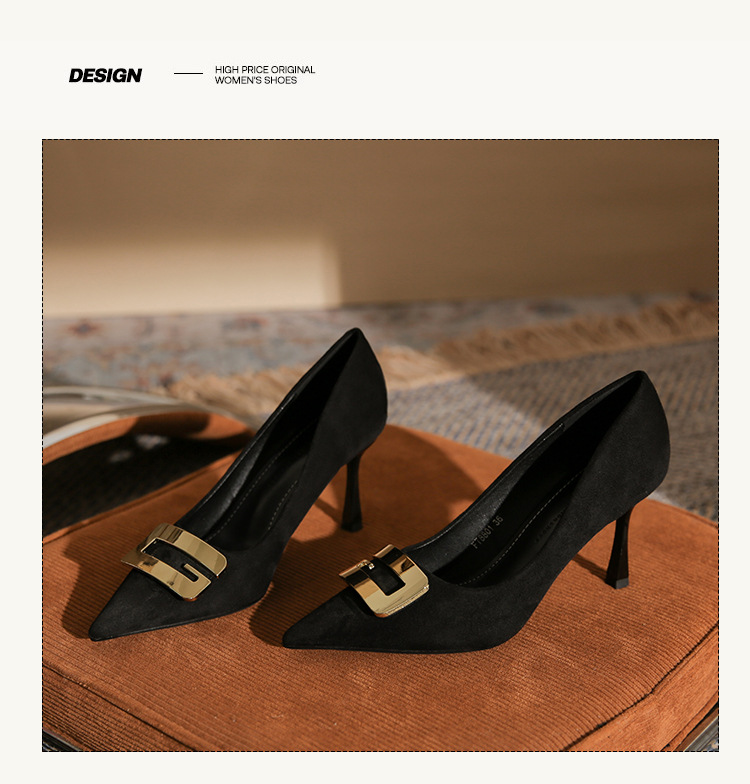 8801-97A 고급 메탈 버클 뾰족코 얕은 굽 얇은 굽 하이힐 2024 신상 여성용 하이힐