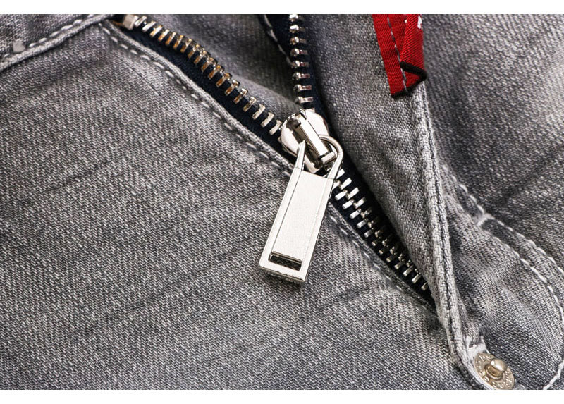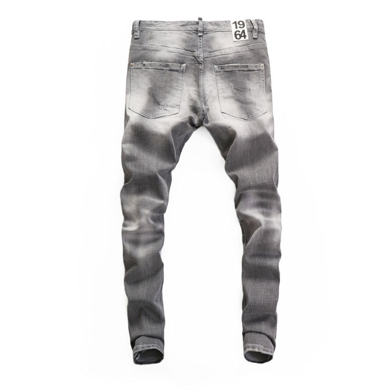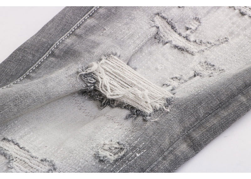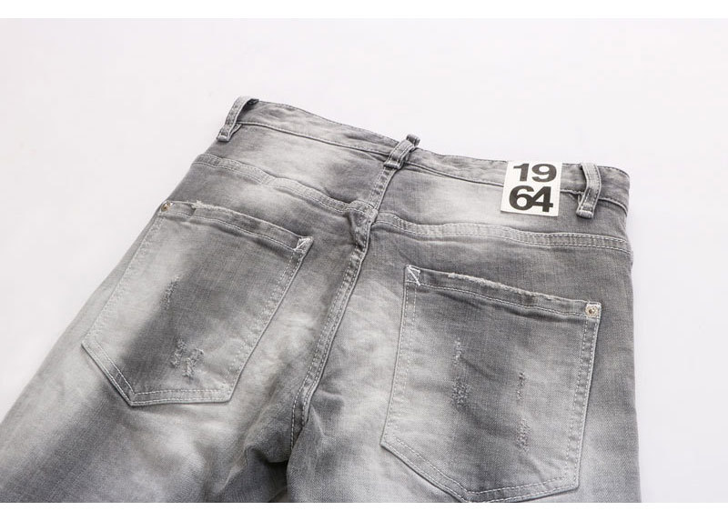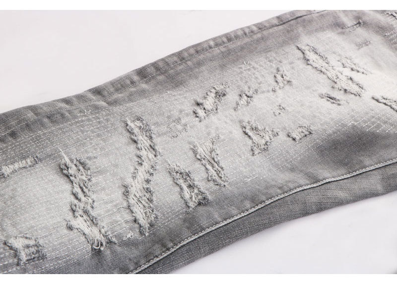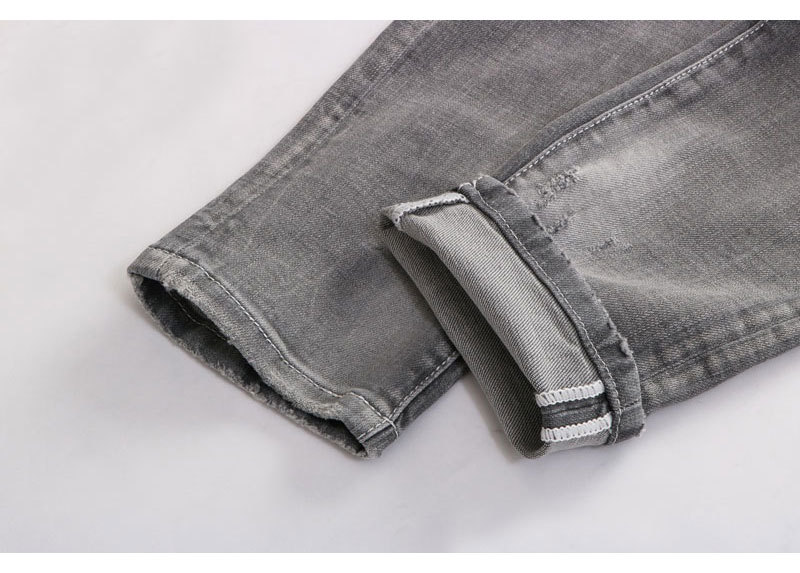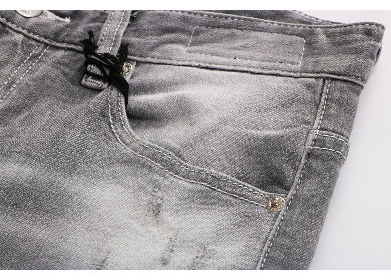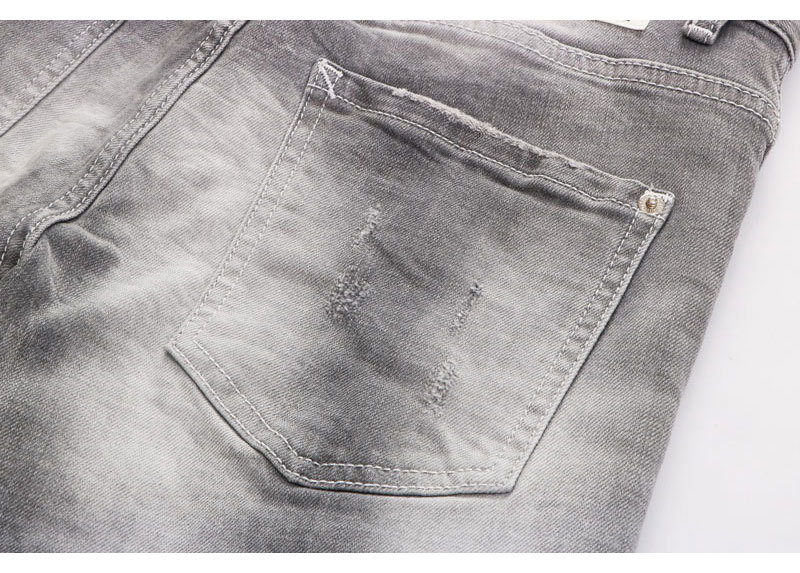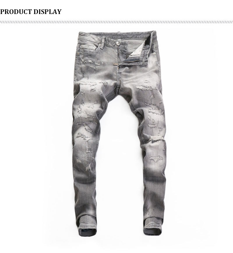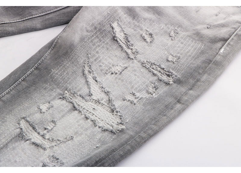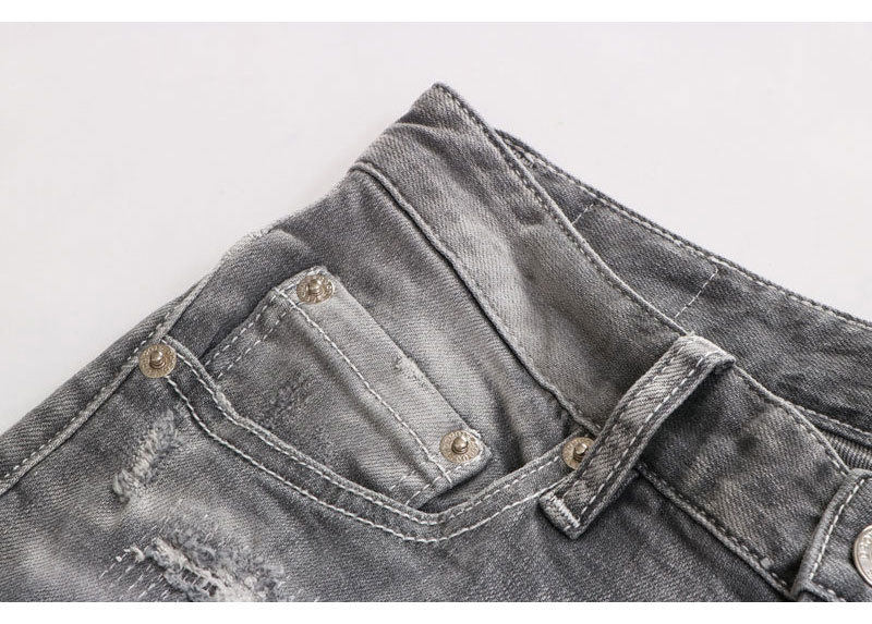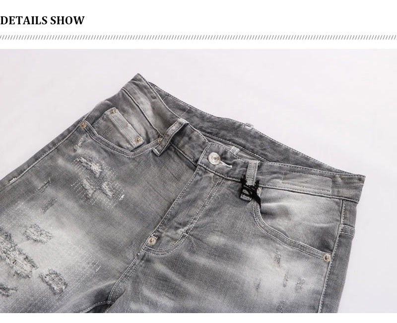 유럽과 미국의 거리 트렌디 한 패션 찢어진 남자 청바지 레트로 올드 그레이 마이크로 탄성 슬림 패치 청바지
