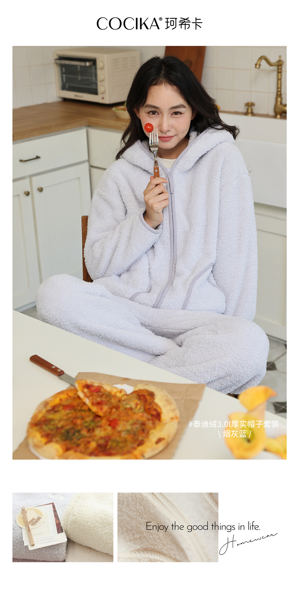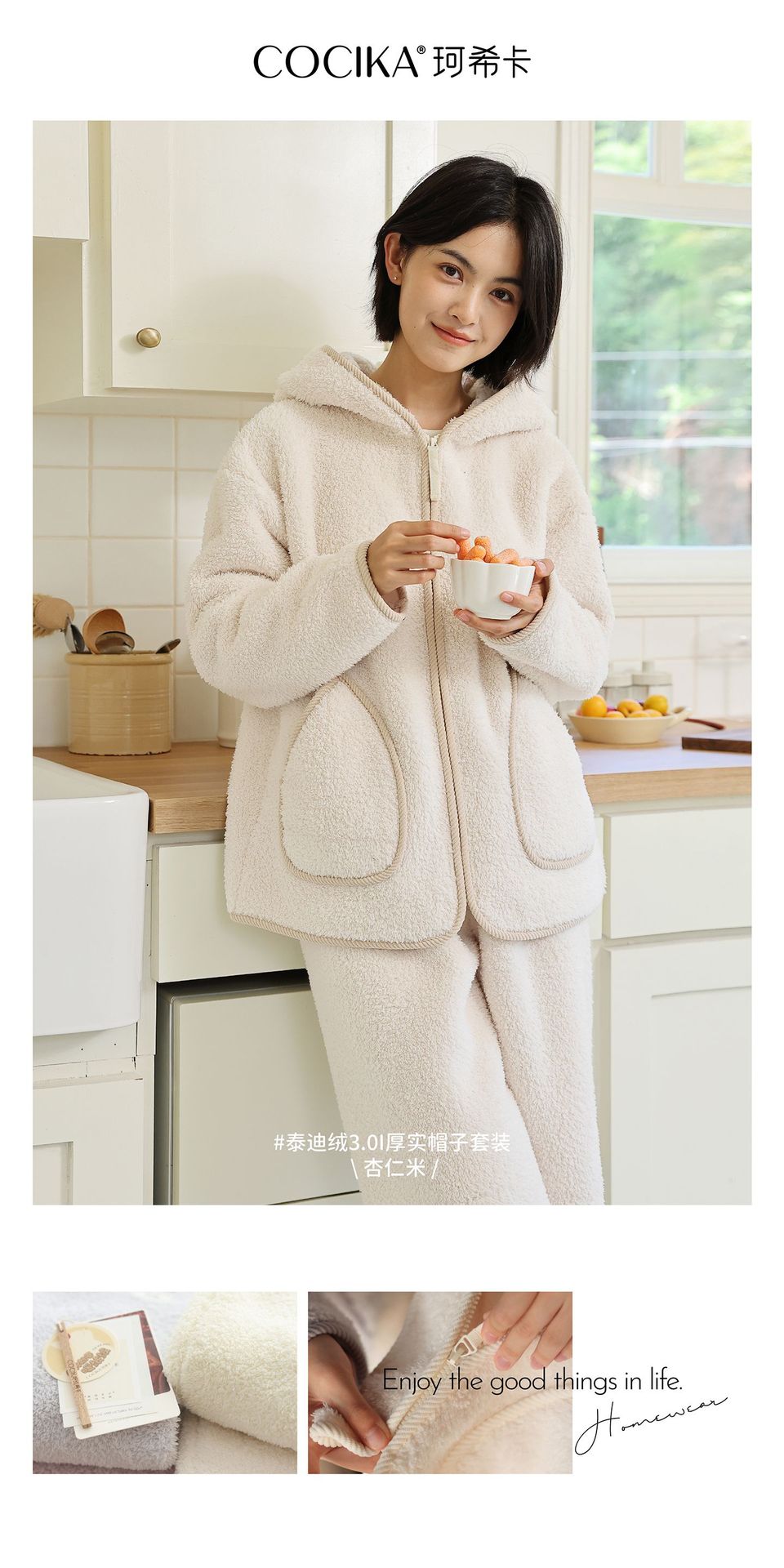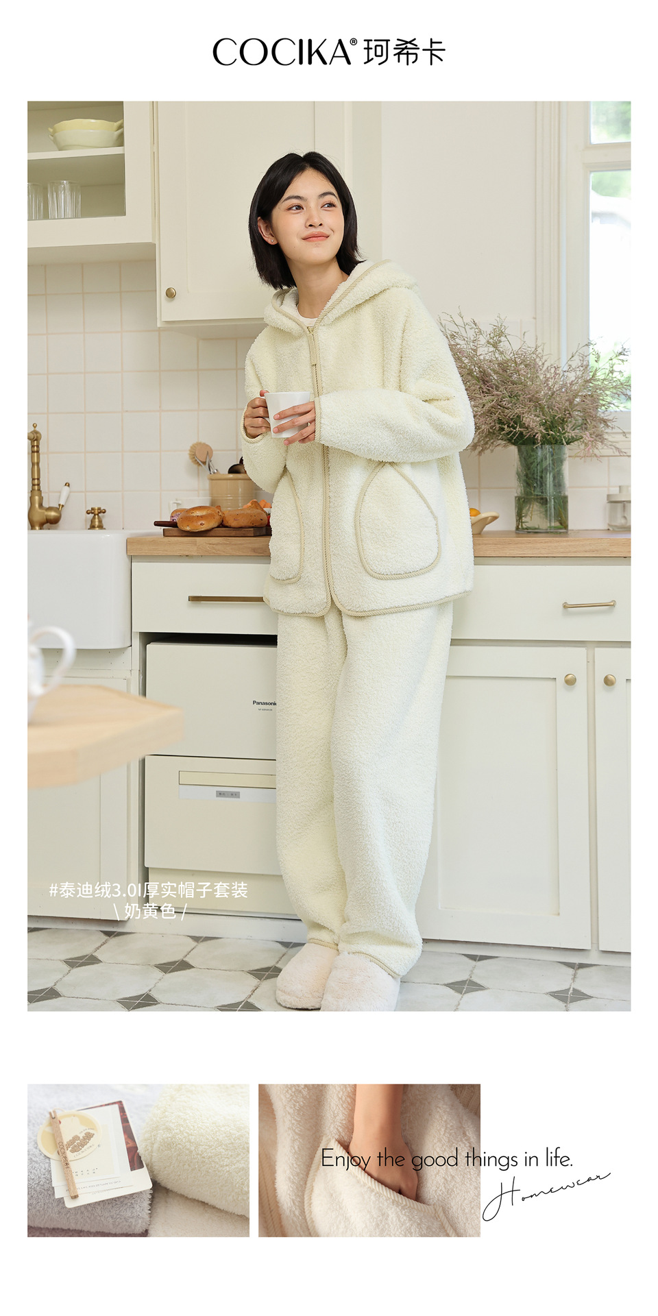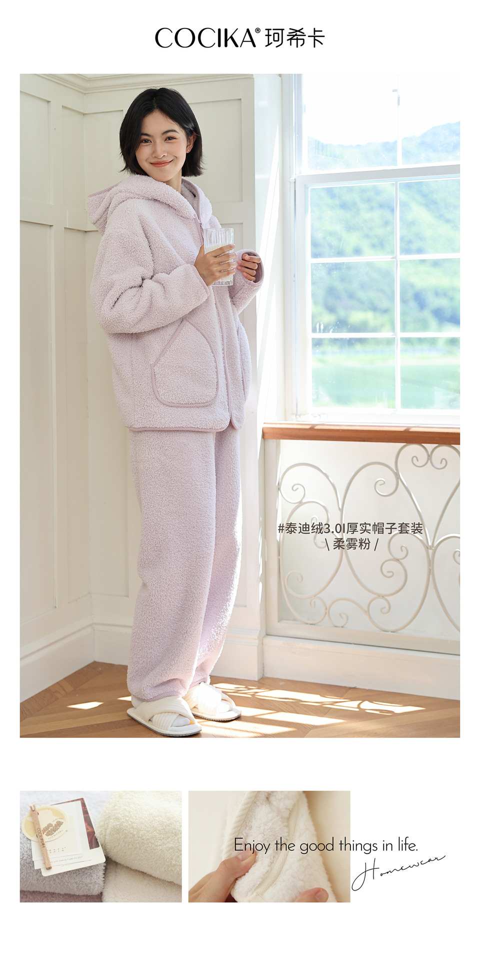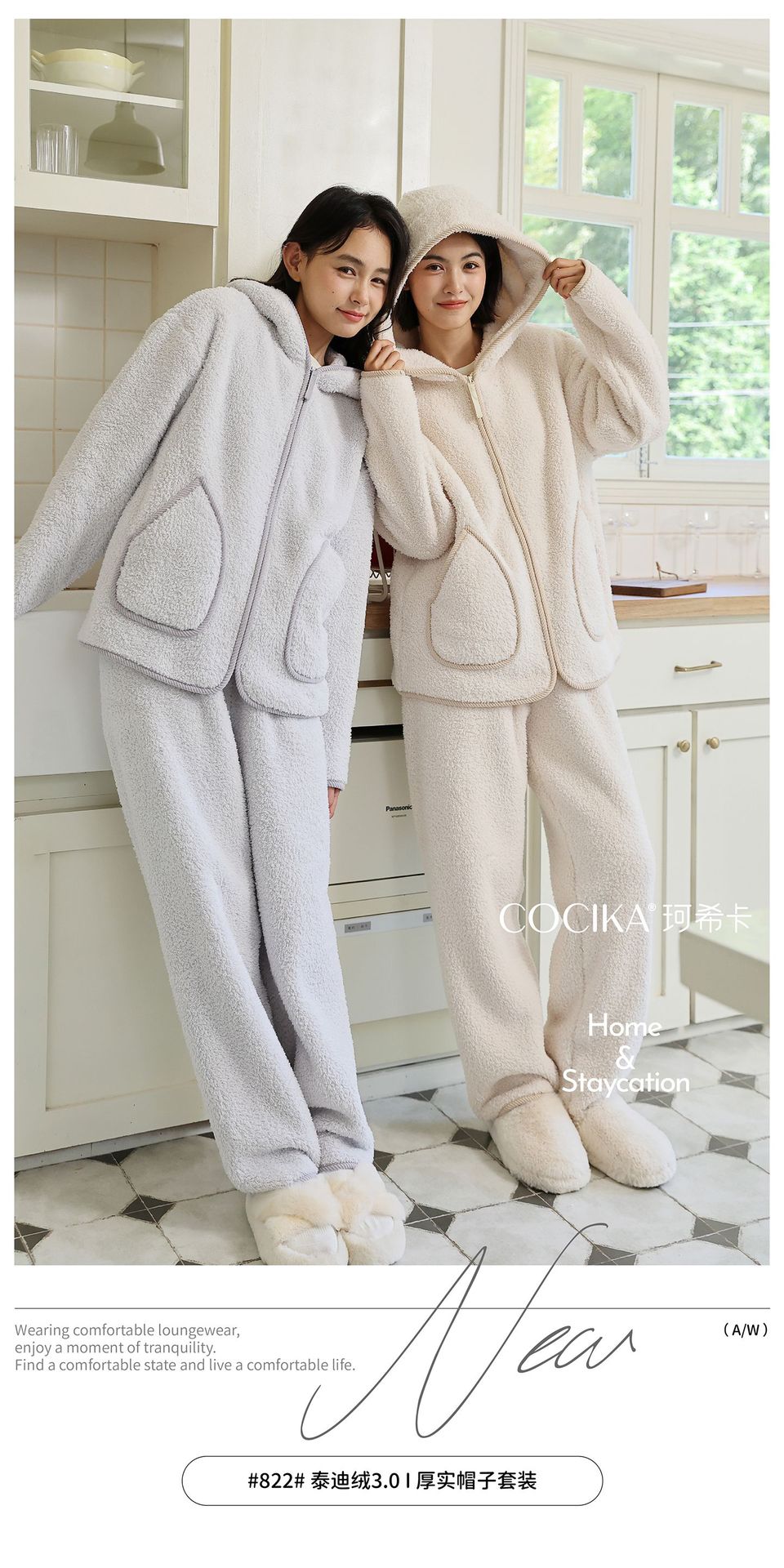 2025 가을 겨울 신상 여성용 테디 벨벳 후드 세트 홈웨어 외출 가능 캐주얼 따뜻한 두꺼운 잠옷