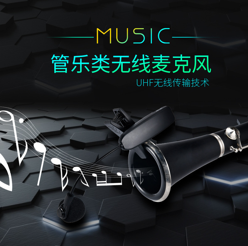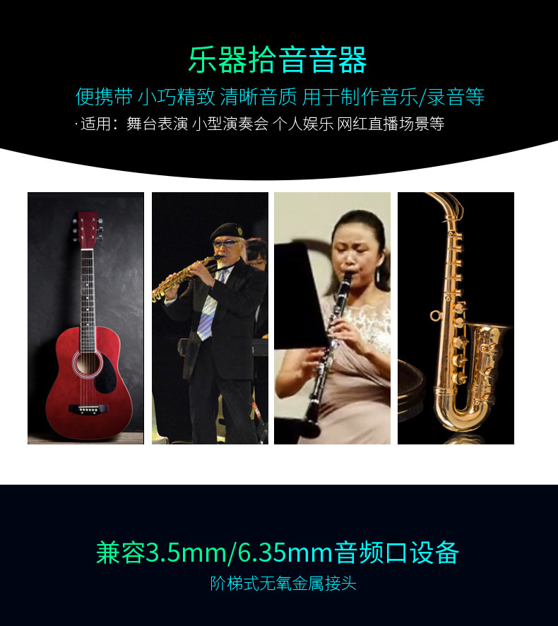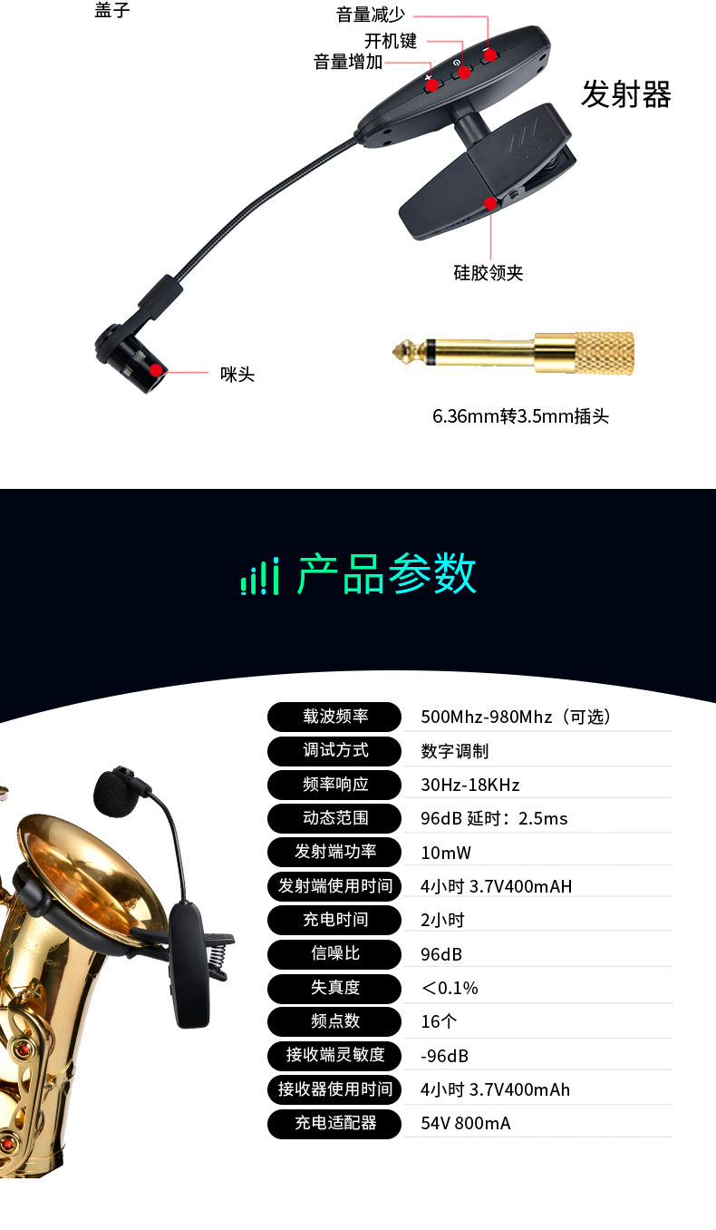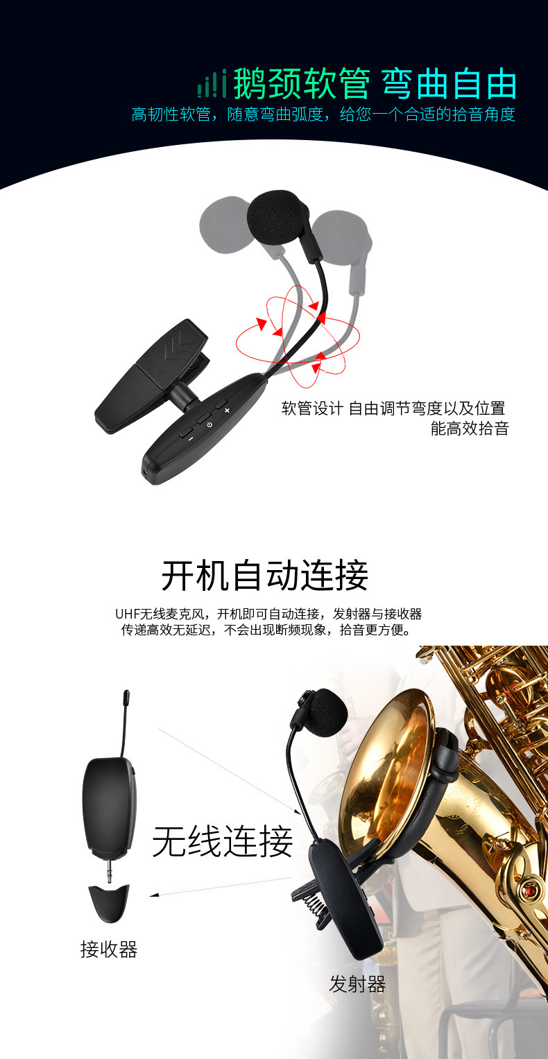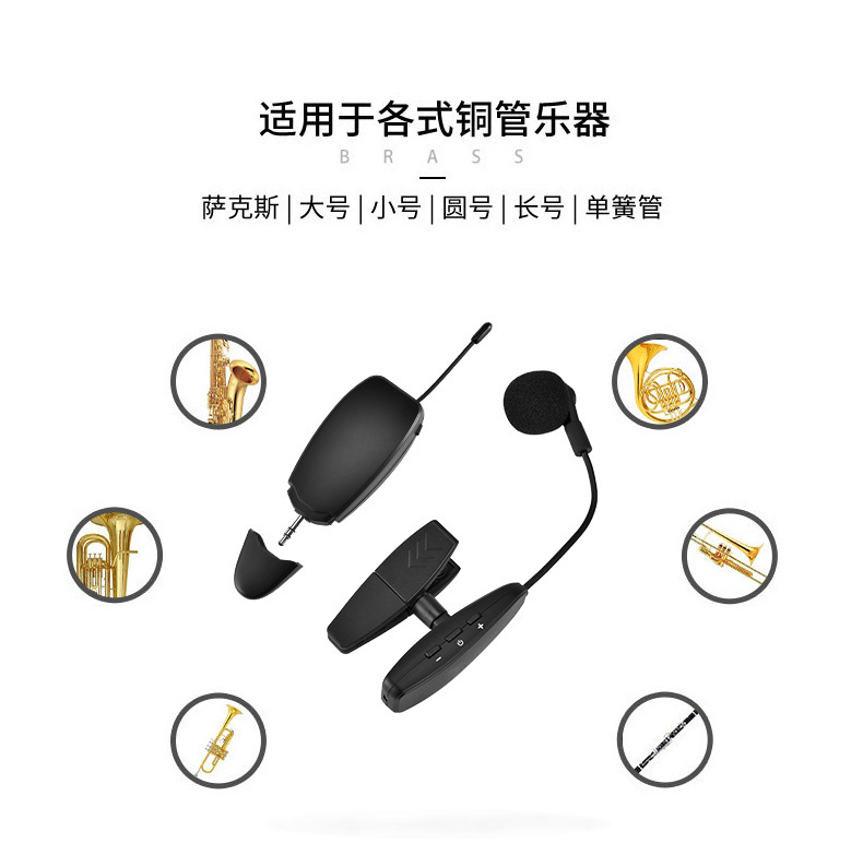 360度硅胶防震夹,14500锂电池800MAH容量,高档演艺箱。适合萨克斯、单簧管、大号、小号、圆号、长号等乐器。接收器便携小巧,接收距离45米,16个频点可换,可多台同时使用。支持一拖二。