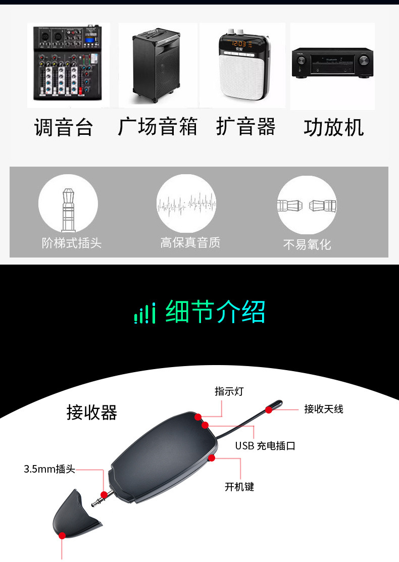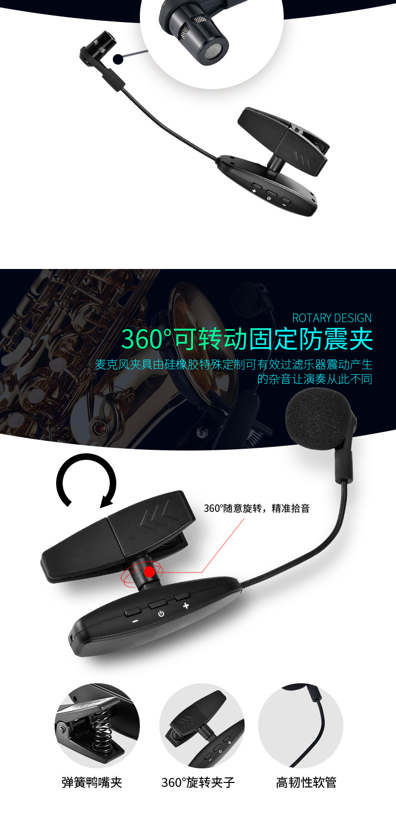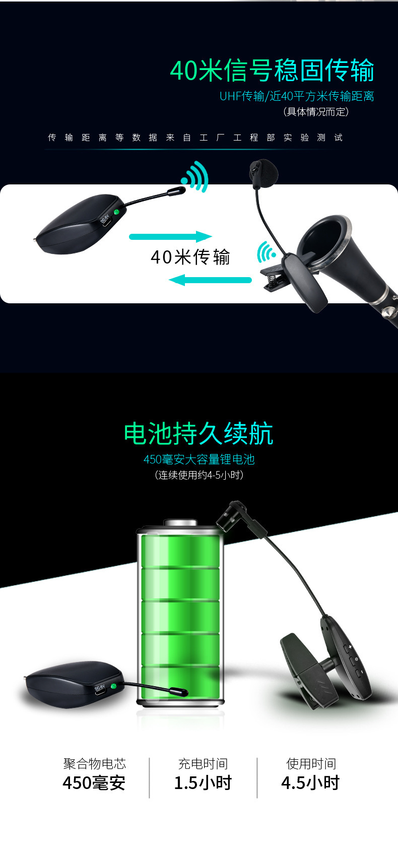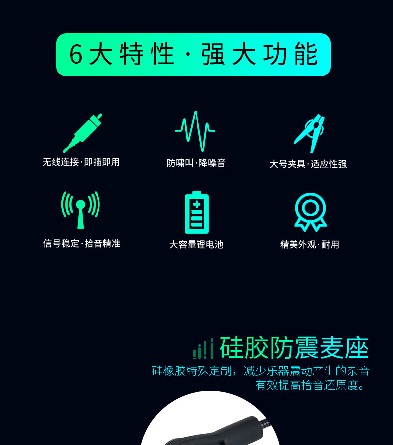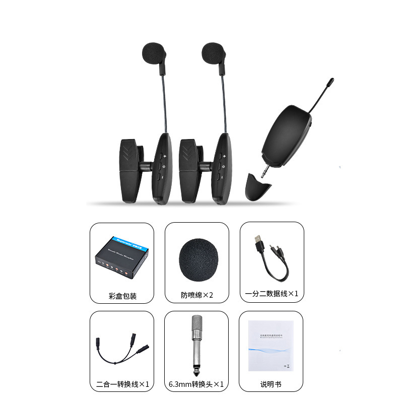 360度硅胶防震夹,14500锂电池800MAH容量,高档演艺箱。适合萨克斯、单簧管、大号、小号、圆号、长号等乐器。接收器便携小巧,接收距离45米,16个频点可换,可多台同时使用。支持一拖二。