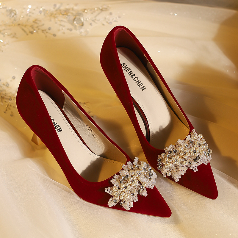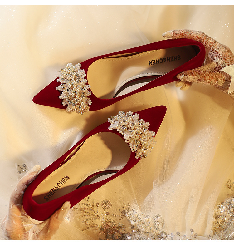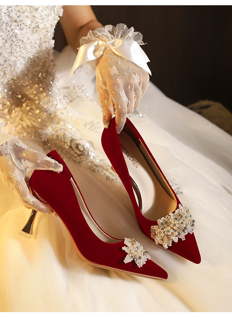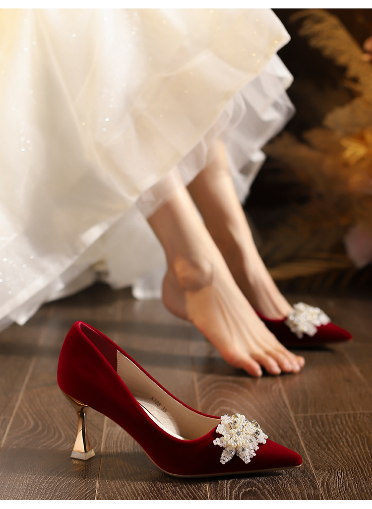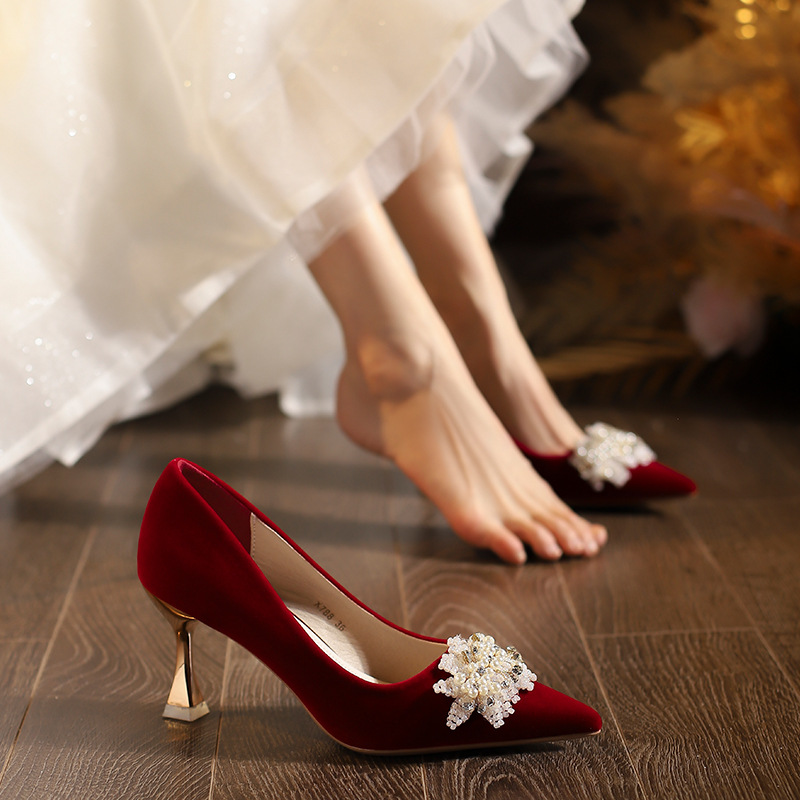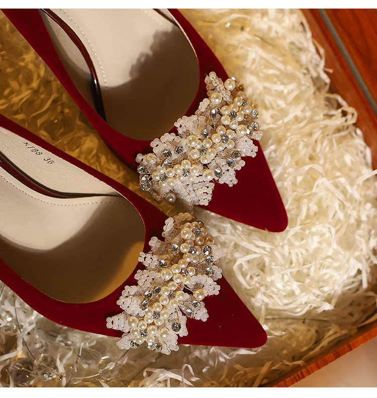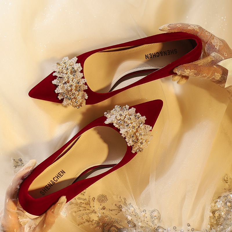 X788-18 빨간 웨딩 슈즈 Xiuhe 원피스 하이힐 여성용 얇은 굽 뾰족한 신발 피곤하지 않은 발 신부 신발 40-43