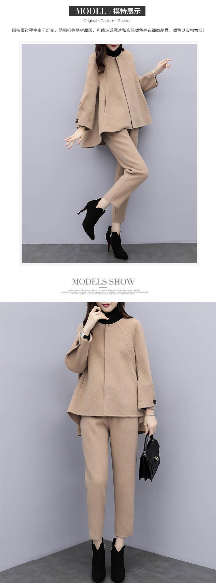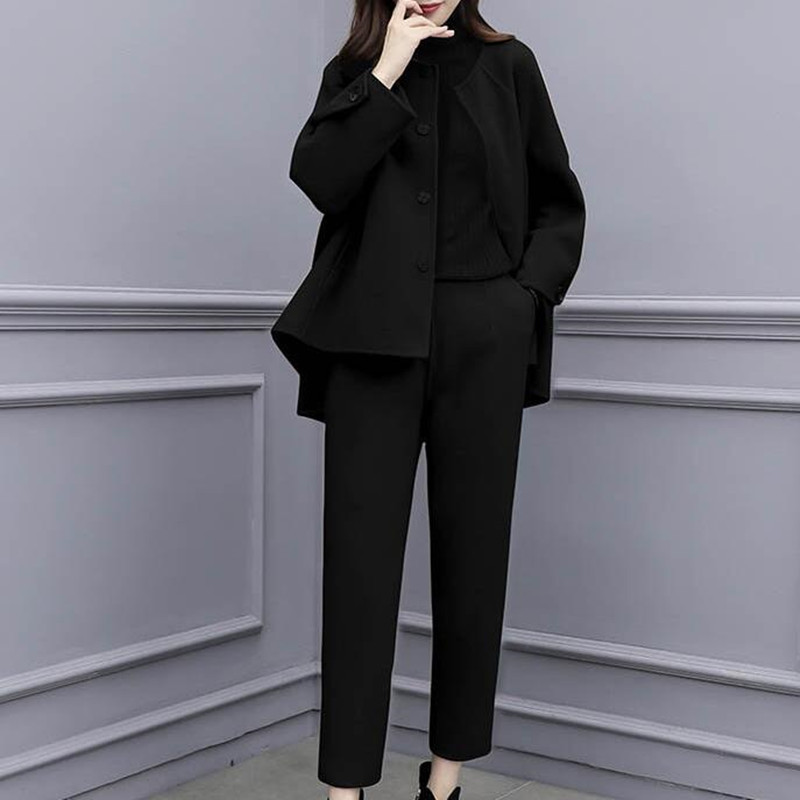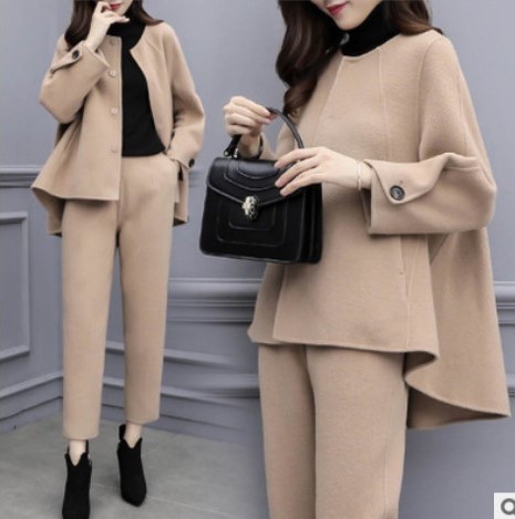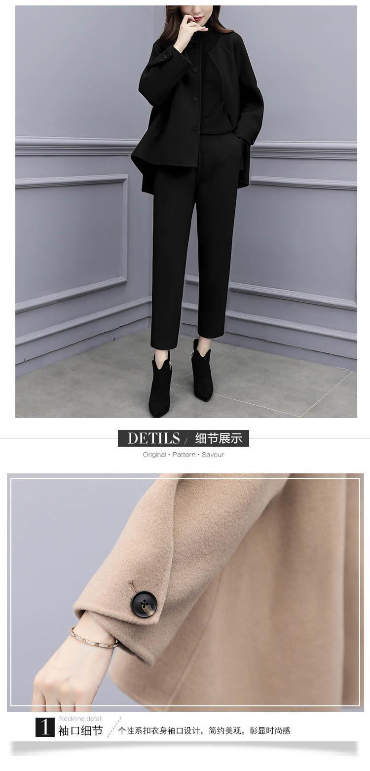 2025 신상 여성 가을 겨울 모직 투피스 세트, 큰 사이즈 코트와 당근 바지, 캐주얼 패션 세트, 여성스럽고 세련된 스타일스토어 가기