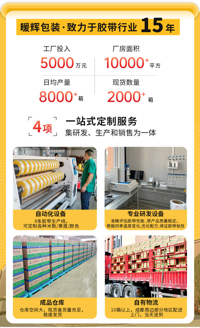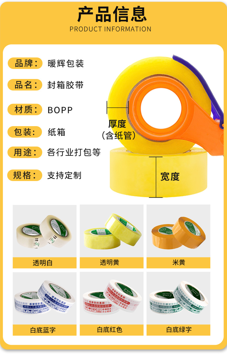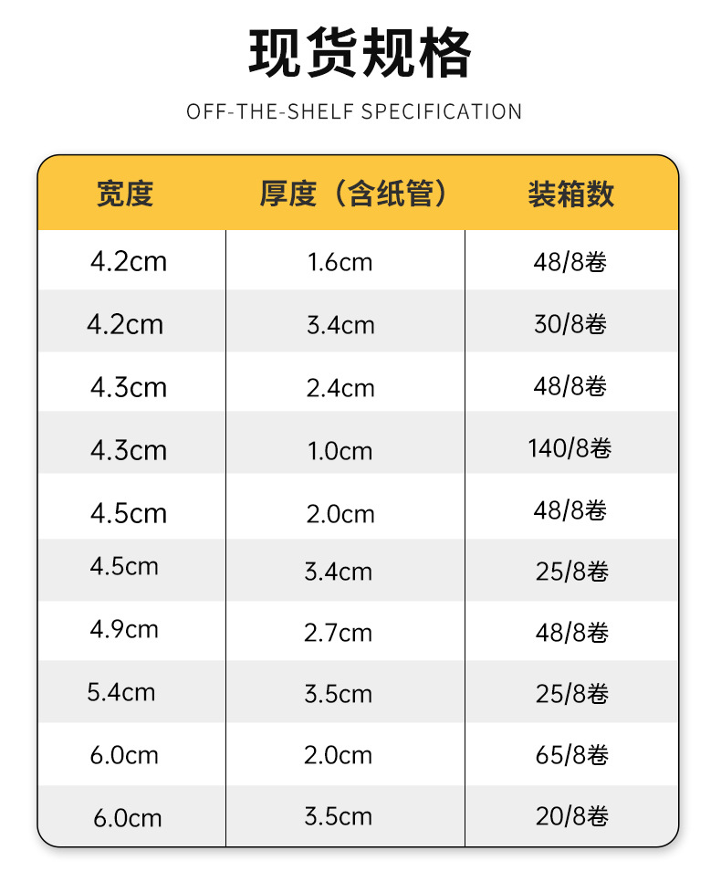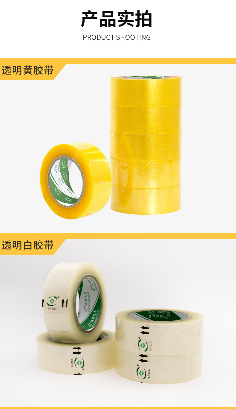 • 투명한 노란색; 폭 4.3 * 두께 2.0cm * 130(48 롤/상자 절단 기계)