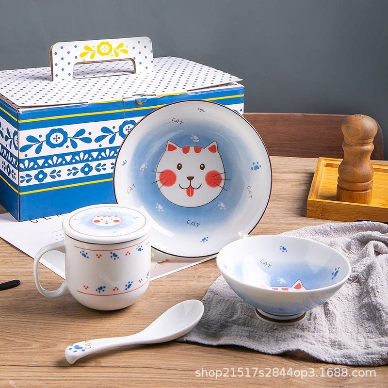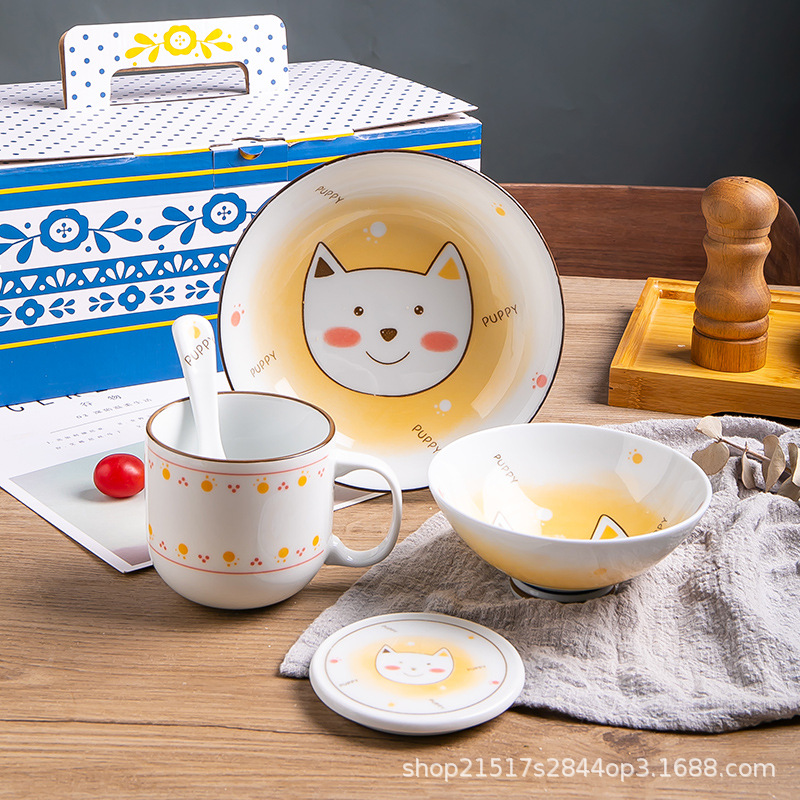 일본식 만화 간단한 고양이와 개 세라믹 컵 식기 세트 가정용 만화 밥 그릇 접시 물 컵 선물 상자 세트