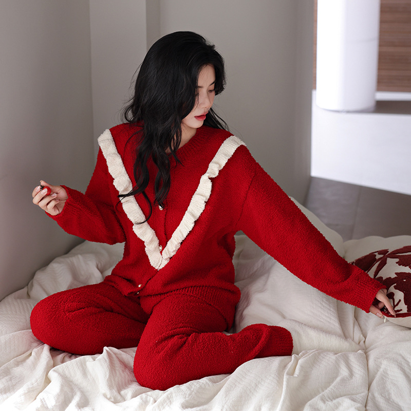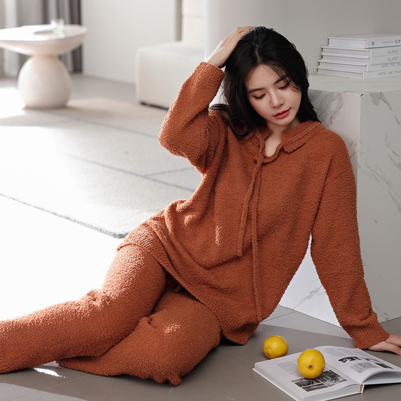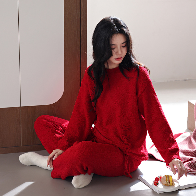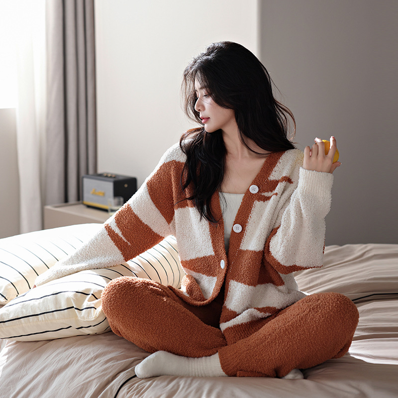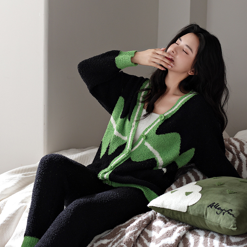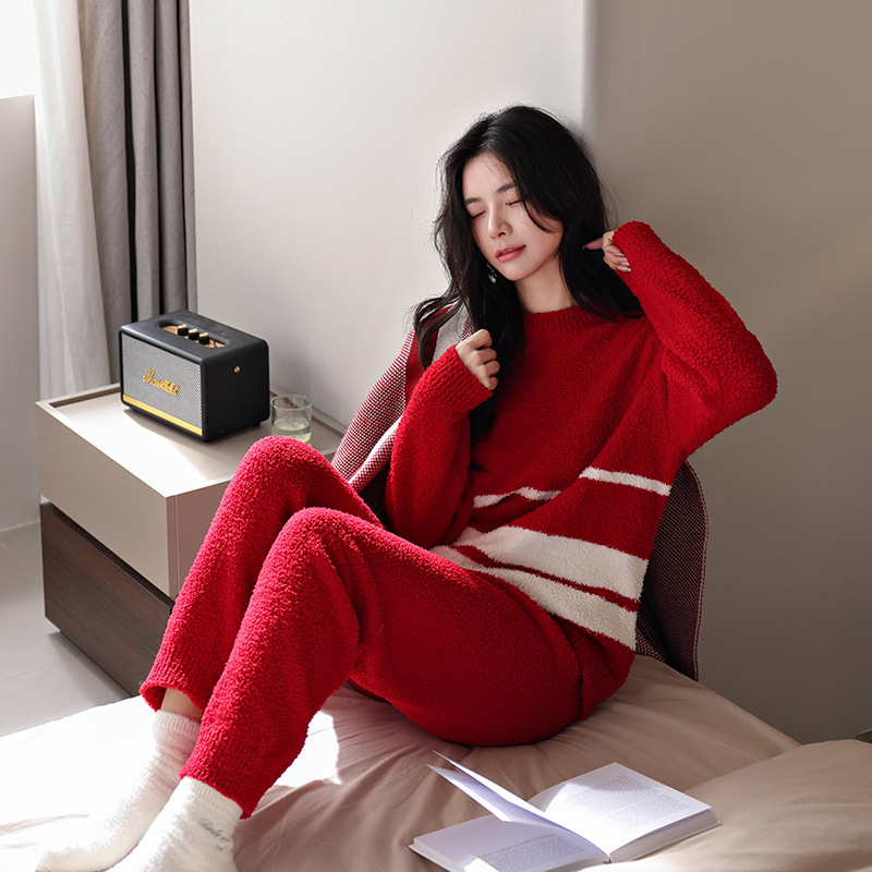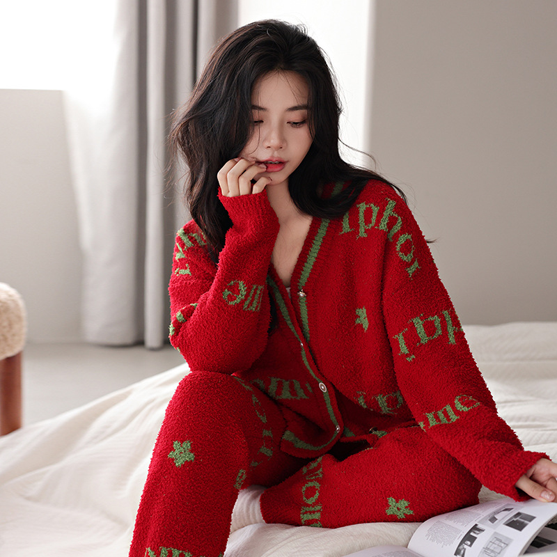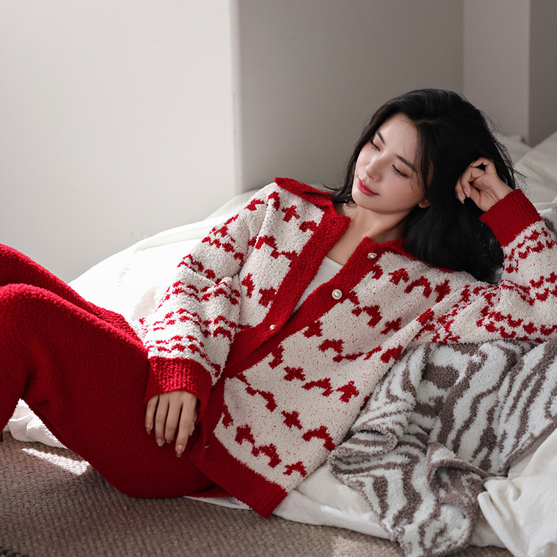 【부드러운 반양털】신상 코랄벨벳 잠옷 여성용 겨울 두꺼운 보온 자카드 고급 외출복 세트
