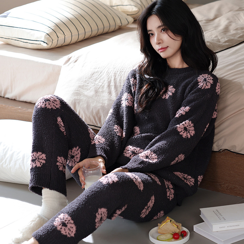 【부드러운 반양털】신상 코랄벨벳 잠옷 여성용 겨울 두꺼운 보온 자카드 고급 외출복 세트스토어 가기