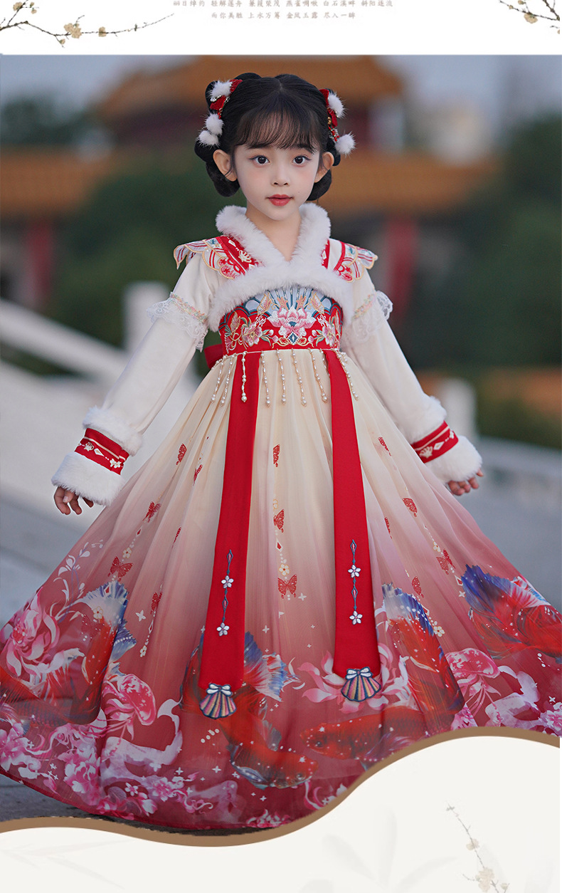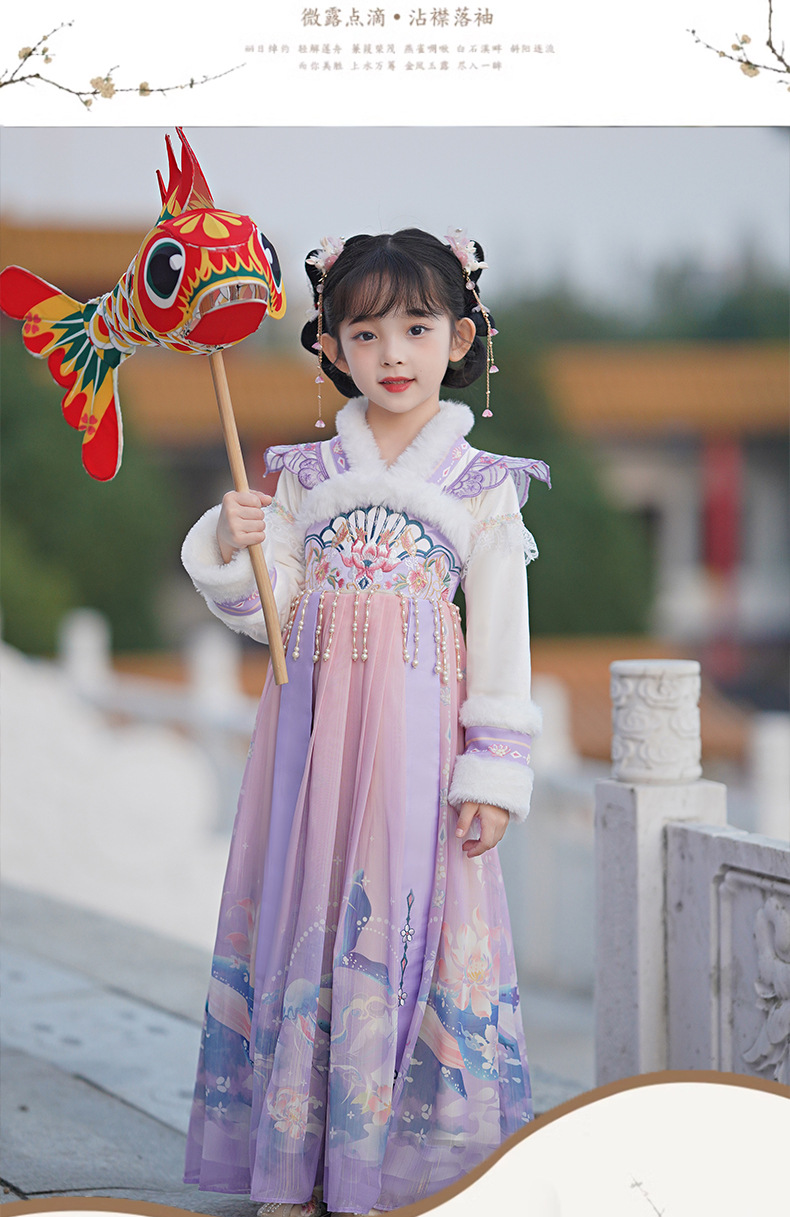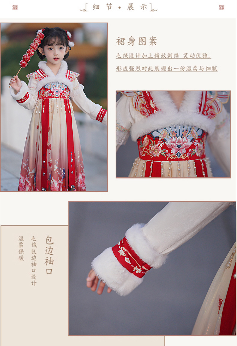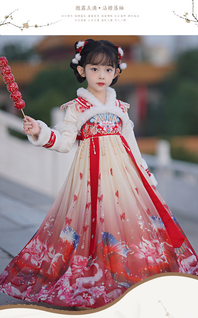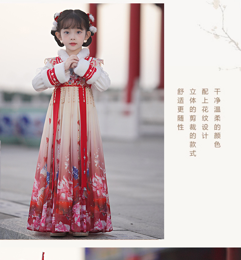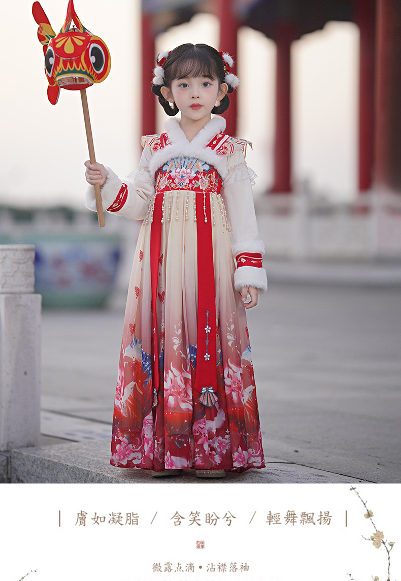 Hanfu 소녀의 겨울 2023 새로운 새해 전야 옷 겨울 옷 어린이 고대 의상 중국 스타일 당나라 세트 새해 옷