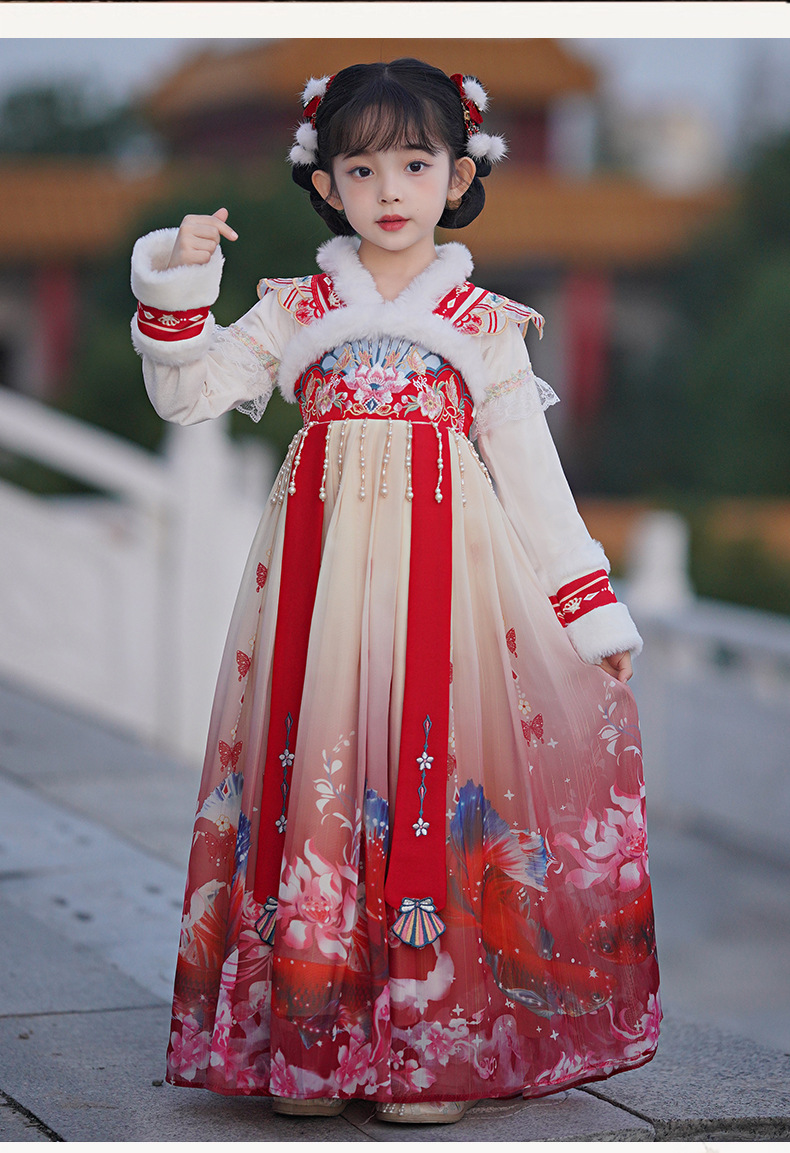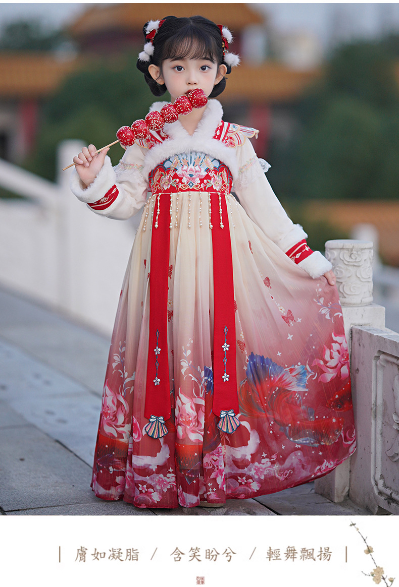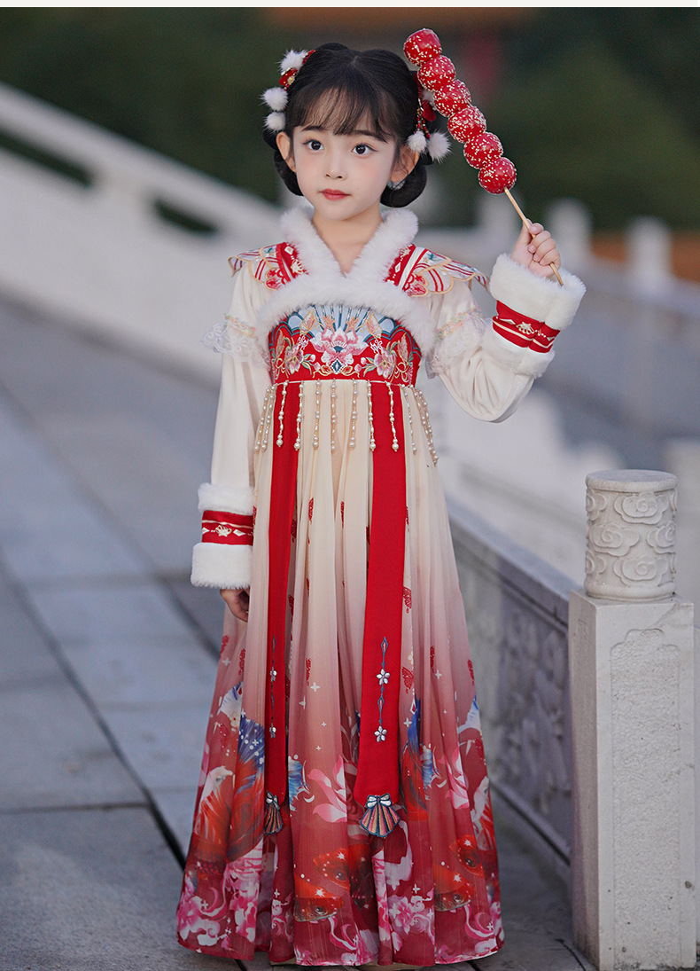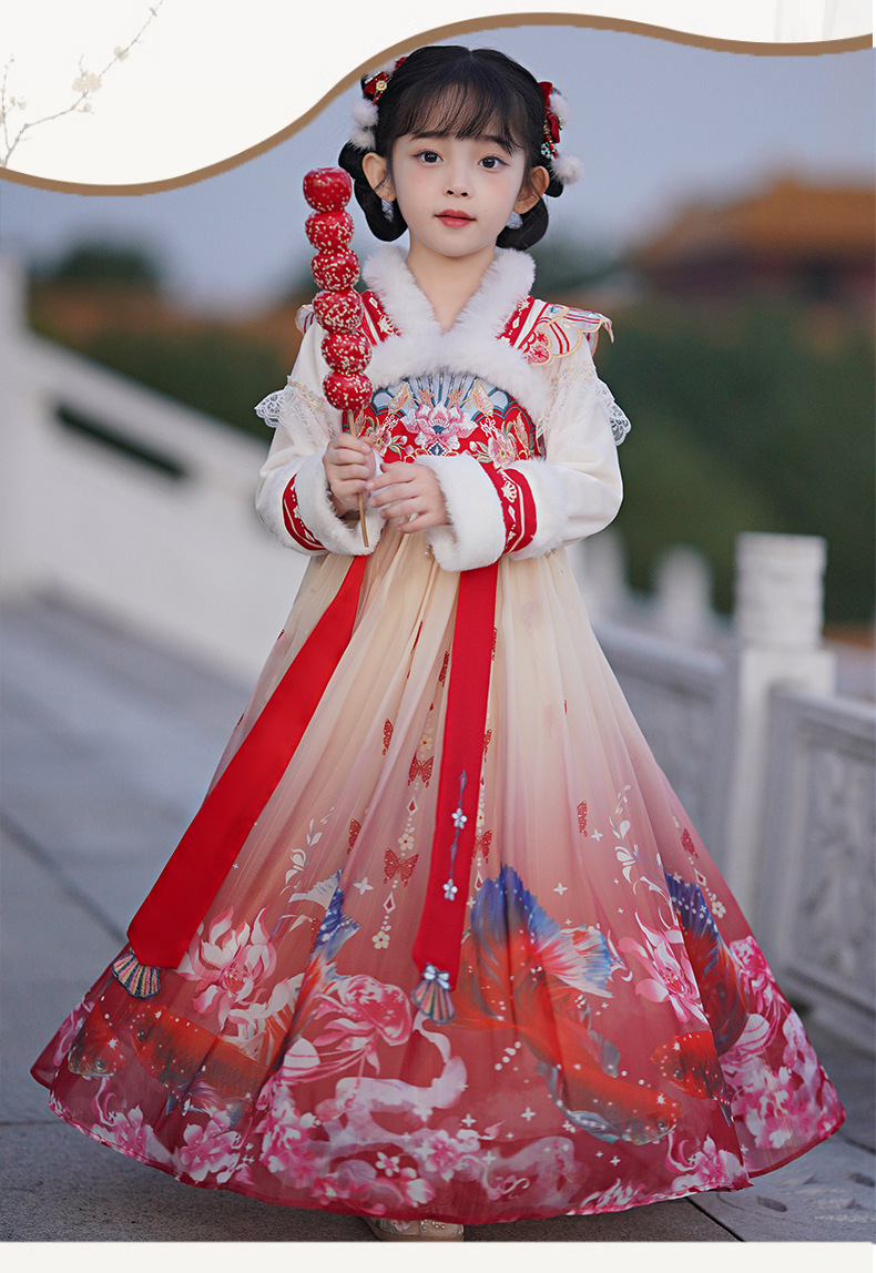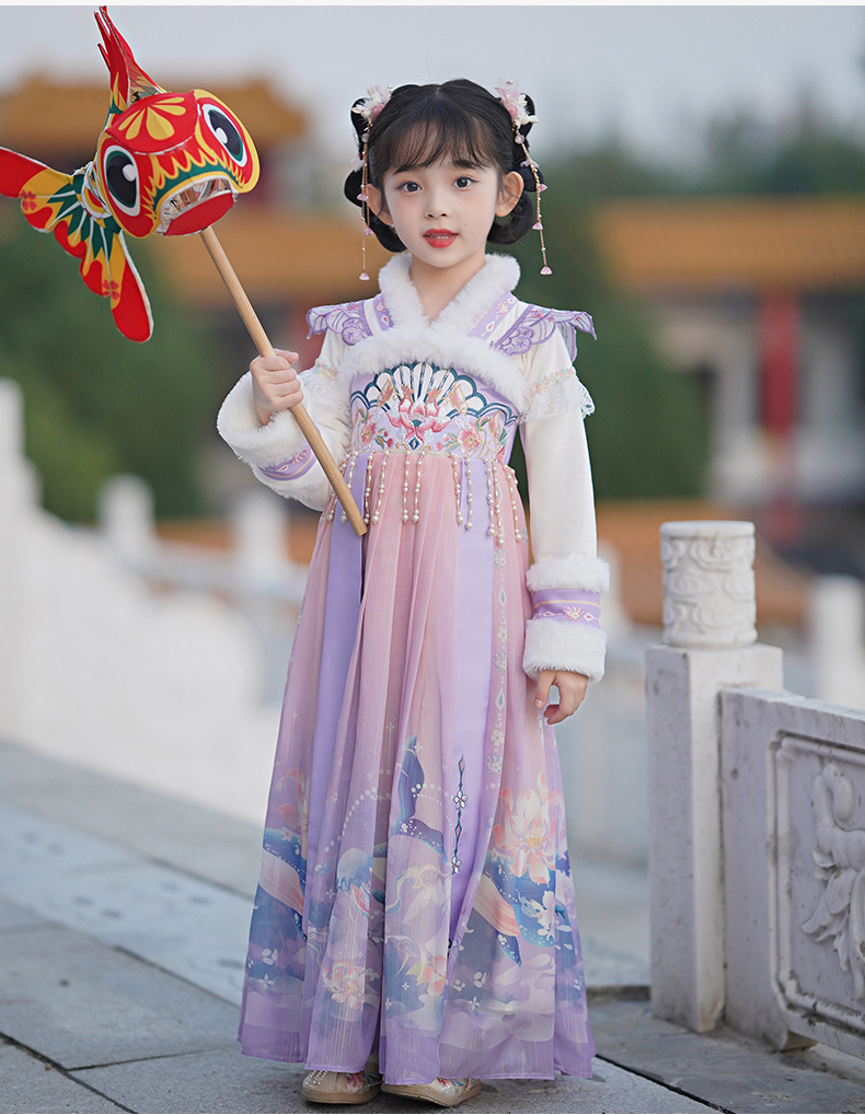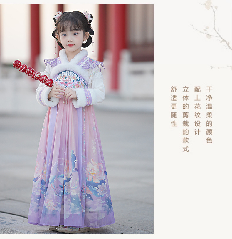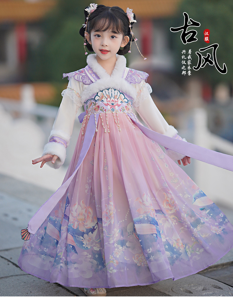 Hanfu 소녀의 겨울 2023 새로운 새해 전야 옷 겨울 옷 어린이 고대 의상 중국 스타일 당나라 세트 새해 옷
