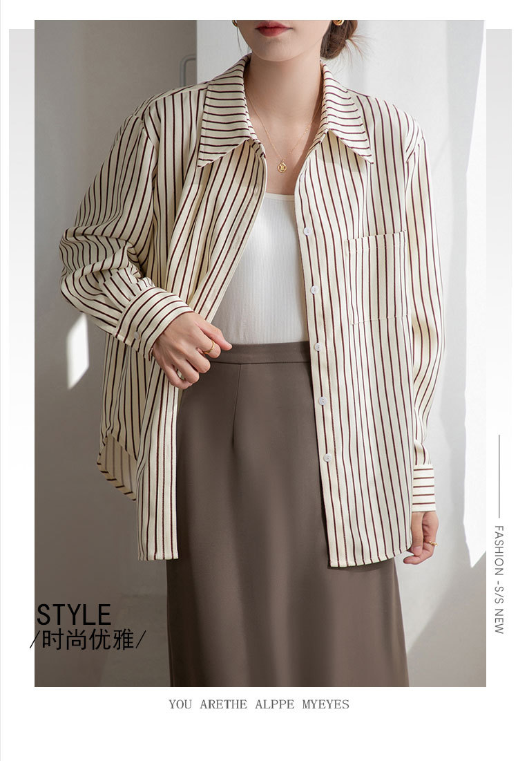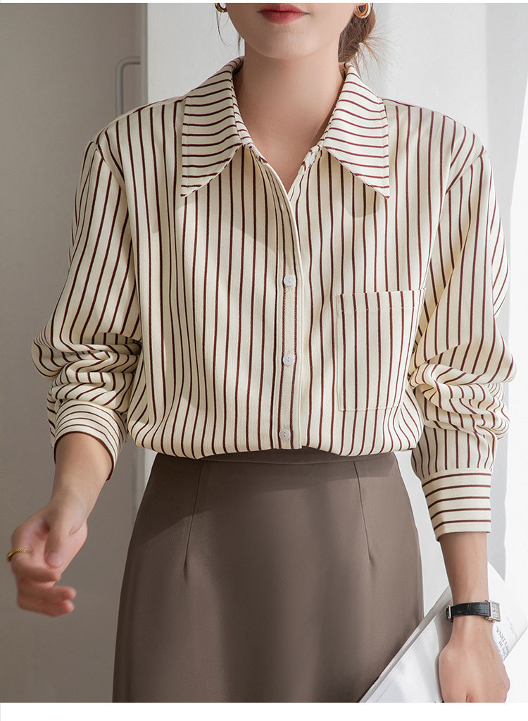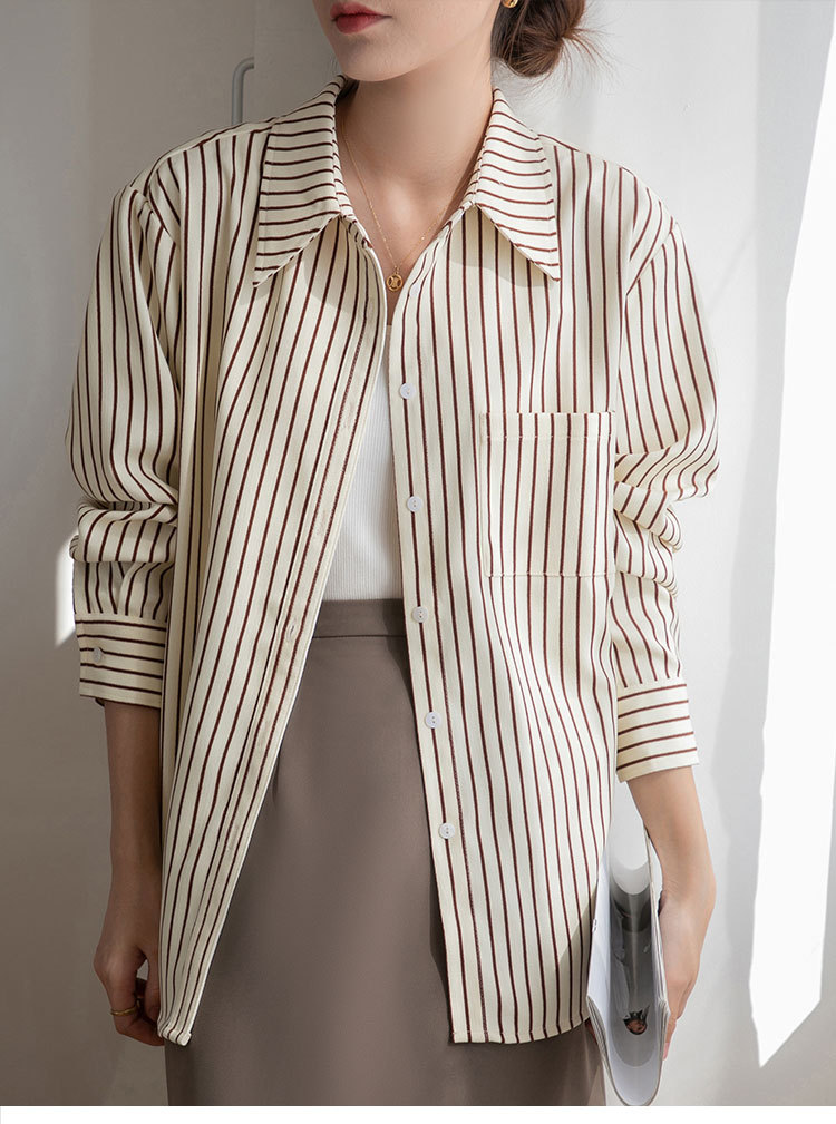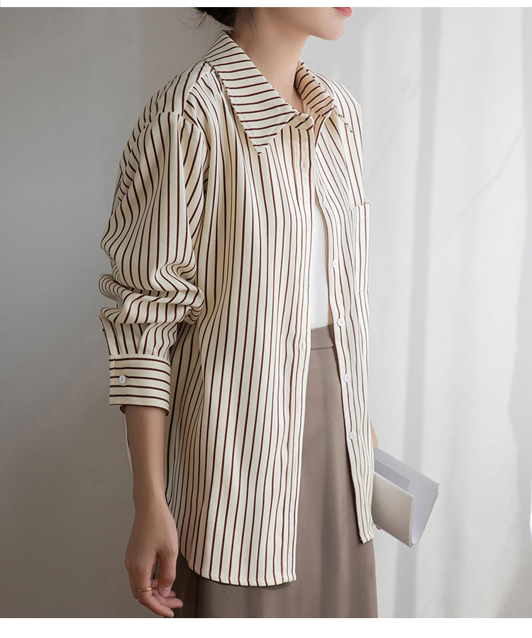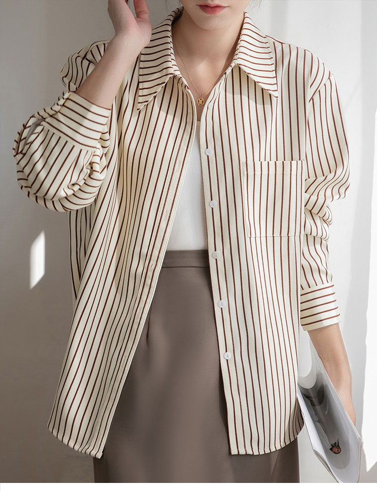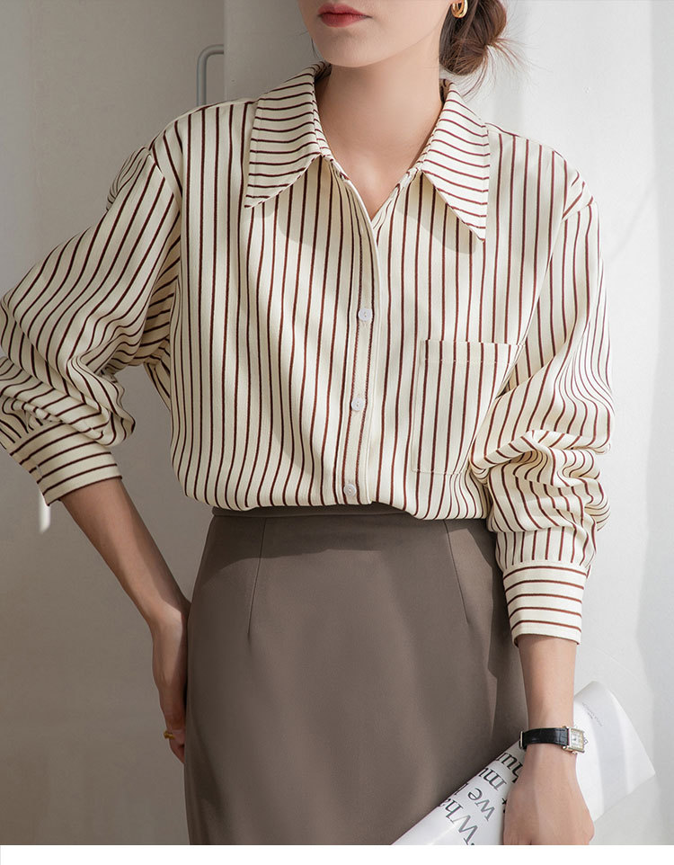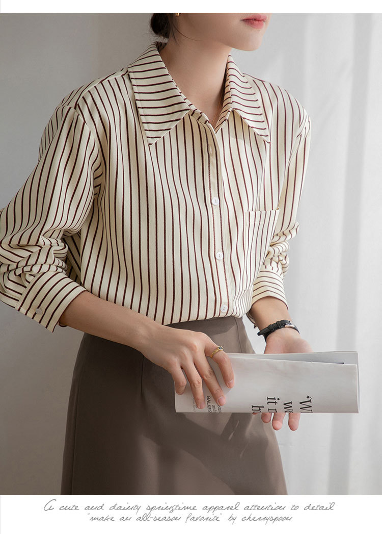 리얼 샷 롱 슬리브 편안한 모든 매치 셔츠 여성용 베이스 셔츠 느슨한 탑 라이트 우아한 통근 심플 인테리어 스트라이프 셔츠