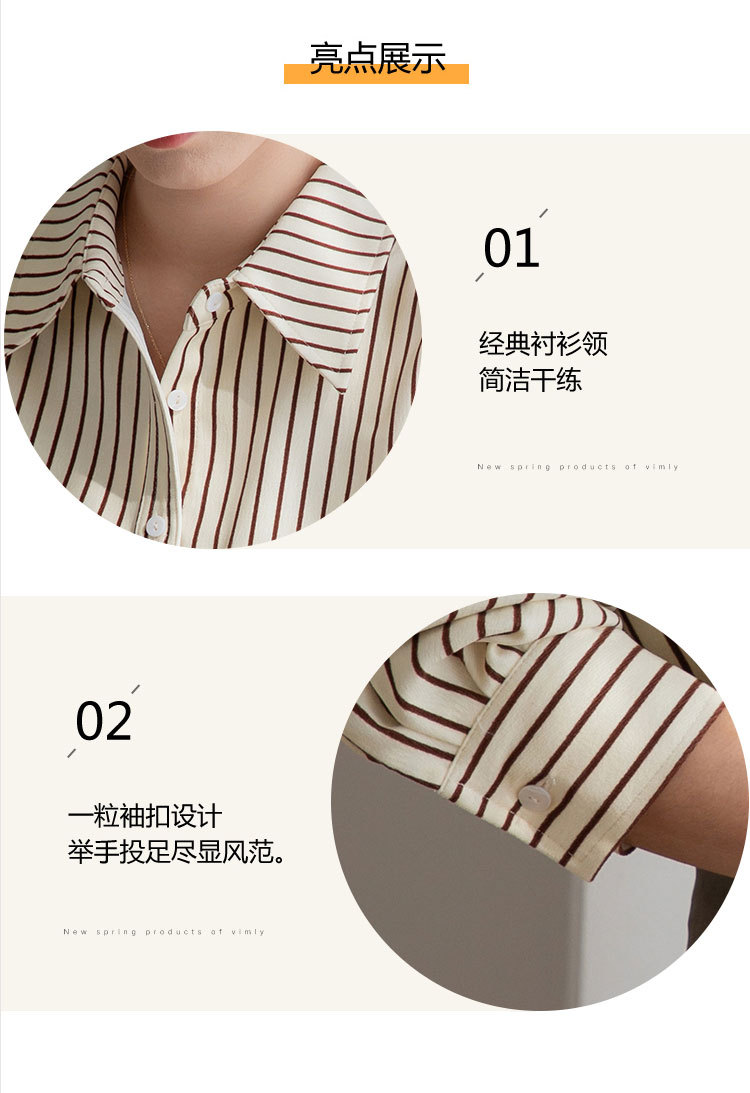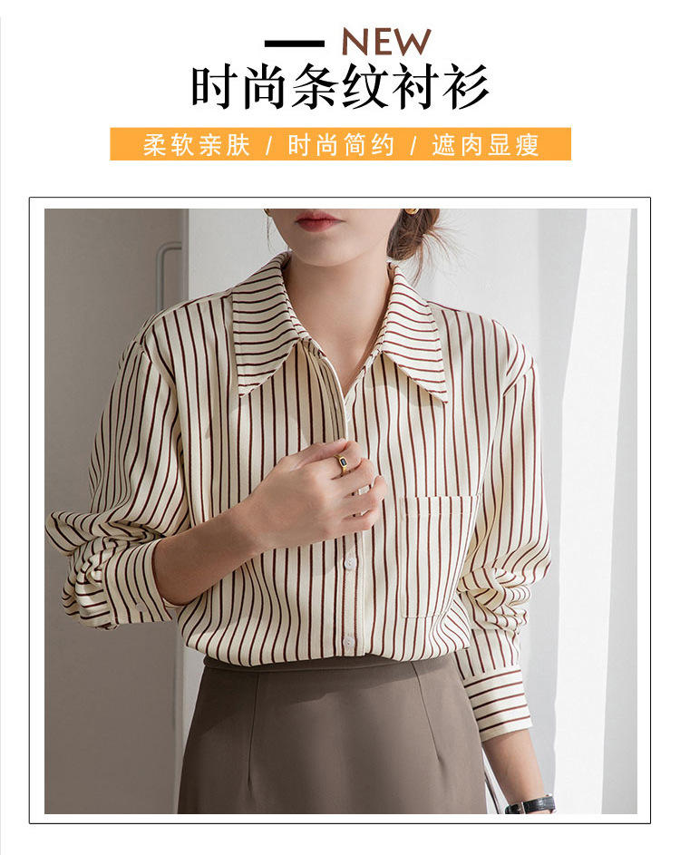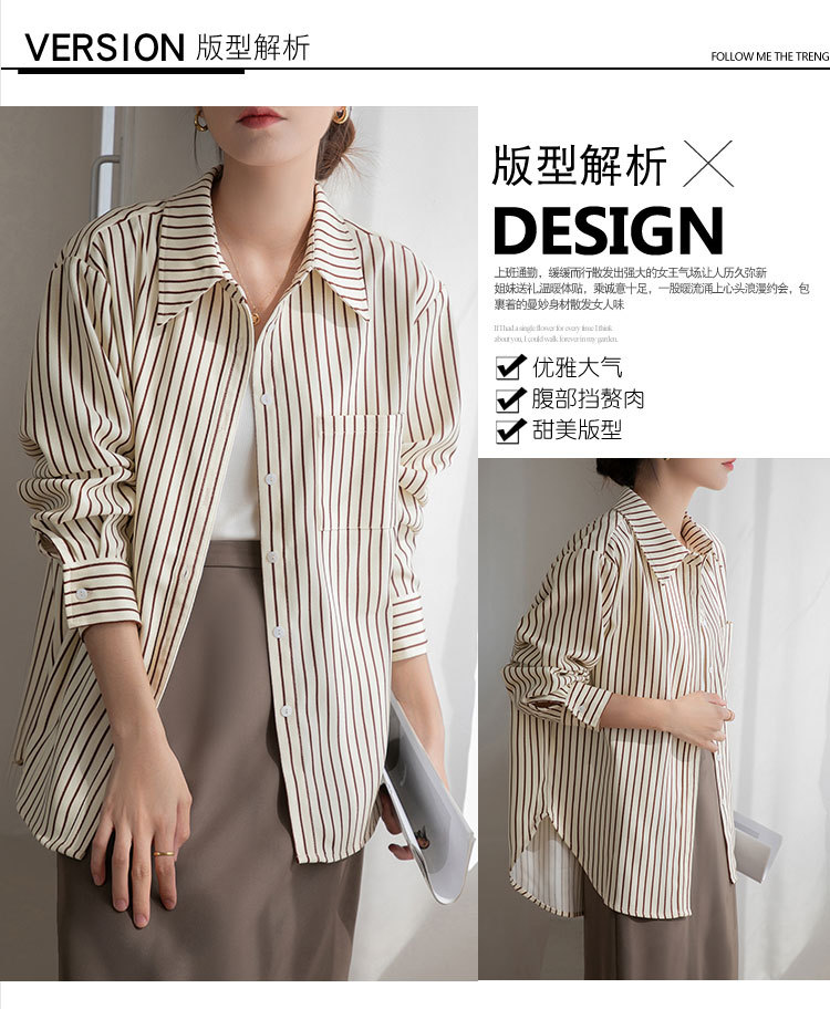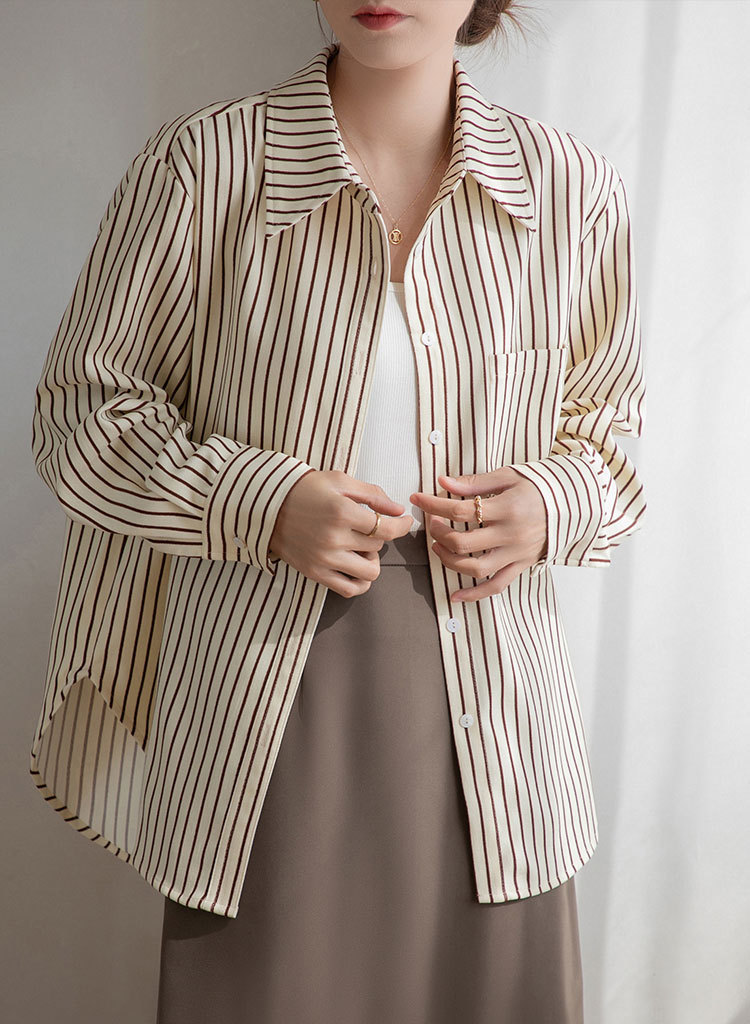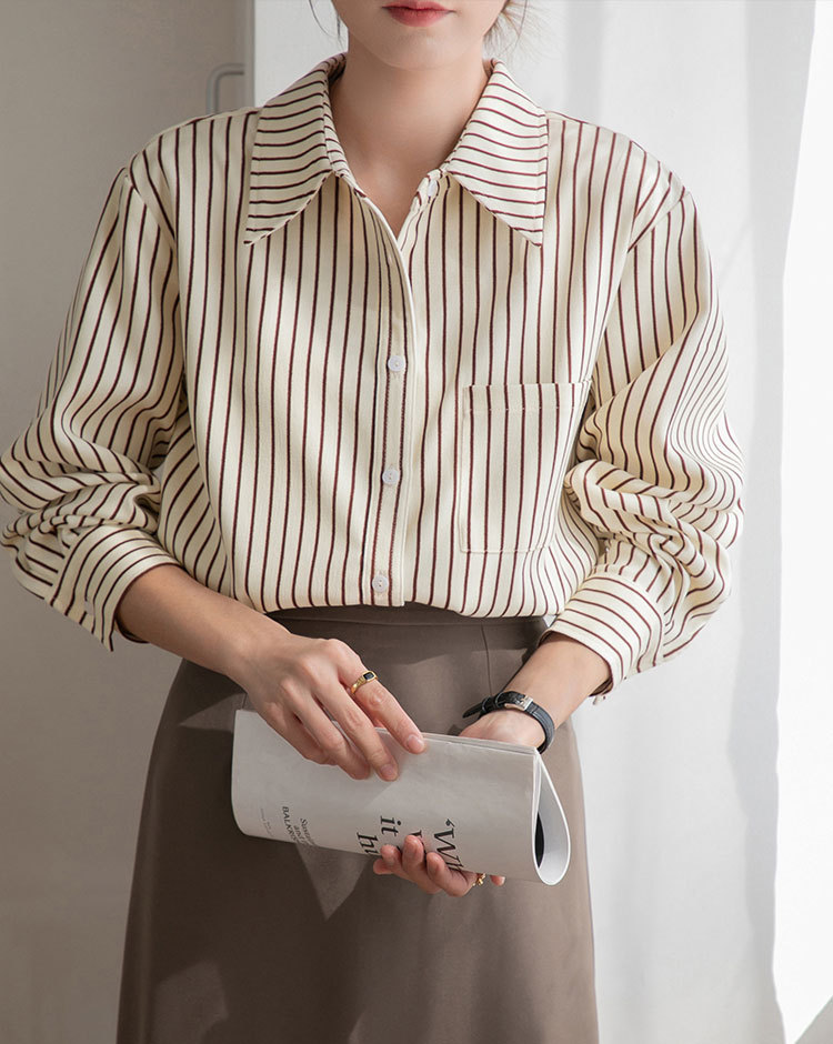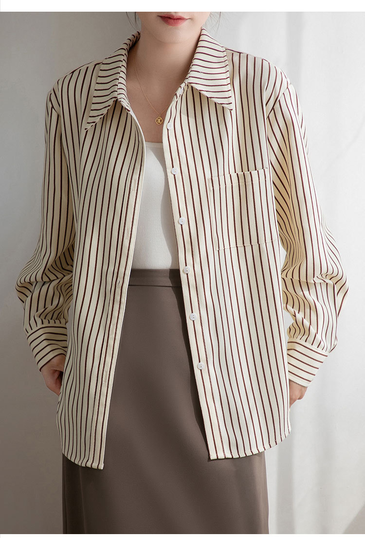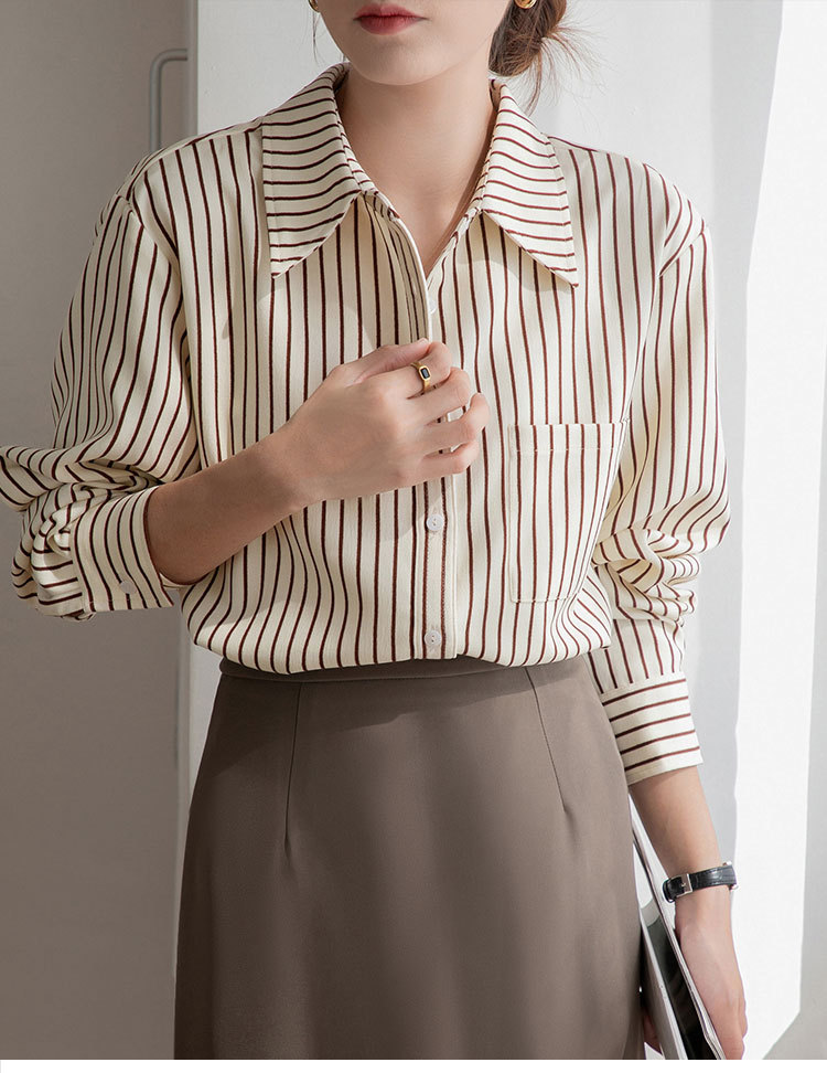 리얼 샷 롱 슬리브 편안한 모든 매치 셔츠 여성용 베이스 셔츠 느슨한 탑 라이트 우아한 통근 심플 인테리어 스트라이프 셔츠