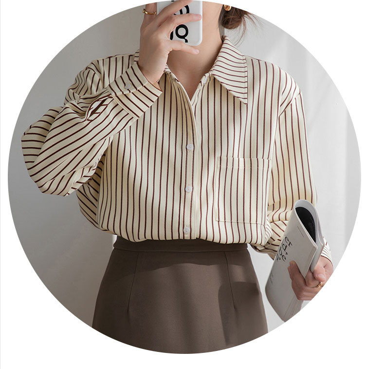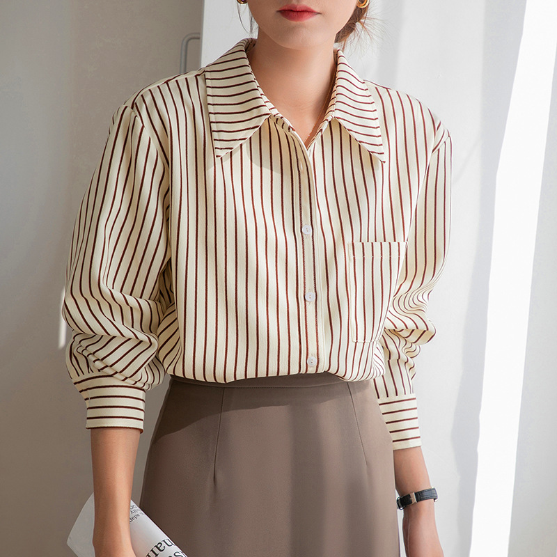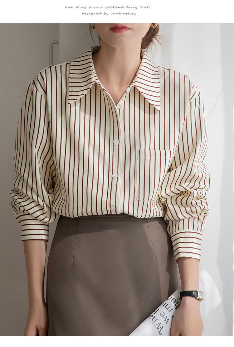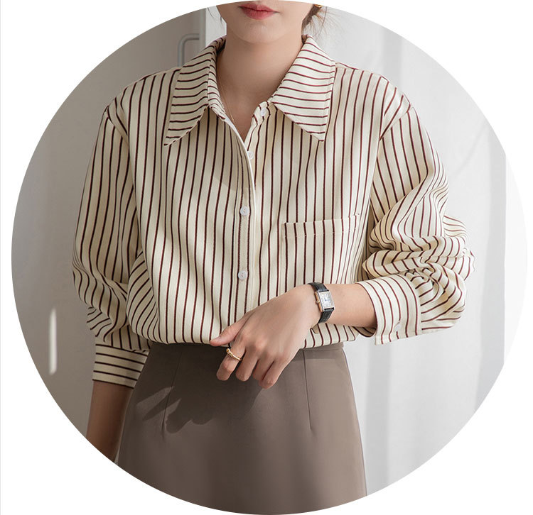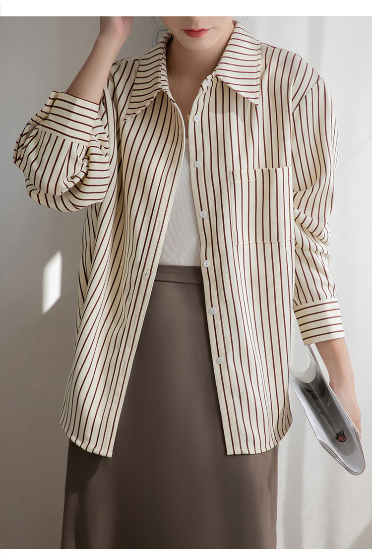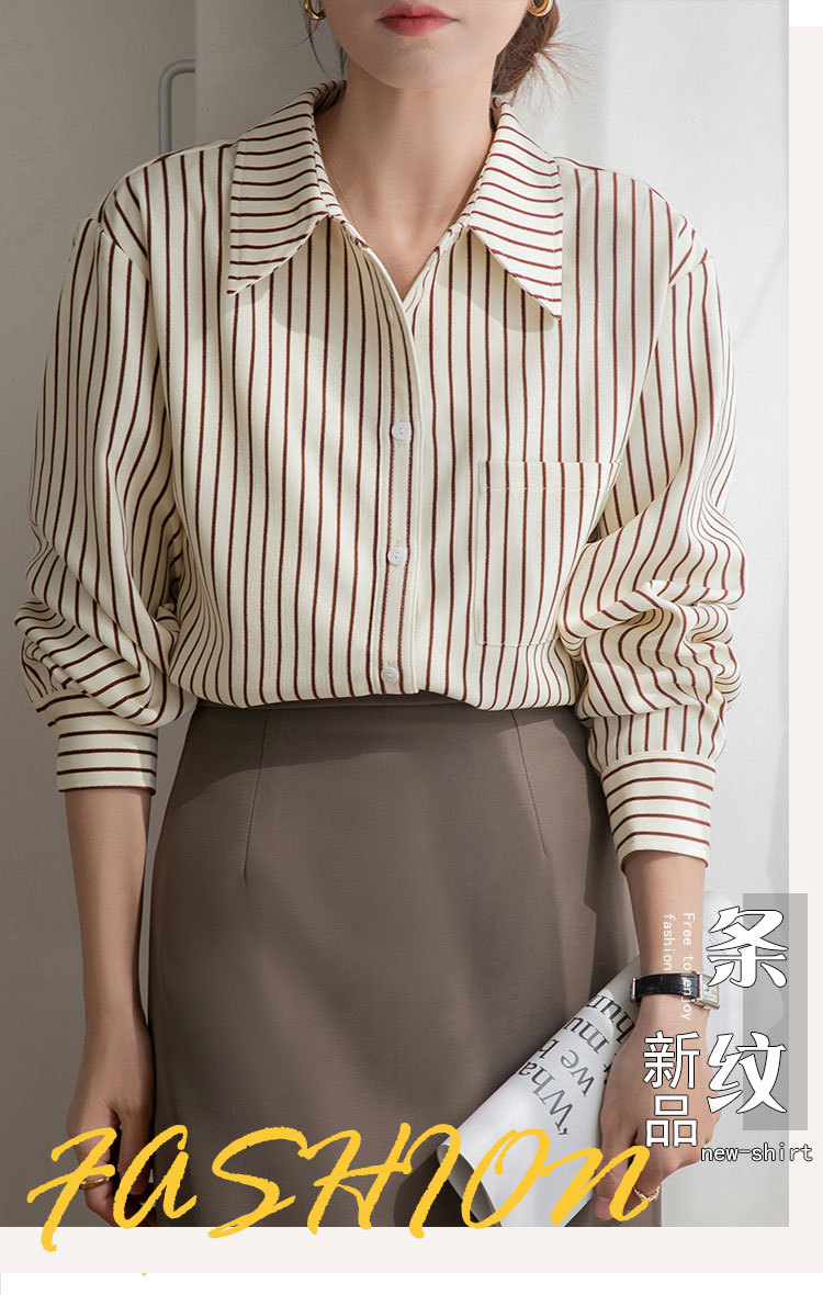 리얼 샷 롱 슬리브 편안한 모든 매치 셔츠 여성용 베이스 셔츠 느슨한 탑 라이트 우아한 통근 심플 인테리어 스트라이프 셔츠스토어 가기