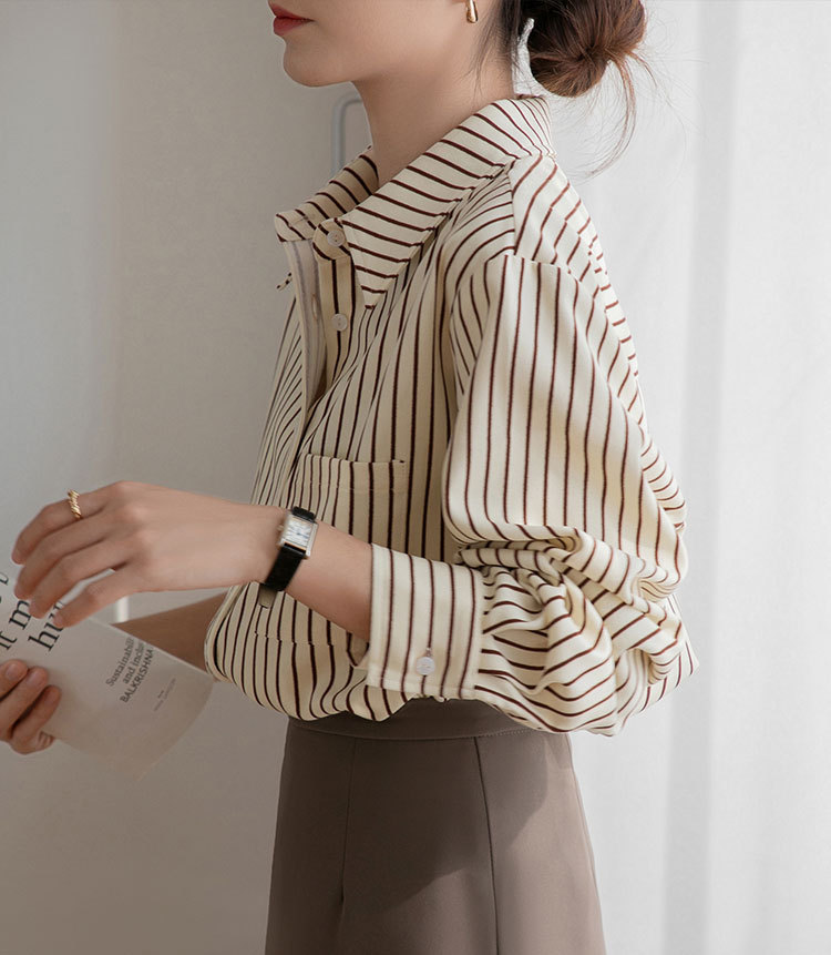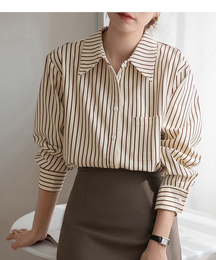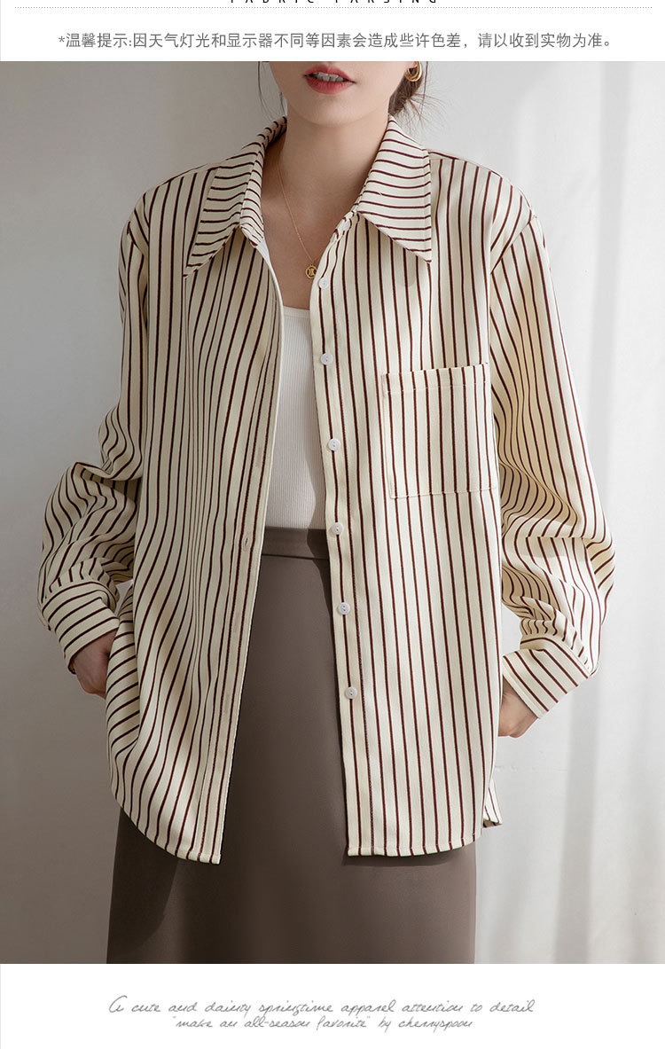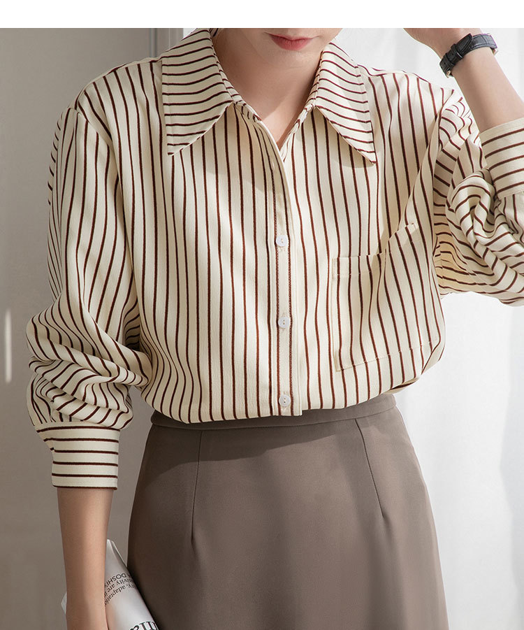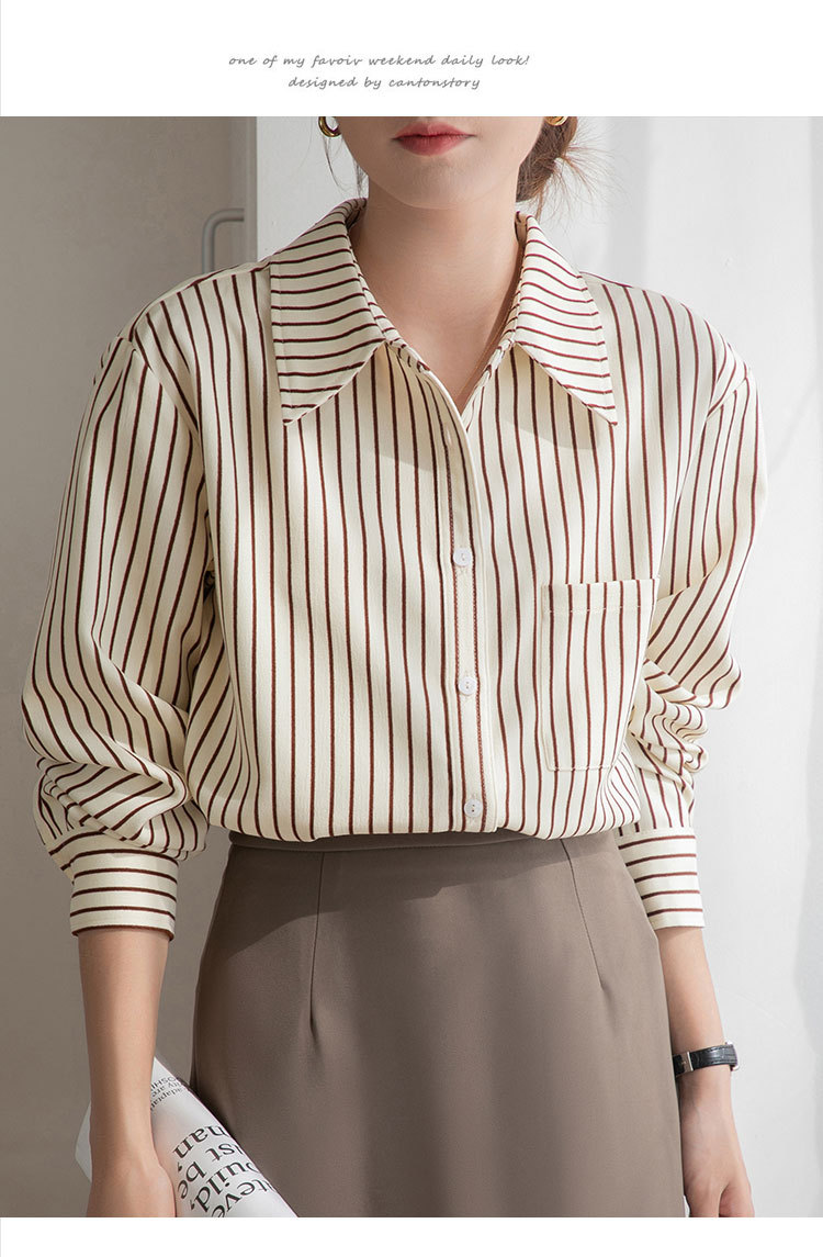 리얼 샷 롱 슬리브 편안한 모든 매치 셔츠 여성용 베이스 셔츠 느슨한 탑 라이트 우아한 통근 심플 인테리어 스트라이프 셔츠스토어 가기