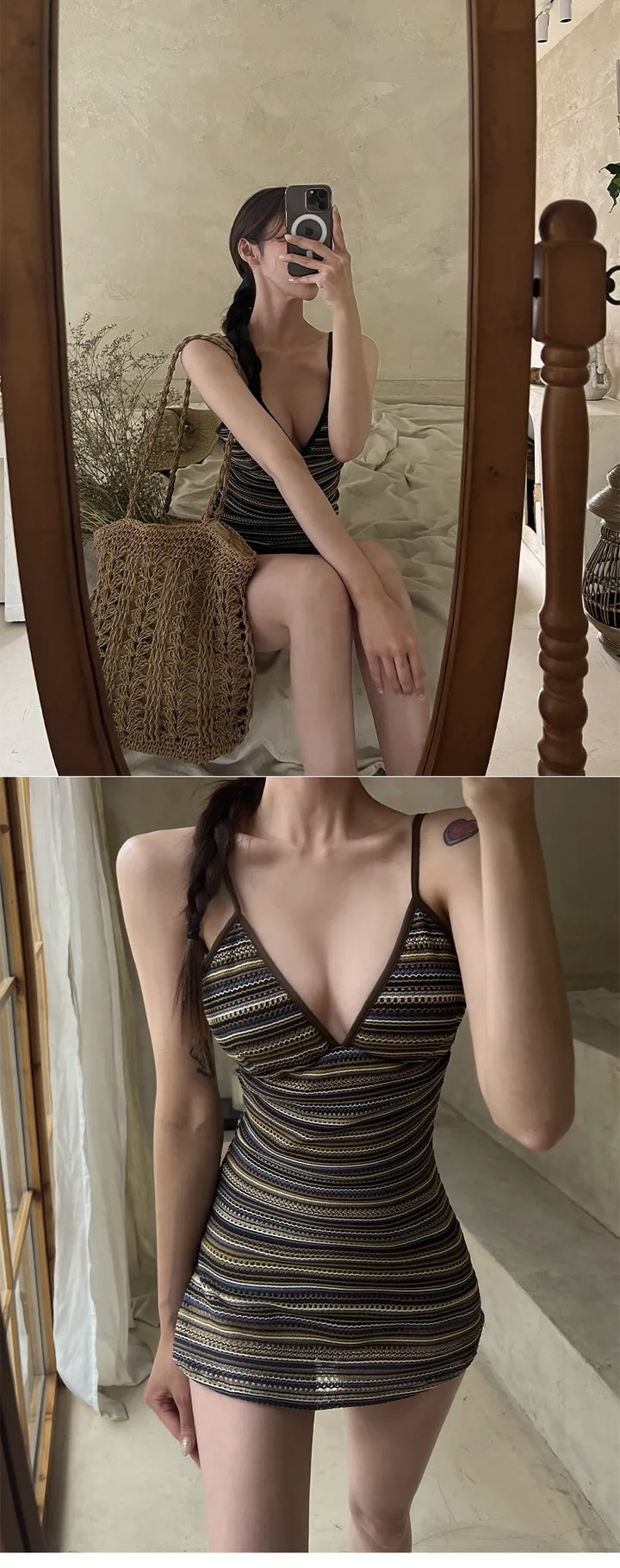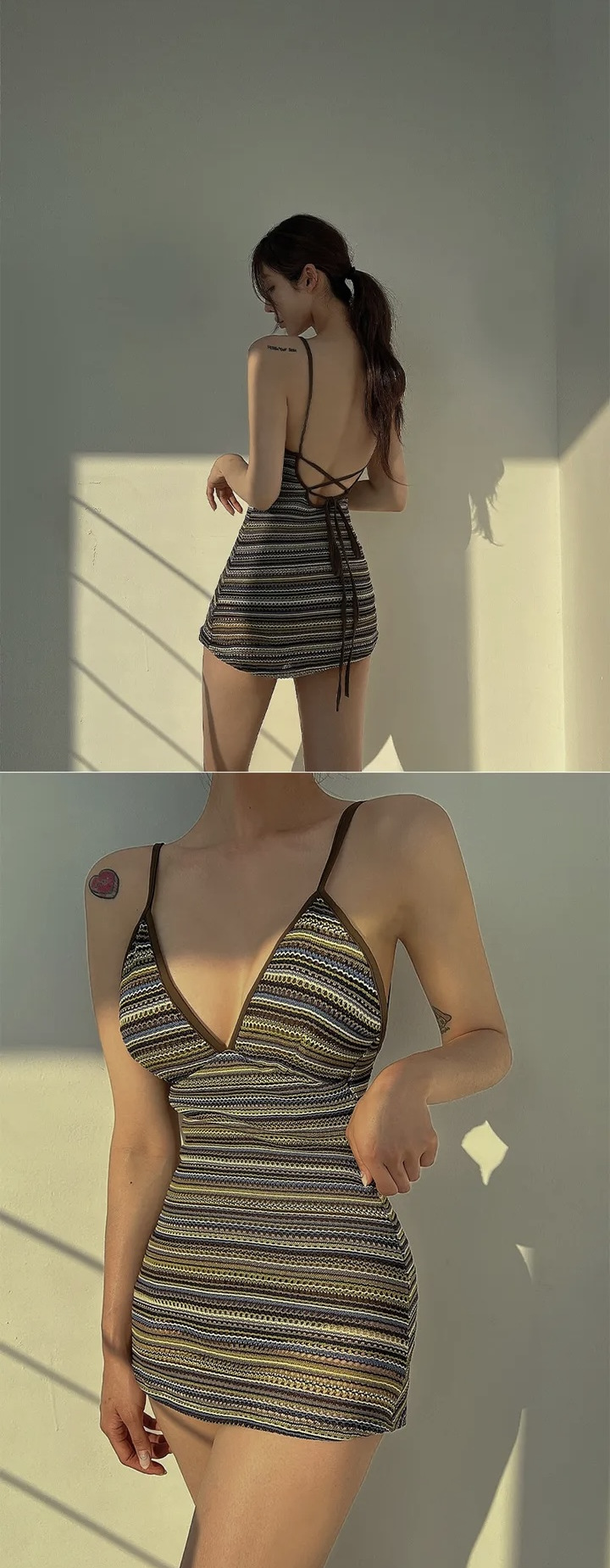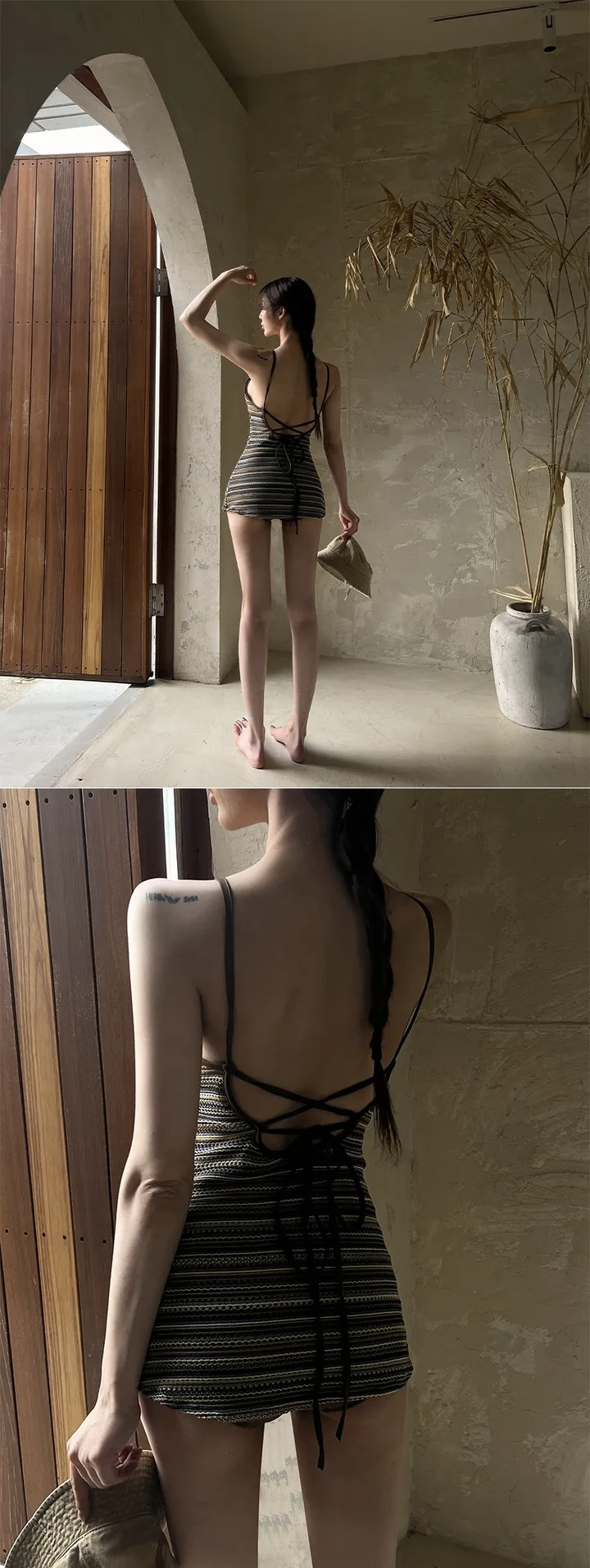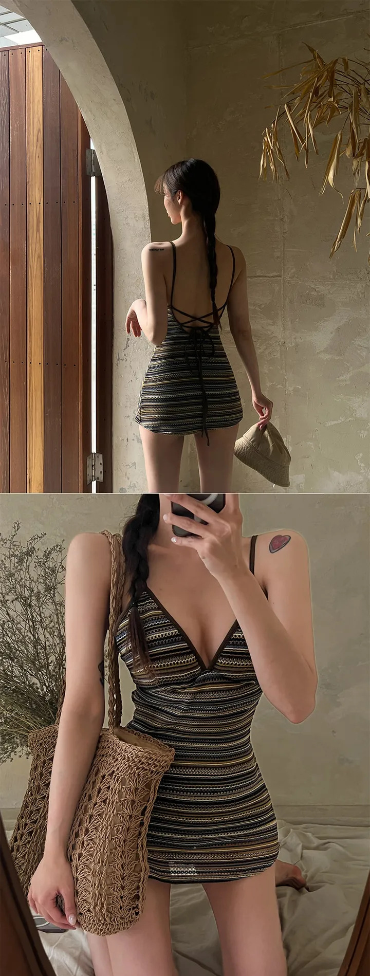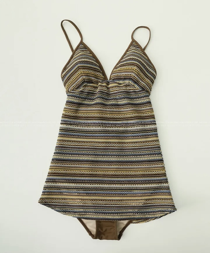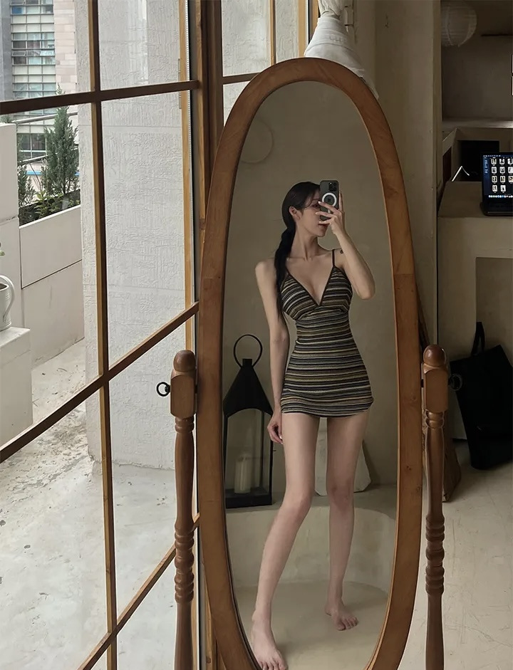 공장 도매 2024 한국 새로운 줄무늬 섹시한 등이없는 보수적 인 배꼽 뒤없는 스커트 원피스 수영복