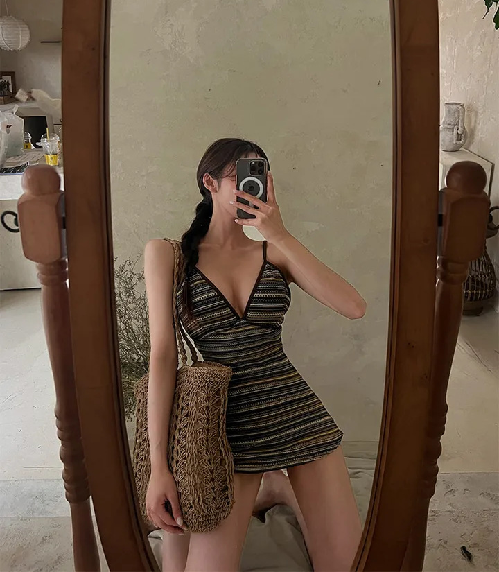 공장 도매 2024 한국 새로운 줄무늬 섹시한 등이없는 보수적 인 배꼽 뒤없는 스커트 원피스 수영복스토어 가기