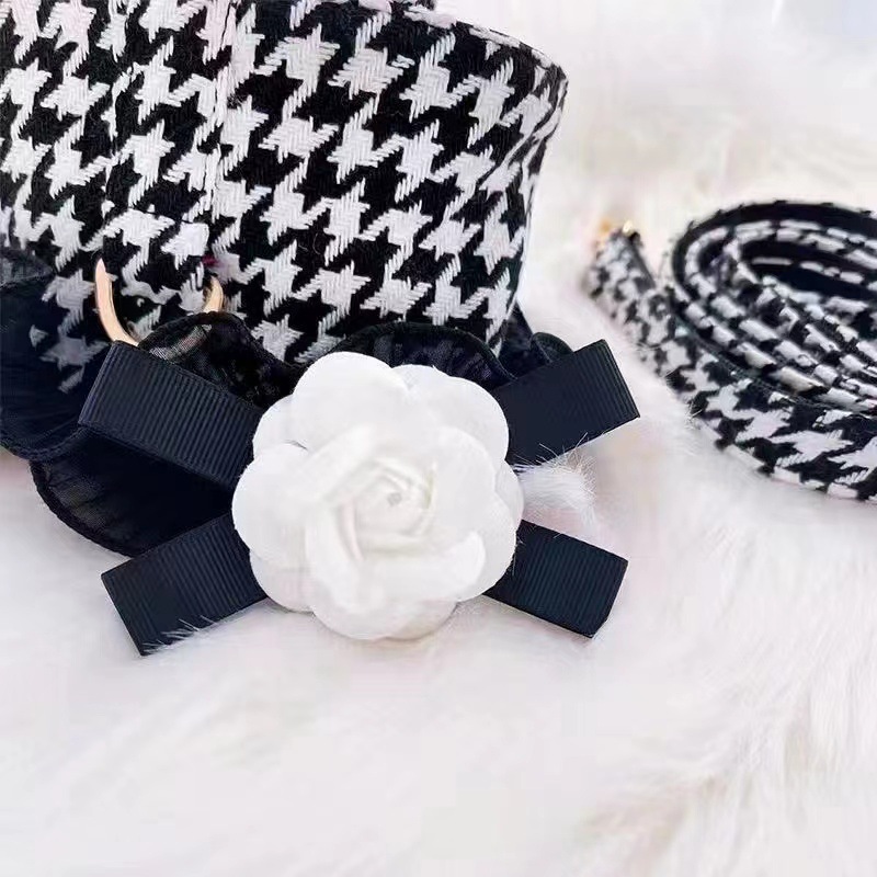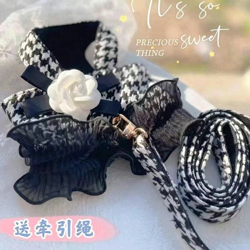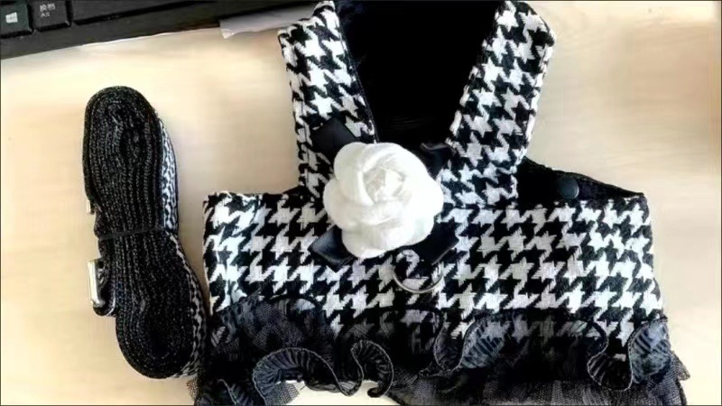 애완 동물 샤넬 스타일 고양이 개 옷 Houndstooth 가슴과 등 견인 로프 밖으로 나가는 테디 베어 산책 개 옷스토어 가기