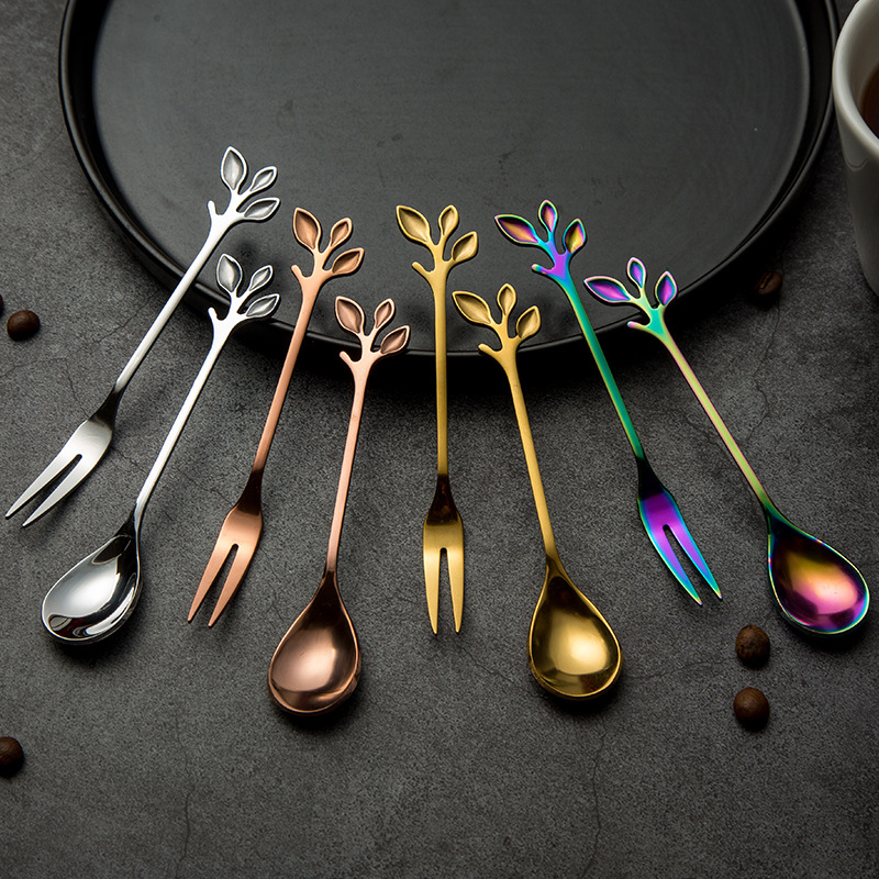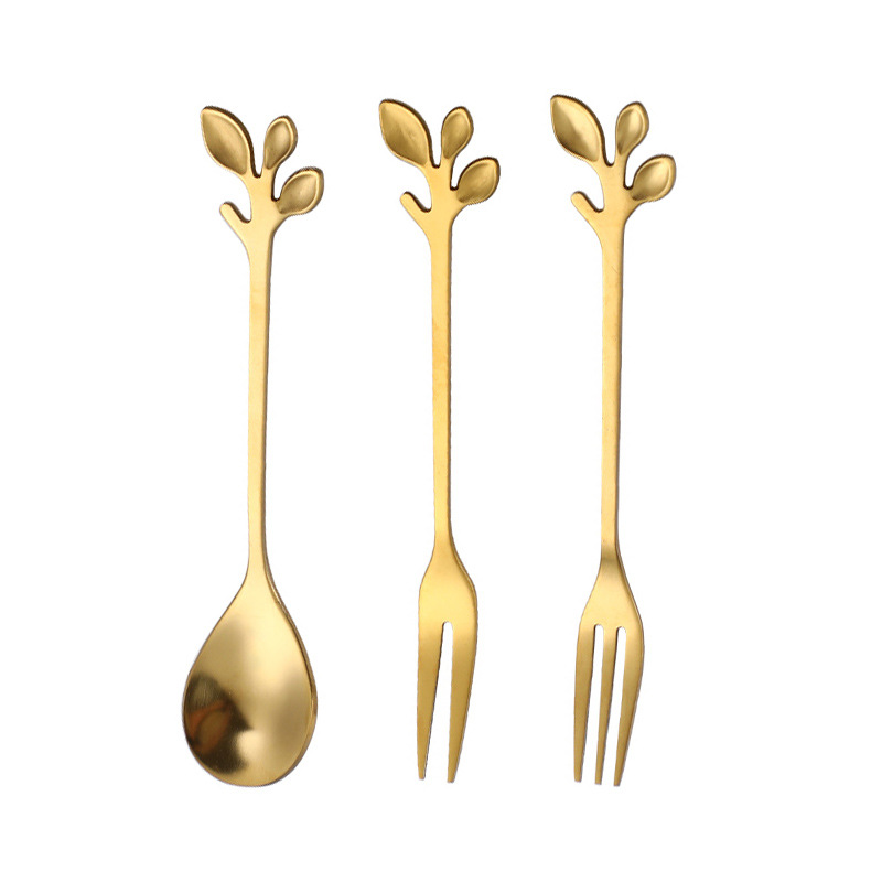 창조적 인 황금 잎 숟가락 작은 커피 숟가락 혼합 숟가락 디저트 숟가락 도매 스테인리스 잎 숟가락 과일 포크
