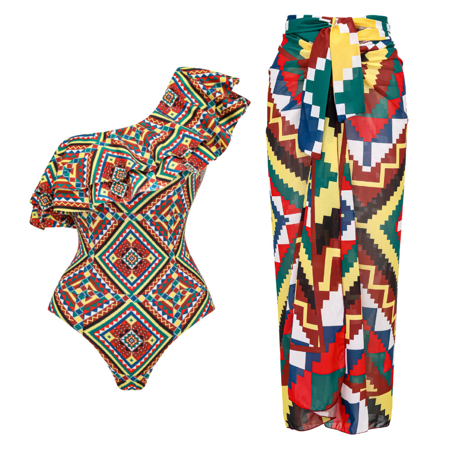 2025现货欧美性感连体泳衣拼色印花两件套涤纶裙热卖爆款泳装套装